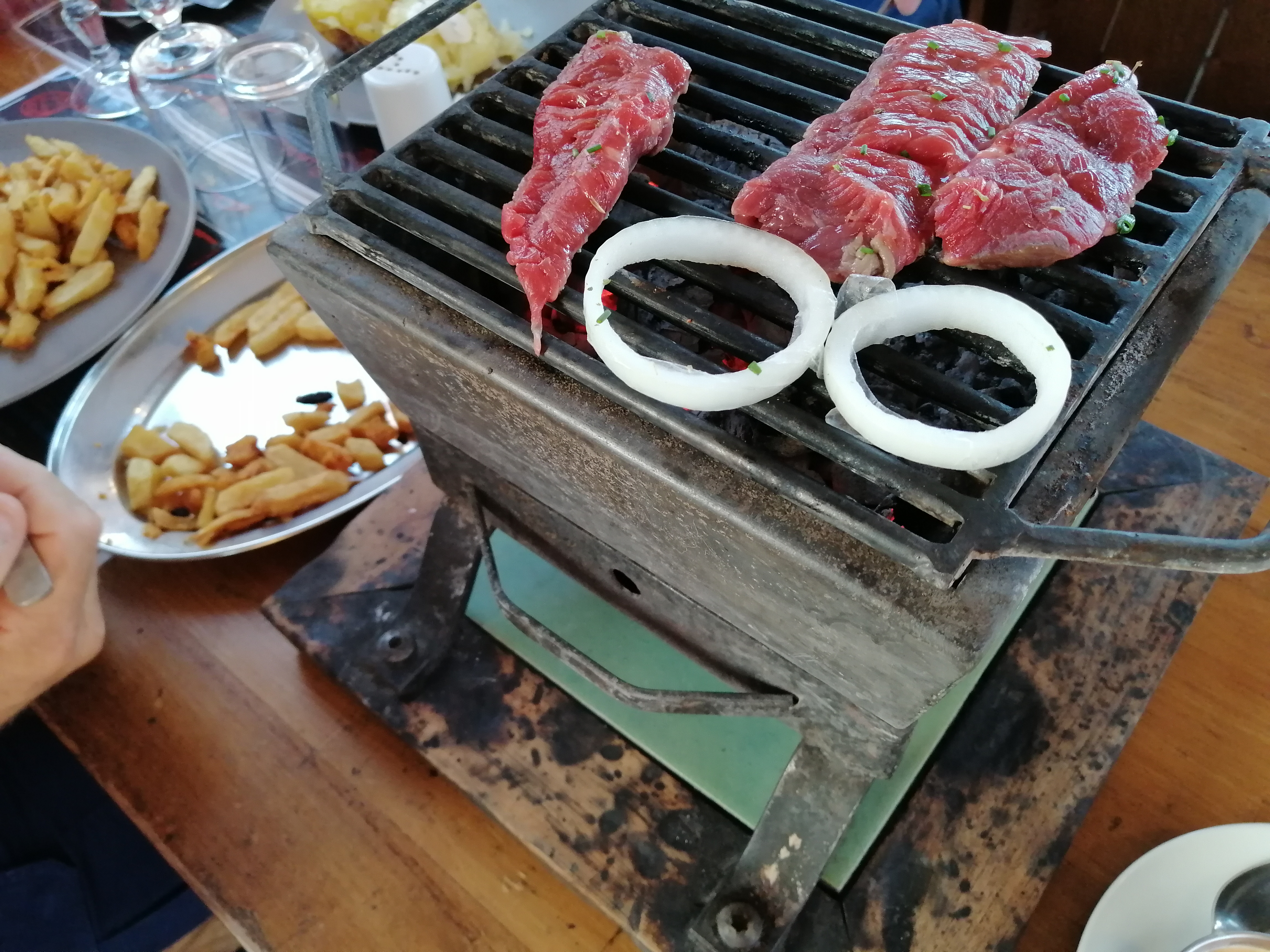 Toutes sortes de viandes braisées ou à cuire à la table. Sur une belle terrasse. Conseil réserver.
