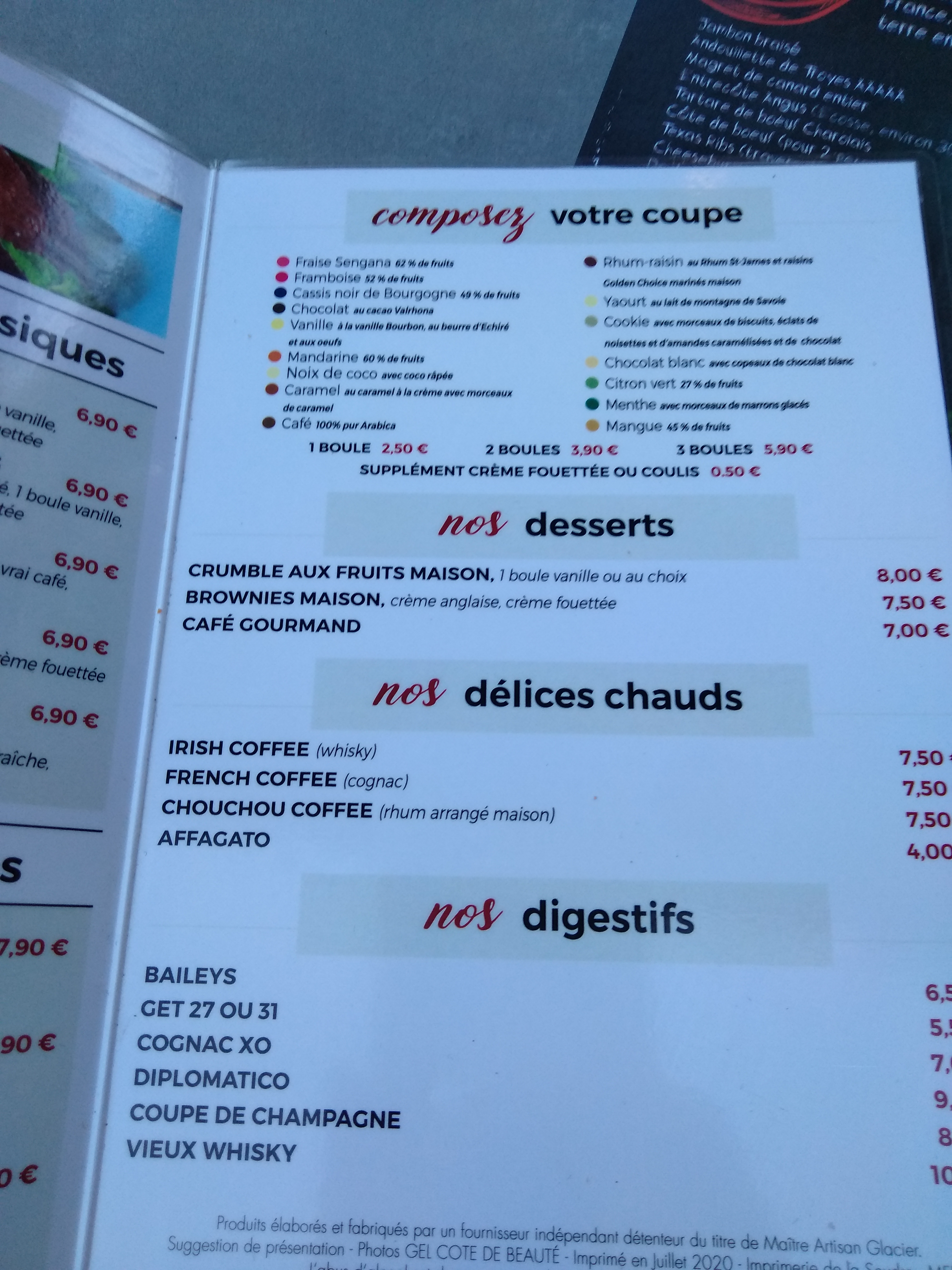 Accueil très agréable de la serveuse , souriante et professionnelle . La viande était tendre et suffisante pour 4 , de même que les frites . Grand choix de glaces et desserts variés avec ce jour là 1 tiramisu mangue , kiwi et coulis de fruits rouges sur crumble citron . Cela fait des années que nous revenons au moins 1 fois pendant les vacances et nous y reviendrons sûrement avant la fin du mois !!!