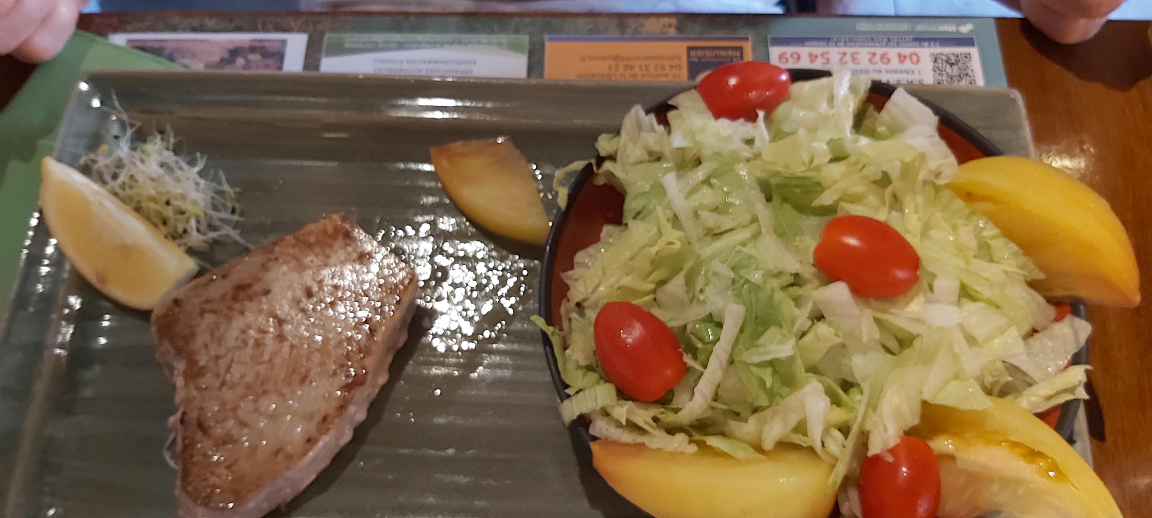 Musique irritante, plat au menu avec accompagnement frite salade ( tartares) , servis sans salade , après demande non il y a pas de salade avec ce plat !! Service très long entre les plats .