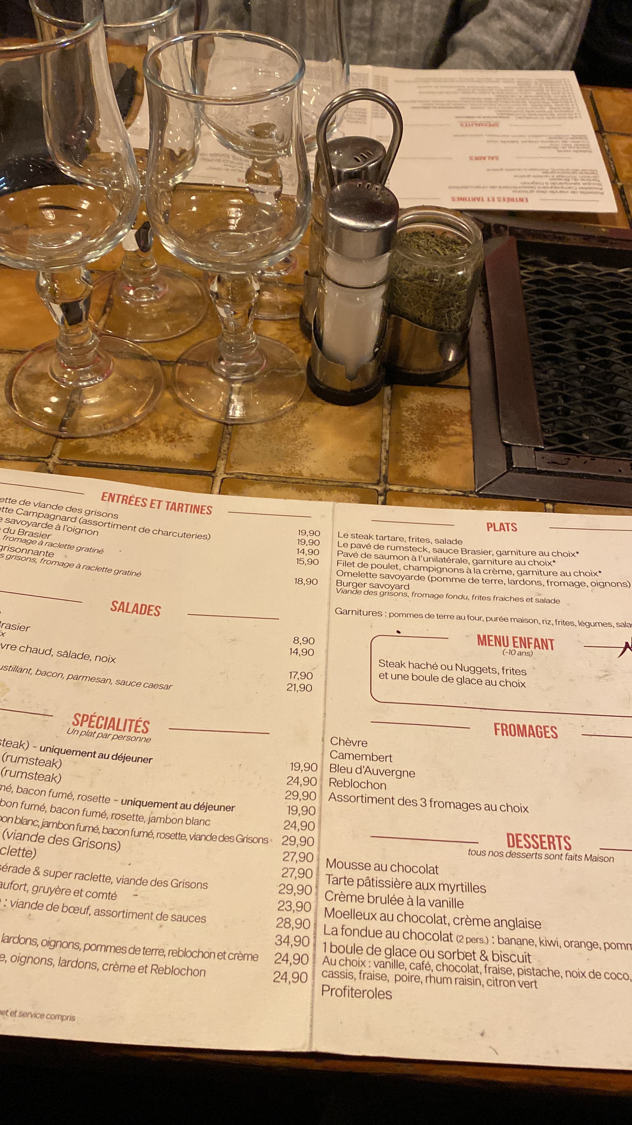 Nous y sommes allées entre collègues nous.avons pris les formules à 14.90 avec plat et dessert et des plats unique avec café et cappuccino viennois Le point fort de ce restaurant se sont ses raclettes, ses tartiflette et ses braserades dans toutes ses tailles Si vous n aimez pas le fromage il y a aussi les plats classiques très bonne ambiance style refuge mais un peu bruyant jolie deco montagnarde et le service impeccable Je recommande