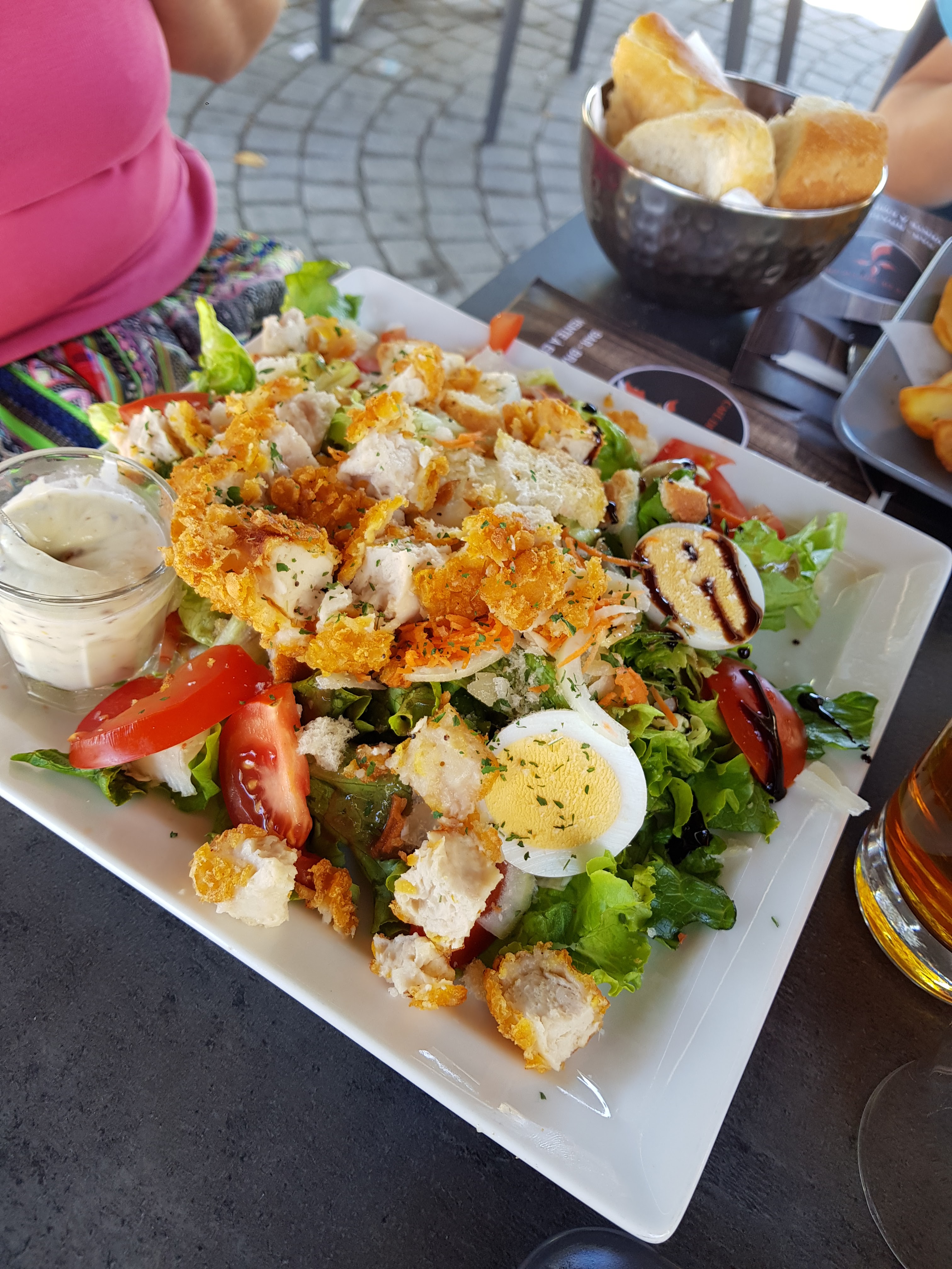 Arrivés en plein boom du midi, ce n’etait pas forcément gagné... Mais un jeune homme souriant et très au l’aise, des salades extras et garnies (le poulet pané au céréales est juste parfait!) et le tour était joué ! Une belle terrasse ensoleillée en prime !