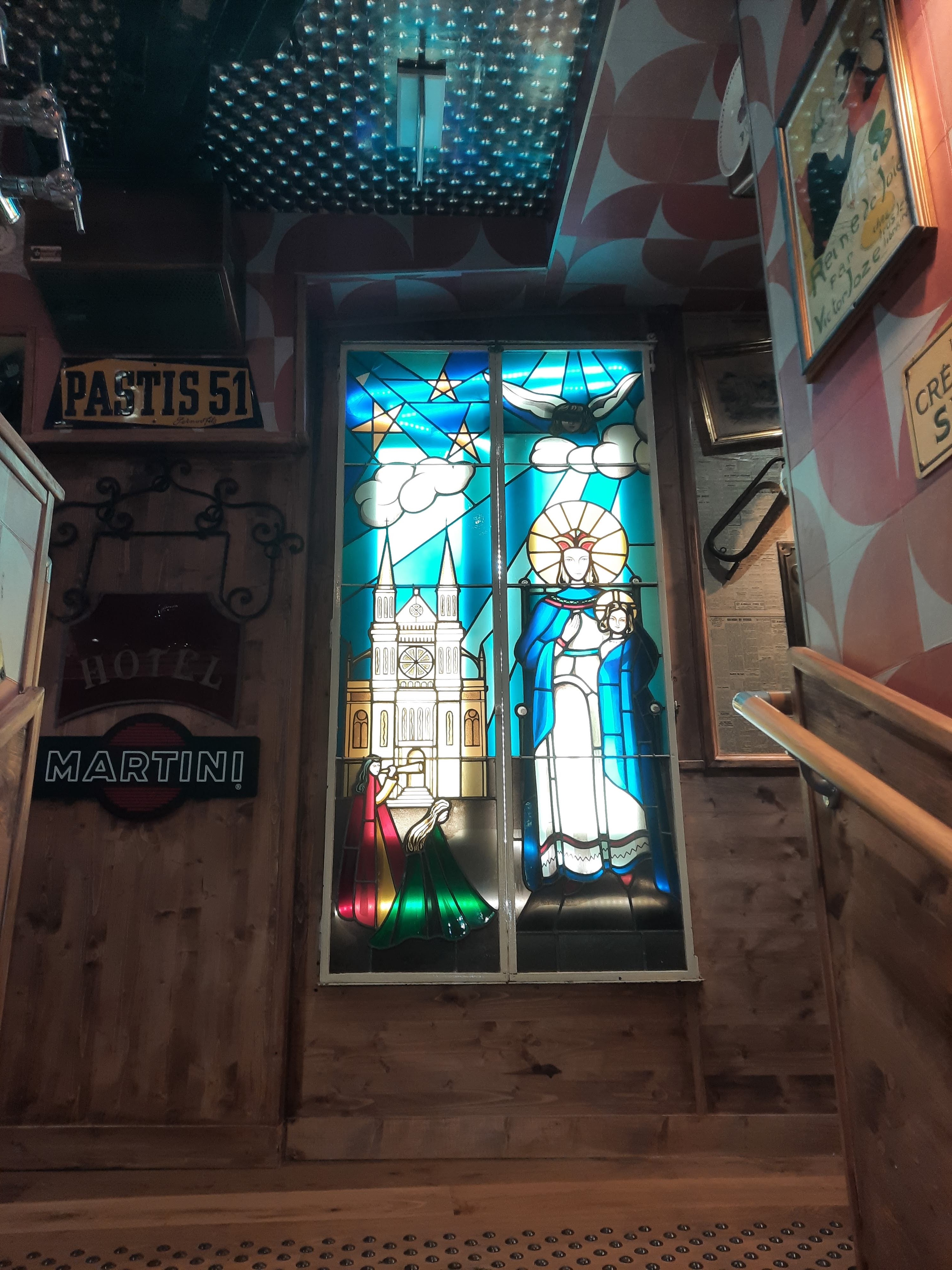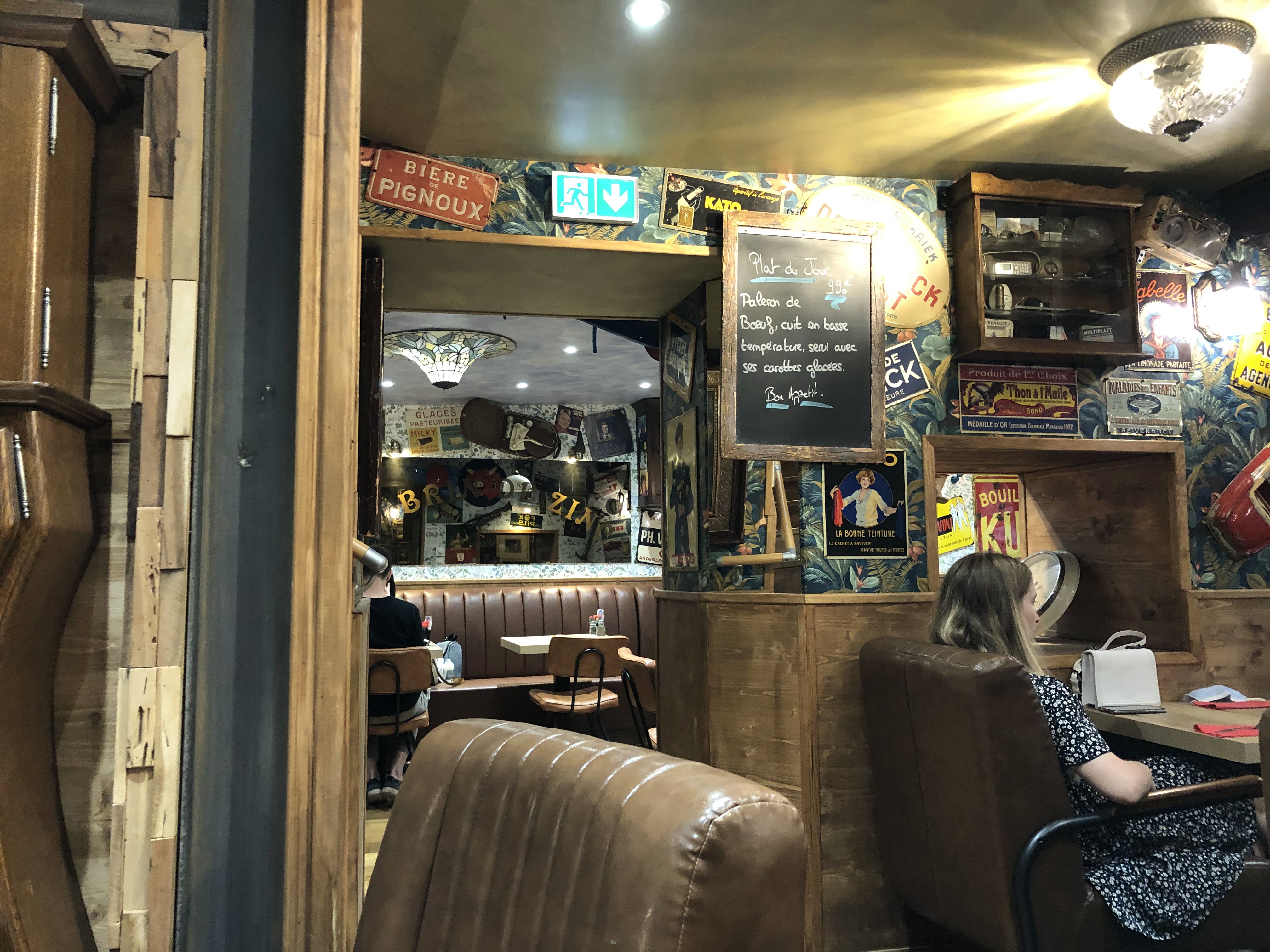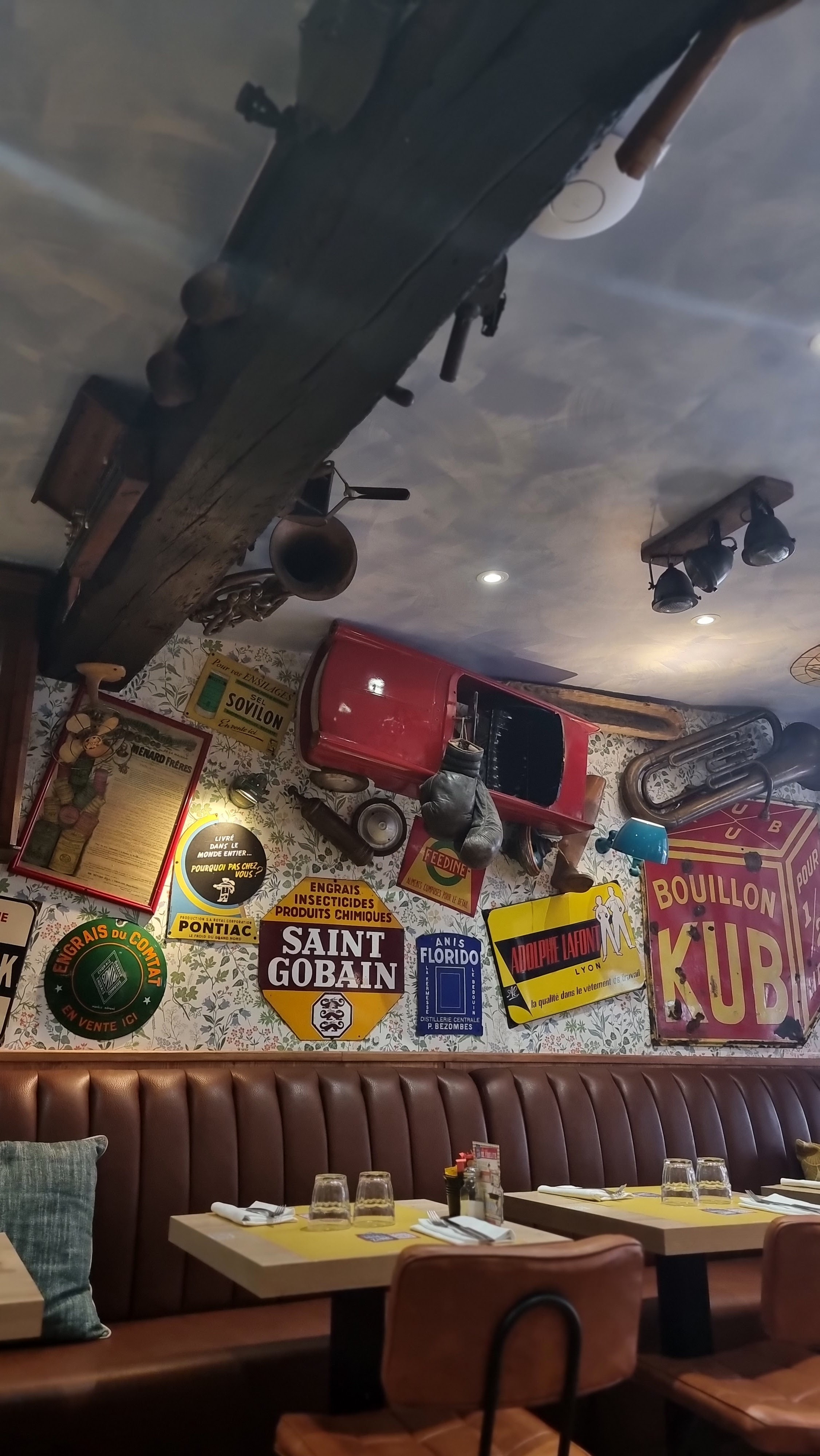La déco est sympa, par contre la musique genre rap ne va pas du tout avec l'ambiance. Côte cuisine ça a été plein de mauvaises surprises, en entrée les escargots étaient immangeables (ammoniaqué), le saumon était très gras et les toasts sortaient clairement du congélateur (traces blanches typiques du pain restait trop longtemps au congel). En plat on a juste testé le canard cocotte, probablement cuit au four sans rien puis mélangé avec le reste dans la cocotte, ce qui donne un canard gras car trop d'huile mais paradoxalement sec à cœur. Pour les desserts c'est très probablement du tout fait avec une crème brûlée servir froide. Bref, c'était pas immonde (à part les escargots) mais pour 33€ le menu on s'attend à de la bien meilleur qualité. En somme on paie pour la déco original mais la qualité de la nourriture et la cohérence globale du restaurant a dû partir au moment du rachat du restaurant par une chaîne.