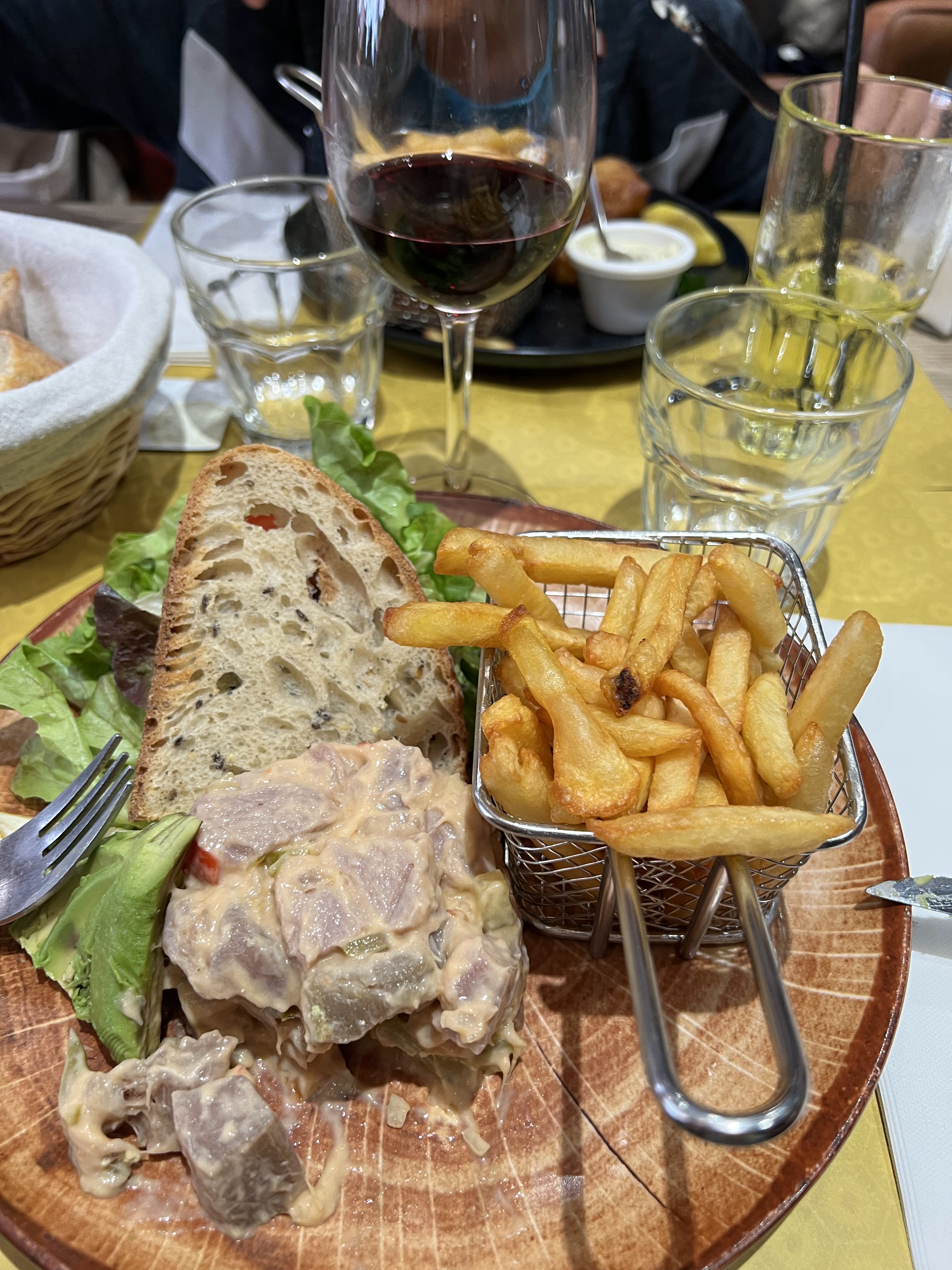Pour un déjeuner du samedi sans réservation. En général, la cuisine est bonne. Le pain est aussi très bon, c'est pas de type pain blanc sans goût 👍👍👍 j'ai préféré mon entrée que mon plat mais les patates sautées au graisse de canard de mon ami était excellentes ! La portion était bien généreuse ❤️ rapport qualité/prix rien à dire. Le service était bien. Avec la surface très large sur 2 étage, je trouve qu'ils sont très professionnels et bien géré pour tout. Je recommande bien.