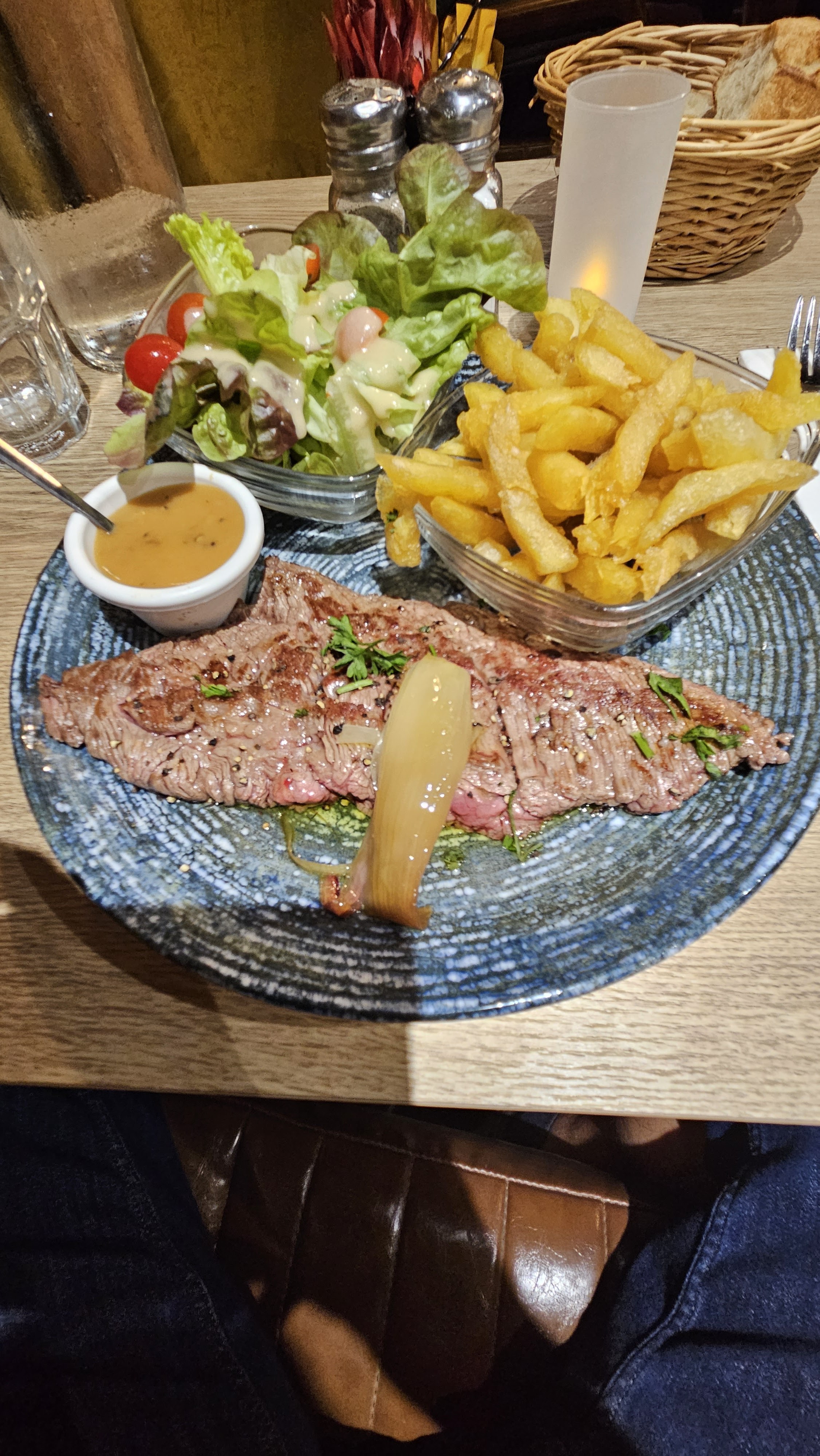 Repas servi un peu trop vite. Pas le temps de déguster l'apéro Et vraiment dommage qu'il n'y ait pas de frites fraîches pour accompagner la très bonne viande Bon repas malgré tout et belle décoration du resto