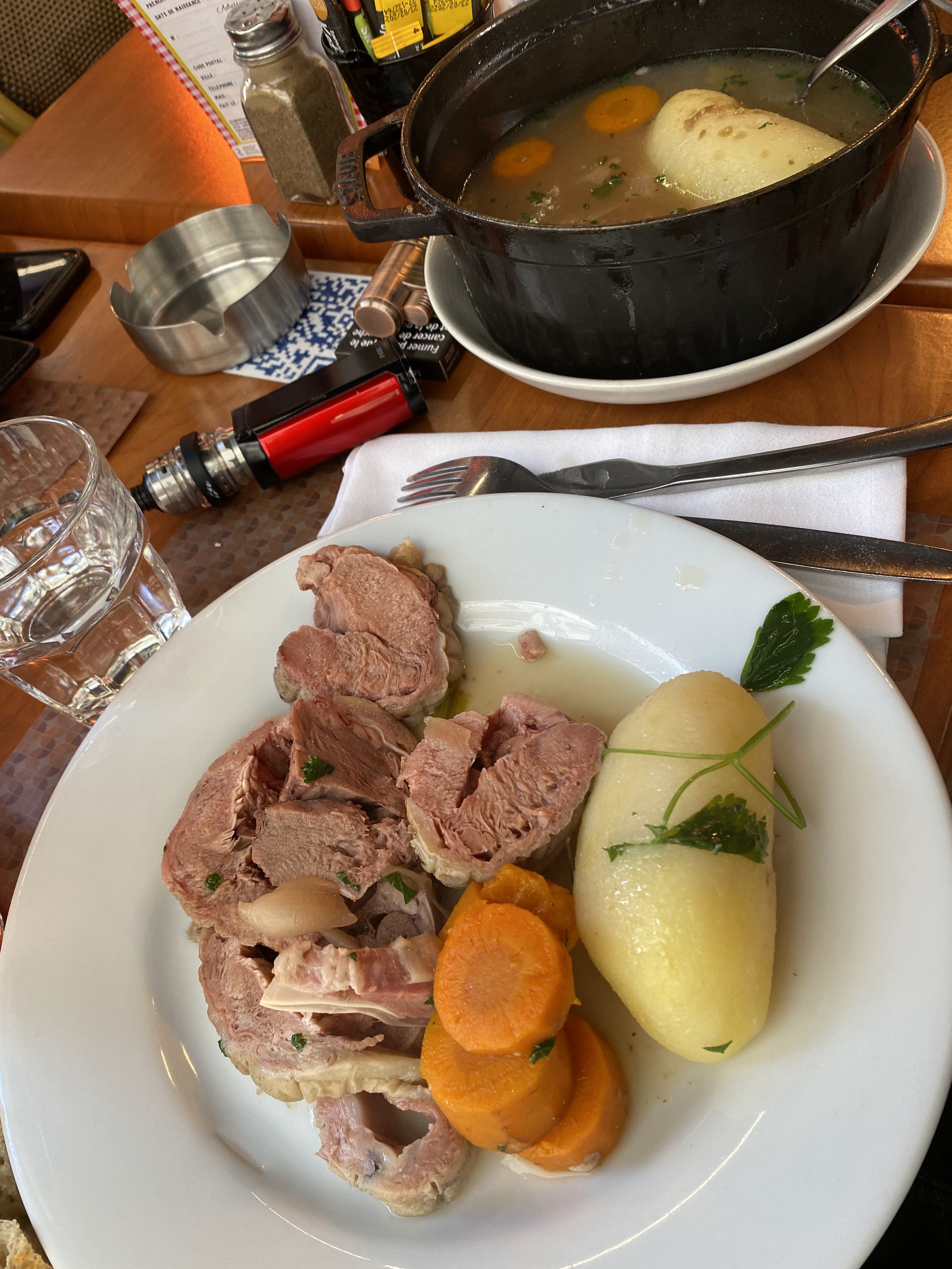 Nous avons déjeuné dans ce restaurant et nous avons commandé le canard confit, le poulet en cocotte, les moules bleu marinière et la tête de veau. La tête de veau était un peu grasse et ne correspondait pas à mes goûts, mais tout le reste était très bon. Nous avons particulièrement apprécié que le restaurant ait préparé à l'avance du papier à dessin et des crayons de couleur pour notre bébé. expérience très agréable.