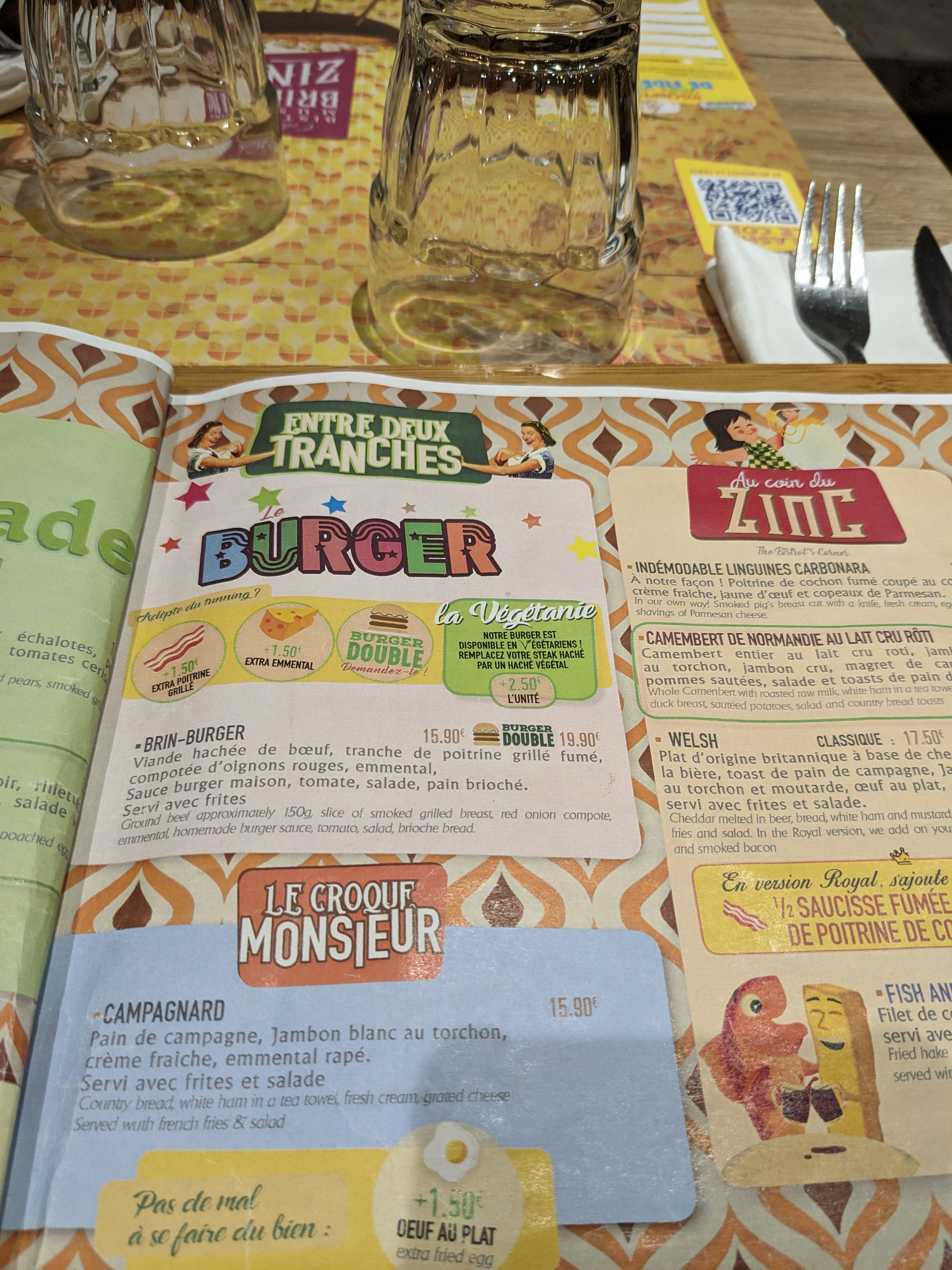 Expérience juste géniale. Le brin de zinc est facile à trouver et est super bien situé au centre d’Orléans vu la proximité avec la place Martroi. La façade est identifiable de suite et le décor hétéroclite est des plus divertissant et amusant. Sympa et très agréable en terrasse; mais tout autant à l’intérieur. Bonne lecture! Outre les peintures et la déco vintage et colorée, prenez le temps de lire les petits mots laissés par les clients sur les murs et de vous faire prendre en photo à côté du cochon! Le service est ultra rapide et efficace, sans surcharge, de bon ton et avec bonne pointe d’humour et tous sont dynamiques et sympatiques. Bonne gestion. Ça tourne vite et bien. Le menu est très varié des apéros aux desserts. Déja rien qu’avec la carte style retro, on a faim. Le choix à la carte est grand et je pense que TOUT est fait maison. Tout ce qu’on a choisi l’était et en plus était cuisiné avec de bon produits. Les cocktails sont généreux. Les entrés et les plats sont copieux, voir bien copieux selon les appetits. Le camembert roti, le welch, les burgers sont gastronomiques. Une grande diversité de choix et de bonnes idées qu’on soit seul ou a plusieurs. Toutes les assiettes que nous avons vu passer étaient très appétissantes et gourmandes, tout en étant bien équilibrées nutritionellement parlant. Il y a beaucoup de soins apportés aux petits détails qui rendent l’expérience juste géniale. Merci à l’équipe en Cuisine. Quand à la carte des desserts, même si en grande partie classique, elle met l’eau à la bouche. Comme le reste ona envie de tout essayer. Le baba au rhum est à tomber; la mousse chocolat maison avec son chocolat fondu à coté et le Paris Brest sont des tueries pantagrueliques (voire photos). On en reste bouche bée devant la taille. Doggi bag possible, moi j’ai pas pu finir. Summum: le prix est à la hauteur des produits sans être excessif. Un pur régal du début à la fin. Une super expérience et un bon moment qu’on va refaire pour tester le reste de la carte. Ne manquez pas d’aller au WC, outre l’escalier tarabiscoté, ça permet de voir le décor des étages à l’image du reste de l’établissement. Suivez les peintures des gens qui courent!