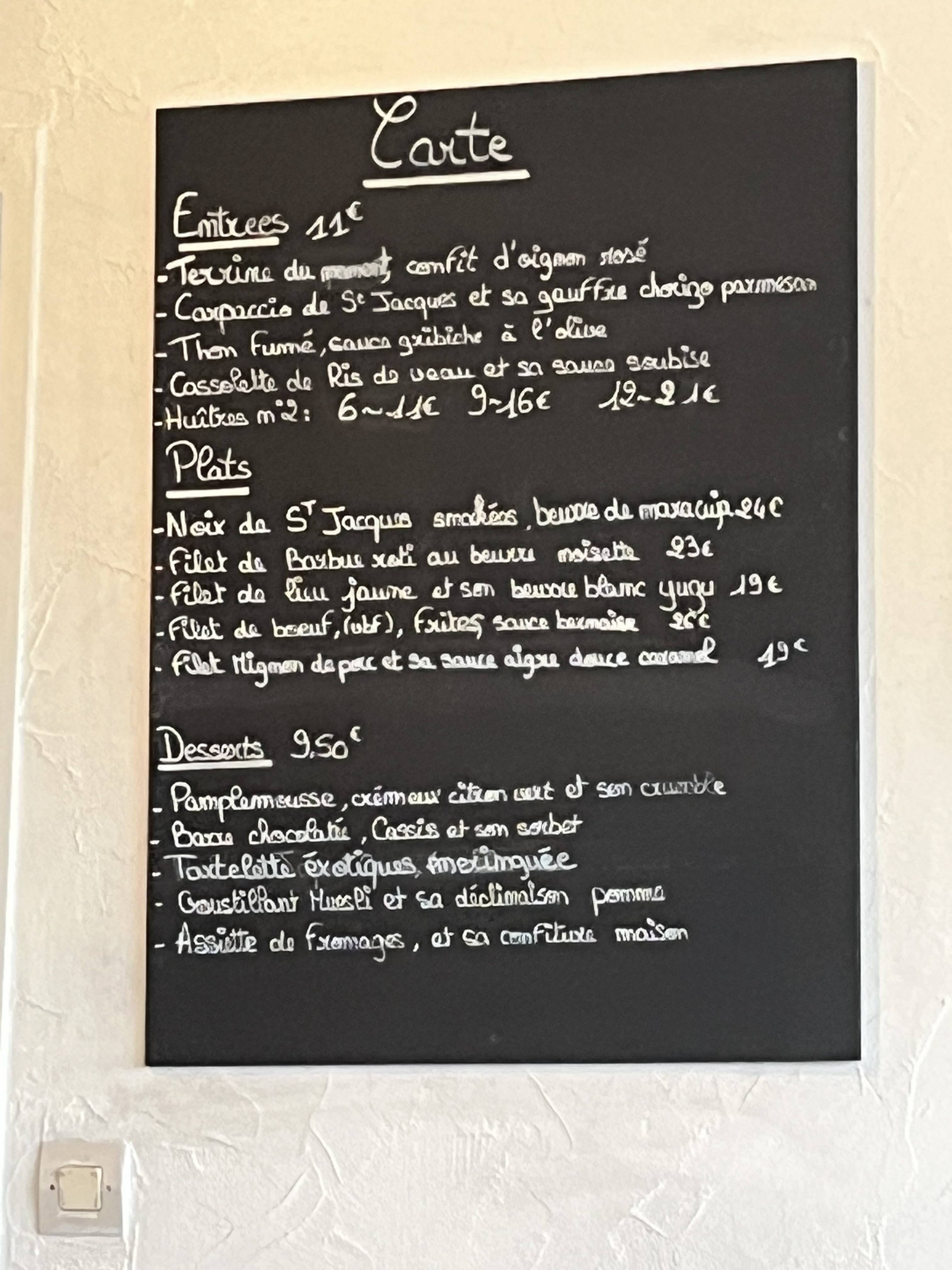 Nous avons pris le menu du jour( à 23,50€ le soir) et nous nous sommes régalés. Entrée et plat de poisson, tous deux excellents. Dessert à base de fraises: un régal! Pensez à réserver quelques jours avant.