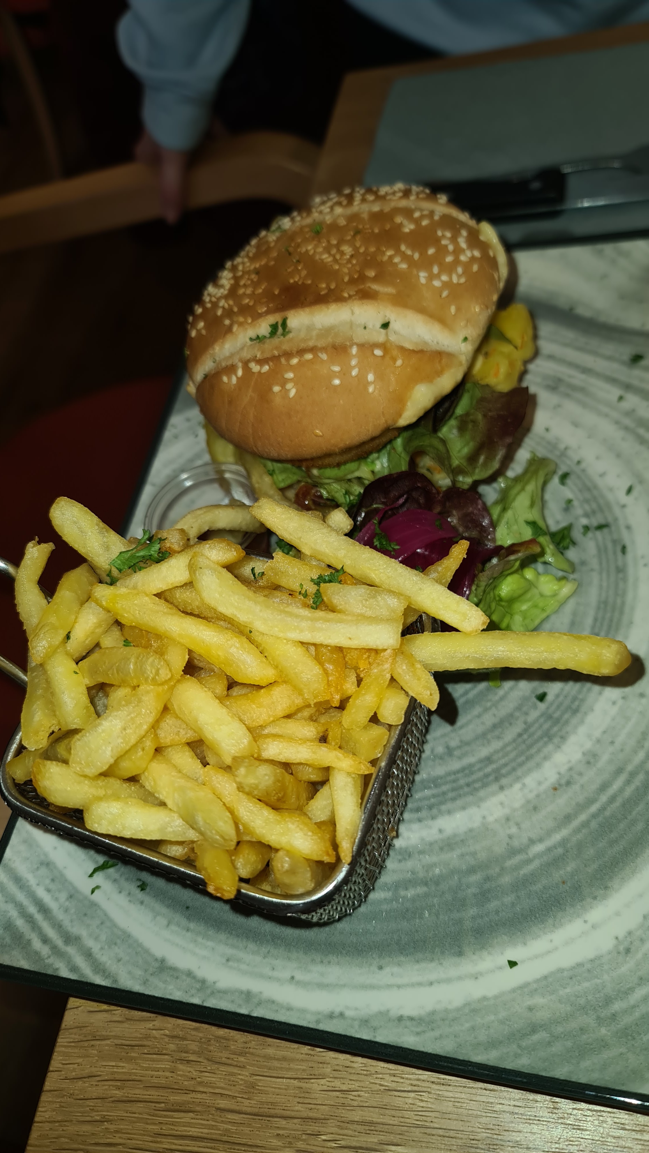 Burger végétarien pas très recherché avec une galette de pommes de terre (en plus des frites), tomate et salade... (pourrait être fait avec une galette de légumes ou steak de soja et accompagnés d'oignons et d'un autre légume par exemple) Attente longue pour être installés.
