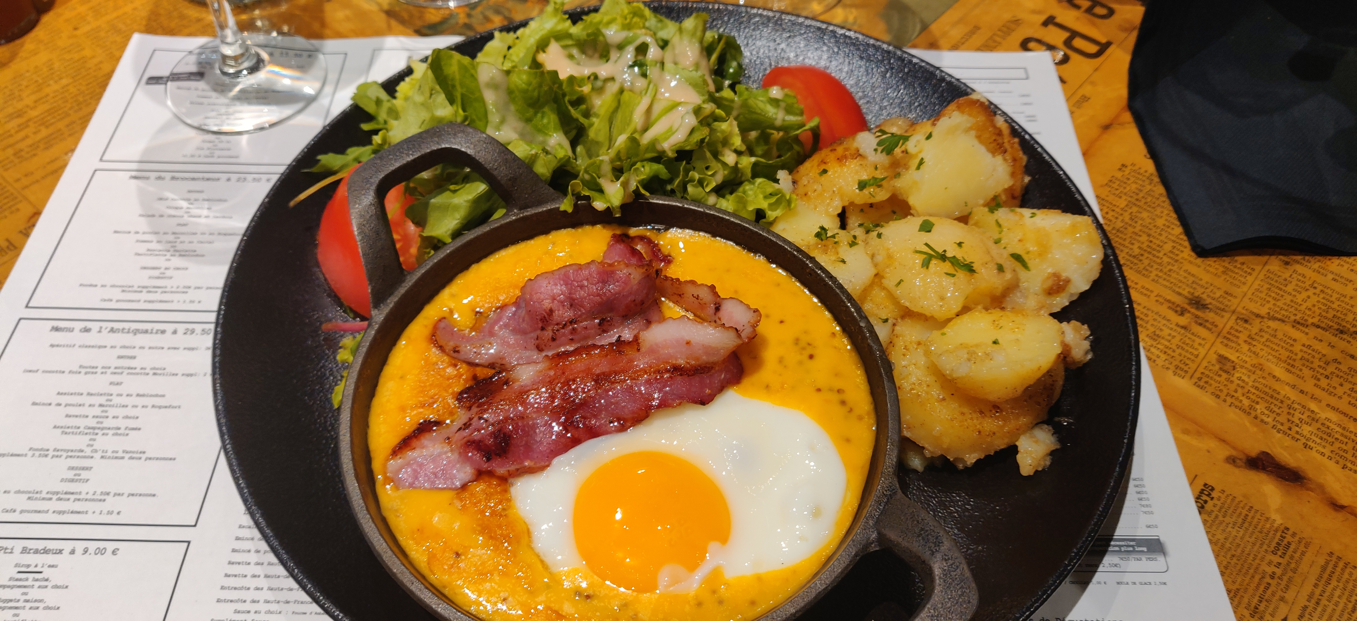 Un bon moment où nous avons bien (trop) mangé. Un menu de l’antiquaire pour moi avec œuf cocotte foie gras (un poil trop fromageux), une assiette campagnarde fumée (très copieuse), et une crêpe sucré. Autant dire que je n’ai pas tout mangé et heureusement qu’on a pu avoir un doggybag :) Mon conjoint a pris un croque franche comté puis le burger du moment (chèvre miel). Burger un pool sec mais sinon très bons. Un bon rapport qualité prix.