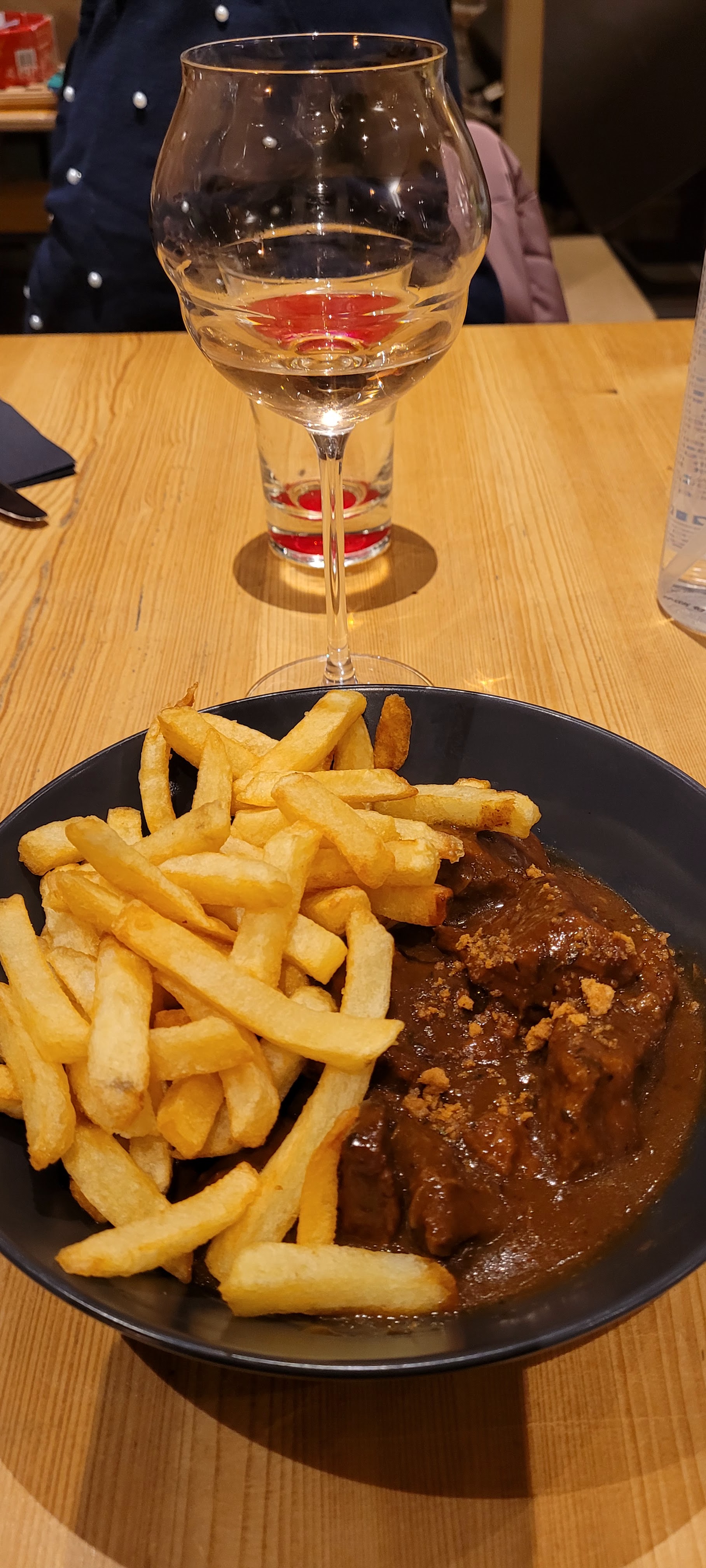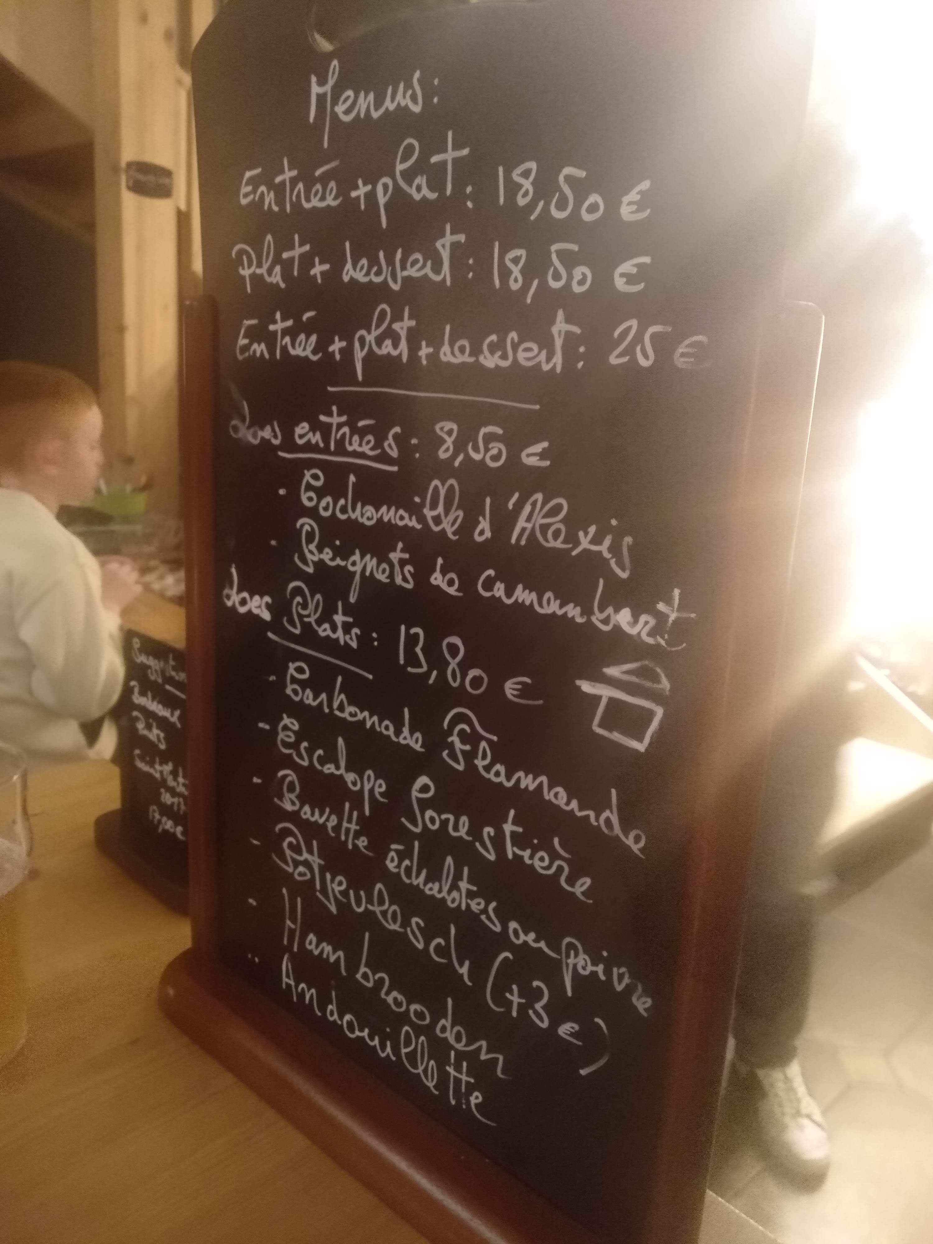 Bon accueil. 2 menus à 22.90€ + 2 boissons= 67€, ça fait cher du Schweppes. Jambonneau beaucoup trop salé servi avec des frites surgelées (dommage). Carbonnade (Bonne) servie aussi avec des frites mais en portion enfant (terminée en 3 bouchées). Déçue.