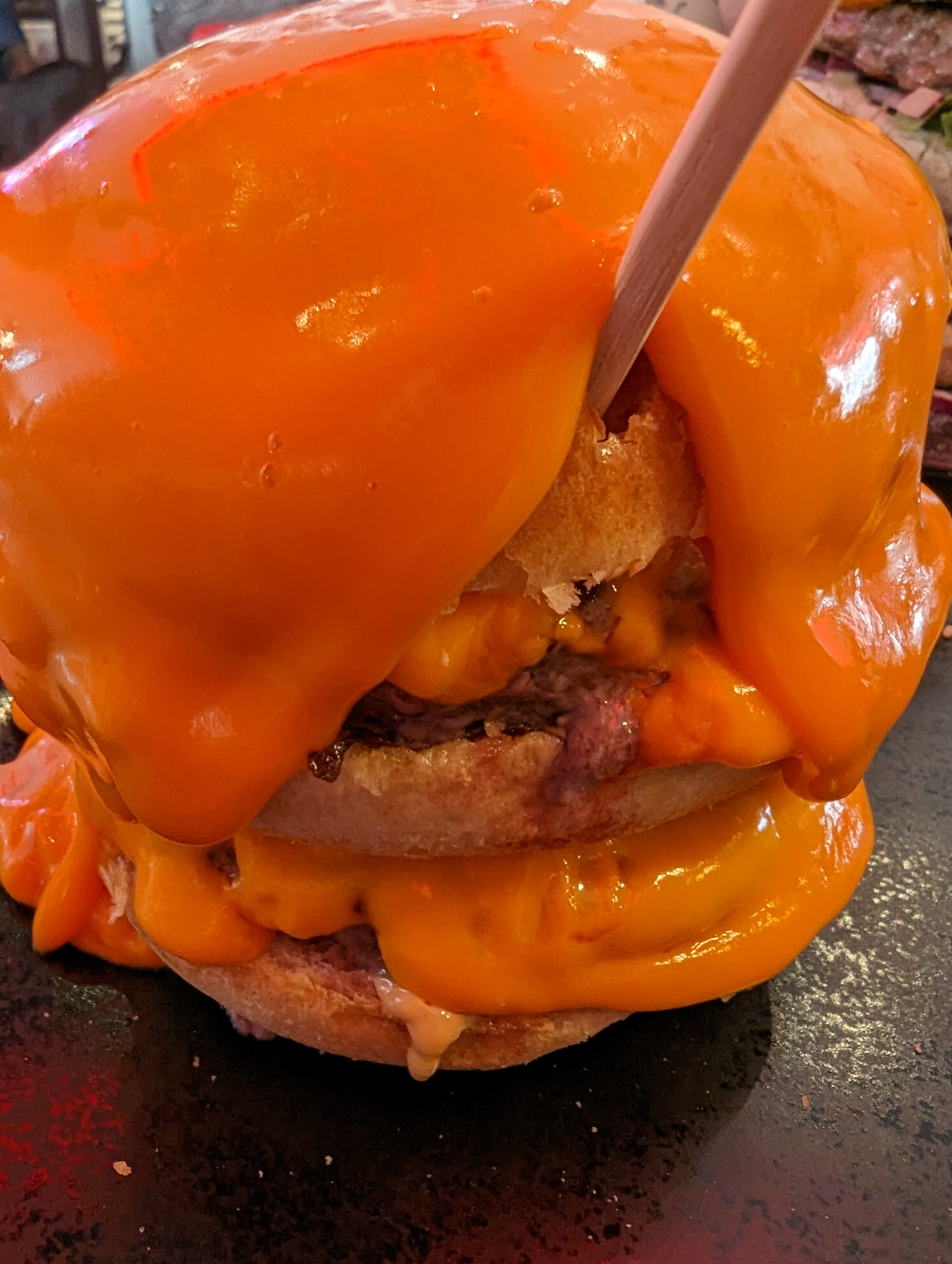 On est arrivé avec beaucoup d'appétit et notre gourmandise habituelle et on était parti pour prendre chacun un burger en taille triple. Heureusement, le serveur a eu la bonne idée de nous expliquer comment étaient fait leurs burgers (tout fait maison et viande de la boucherie d'à côté) et nous a plutôt conseillé la taille double... Et il a bien fait, la taille double est un mastodonte ! Je n'ose même pas imaginer à quoi ressemblait le triple ! Une excellente découverte et des produits vraiment bons !