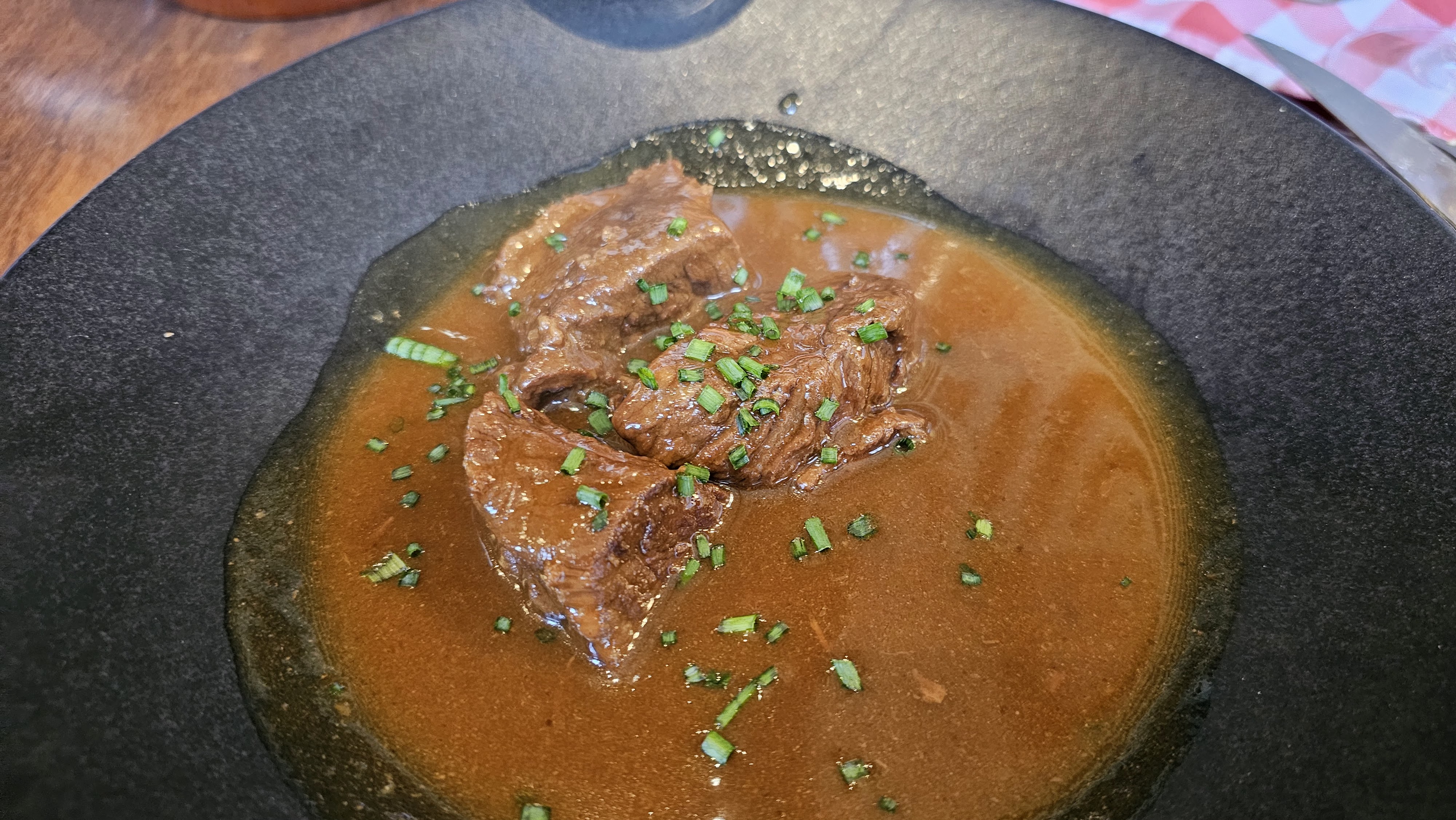 Cuisine régionale typique, riche en fromage et en viande. Le service était malheureusement inattentif et indifférent. Les végétariens et les végétaliens n’ont absolument pas de chance. La côte de bœuf était moelleuse et fine. Le jarret d'agneau était bon. Le grand bol de frites était bon sur le dessus mais détrempé à mi-chemin. Sélection de vins limitée mais raisonnable. Le seul point positif est qu'il est ouvert le lundi. Si vous êtes en ville un autre jour, vous avez de meilleures options.