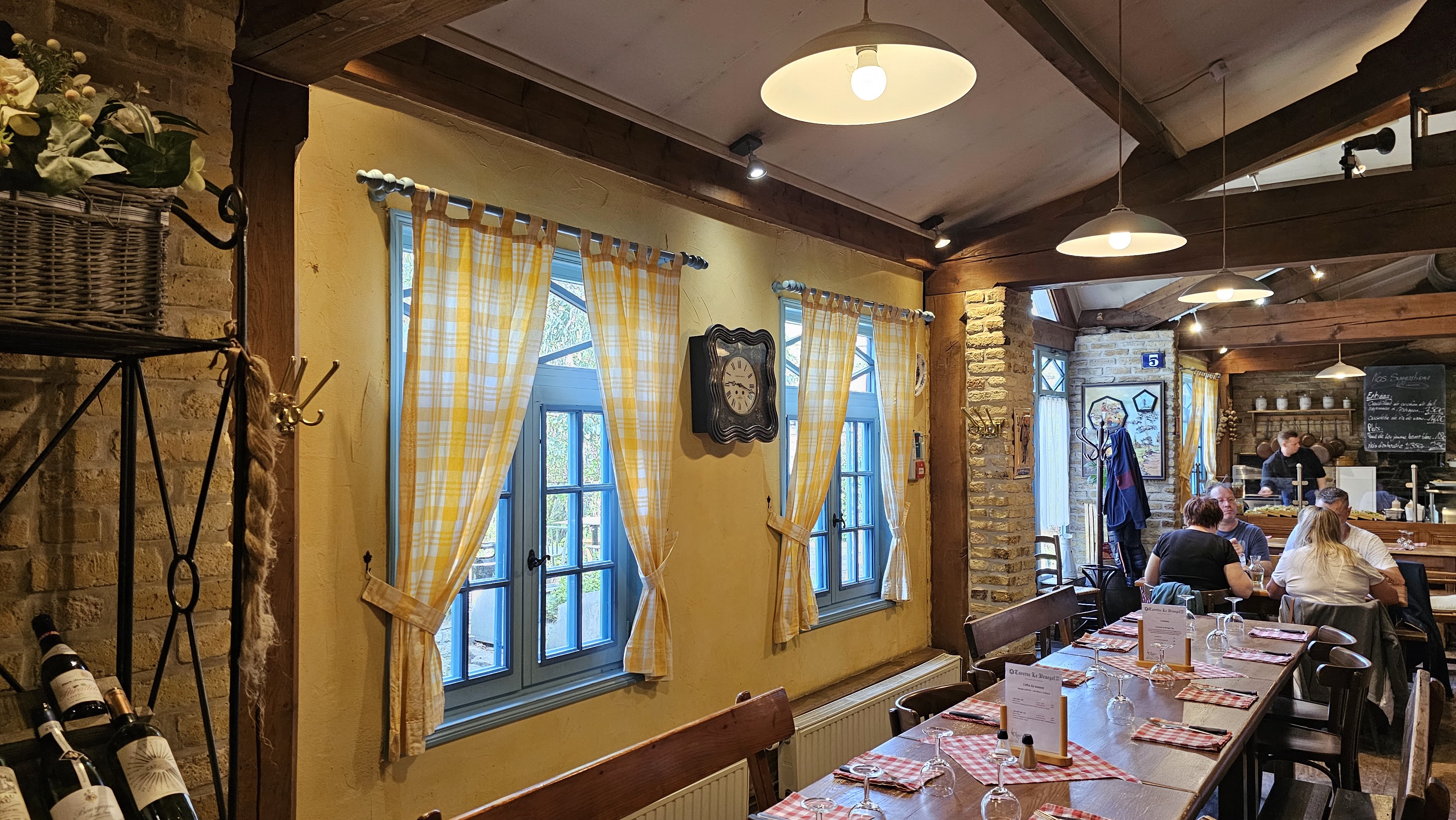 Le cadre est magnifique, le mot est faible. Réservation obligatoire, plusieurs jours à l'avance voire au-delà d'une semaine si vous visez un samedi (on a dû revoir notre programme et venir un vendredi midi). La cuisine est très bonne ! Plats réconfortants et bien servis; à choisir donc en fonction de votre appétit. Si vous êtes un petit mangeur qui veut en profiter, visez plutôt une croquette de Maroilles qu'un welsh en entrée pour profiter du voyage (doggy bag accepté et mis dans un contenant adapté, mais bon... c'est pas trop la culture...). Carbonnades flamandes extra (le plat est destiné à un goût d'adulte donc à éviter en plat enfant car on sent l'excellent retour d'une cuisson à la bière). Rapport qualité-prix impossible à trouver en Belgique (entrée - plat - dessert à 25€ et vin correct en 50 cl à moins de 10€). Service décontracté et sympa. Jeux pour enfants près du bar (sont les bienvenus). Les deux petites salles et la grande avec son feu ouvert permettent une bonne répartition du monde et du bruit. Ce resto a presque 2000 avis dithyrambiques les gars donc n'hésitez pas trop si vous êtes à Bergues pour vous faire plaisir à prix raisonnable. Vous avez trouvé !