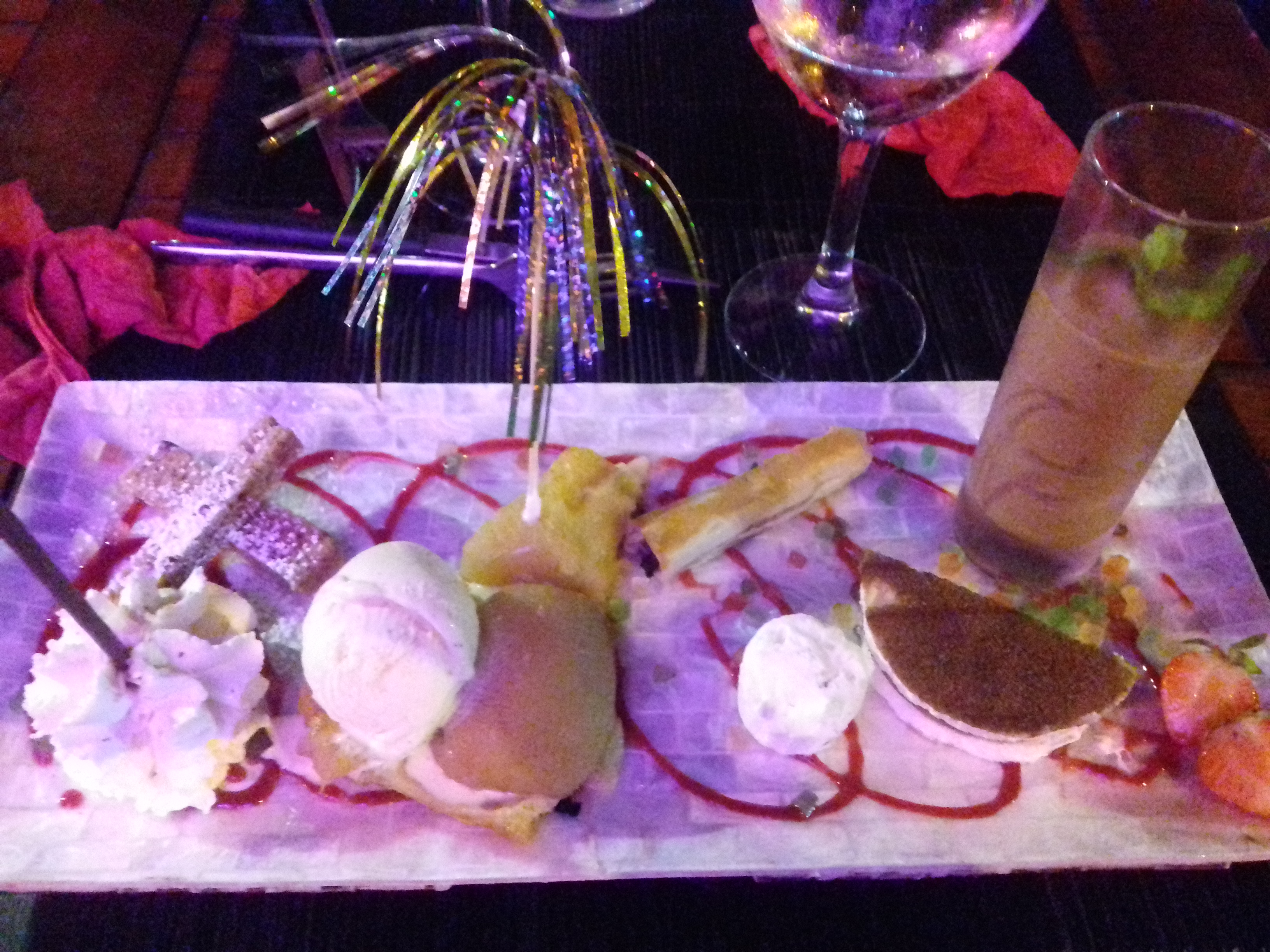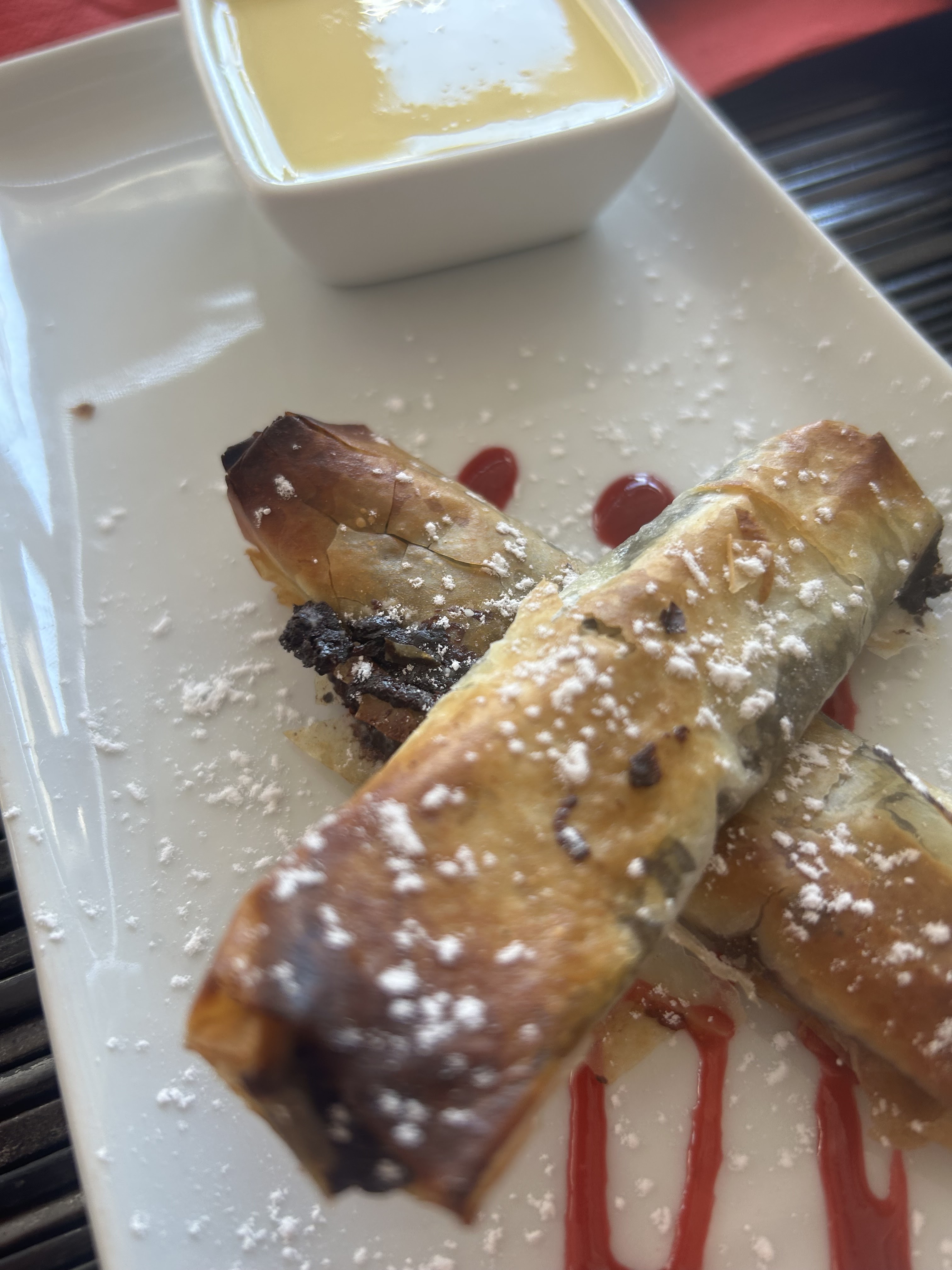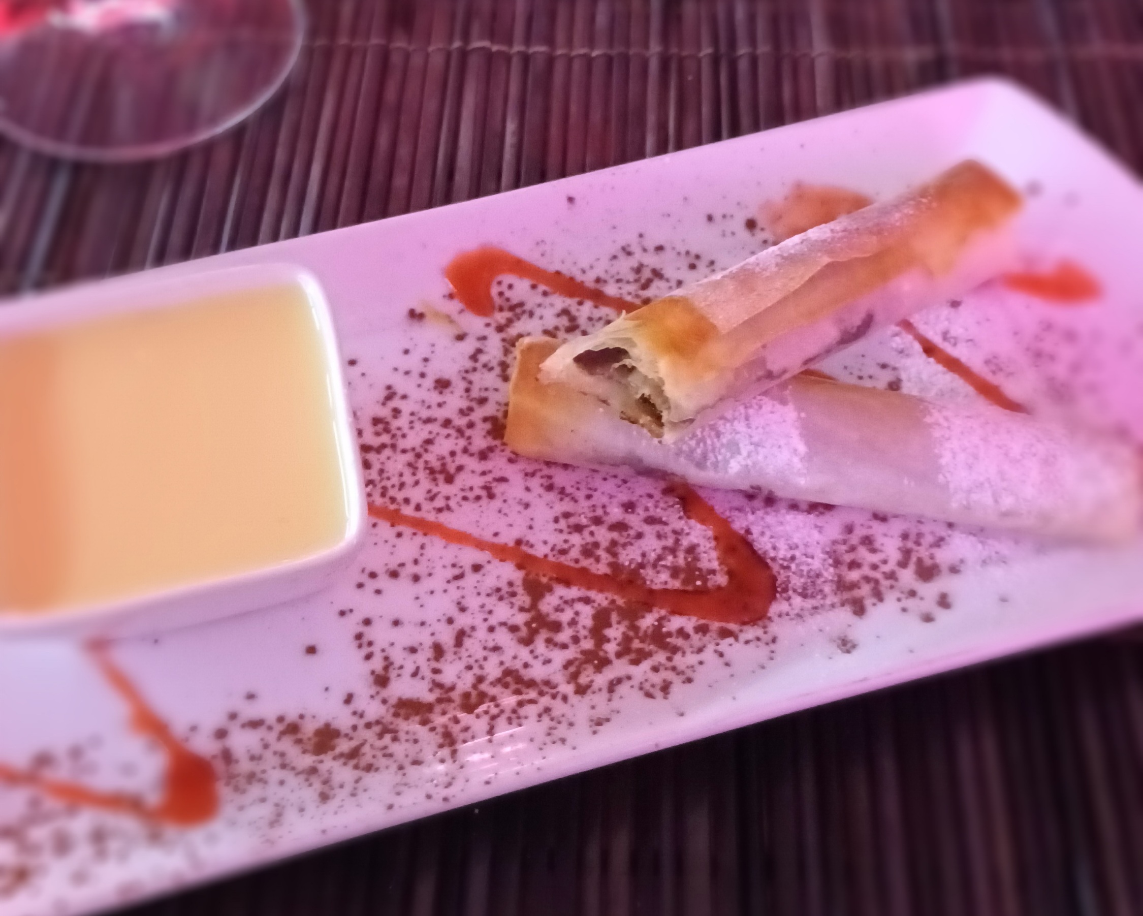 Repas très décevant Et très cher au vu de la qualité très médiocre des plats 3 pauvres nems réchauffés à la friteuse, des pizzas super fines pas garnies et sans goût pâte mauvaise Et que dire des desserts tous servis avec leur déco de cube de fruits confit ultra bas de gamme Et 9 euros pour 2 minis nems au chocolat industriels du vol pur et simple Personnel agréable sinon et heureusement Vraiment pas à conseiller à fuire même