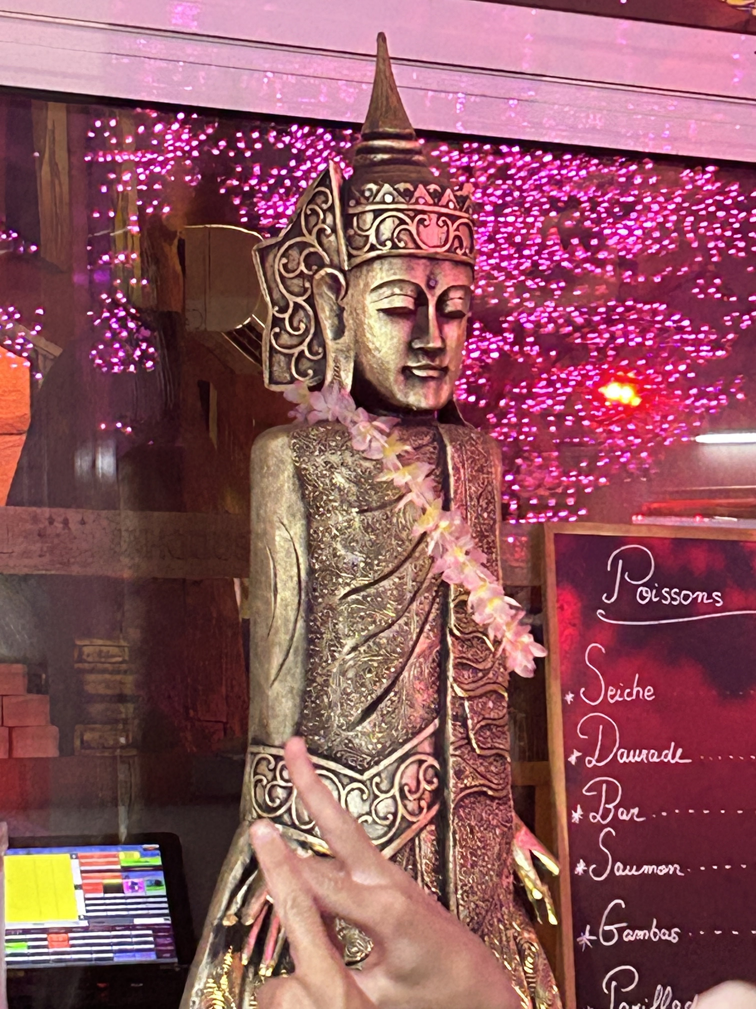 C'est la deuxième fois, la première visite remonte à deux ans, que nous visitons ce restaurant. Les deux fois, nous n'avons pas réservé de table et les deux fois nous avons eu de la chance car c'est toujours plein après une certaine heure (20h). Les pizzas sont vraiment bonnes ici. Le restaurant n'obtient que 3,7 sur l'échelle de Google mais je pense vraiment que les pizzas méritent une note bien plus élevée. Je pense qu'il faut toujours être un peu plus prudent avec les autres repas dans une ville touristique en France (ou n'importe où dans le monde). Mais si vous trouvez un restaurant comme Buddha avec un four à bois, des pizzas au fond fin et croustillant, …, vous devriez commander une pizza. Le service était vraiment excellent et très sympathique. Je ne peux rien dire de négatif sur les pizzas de Buddha. Jetez un oeil à nos photos…elles parlent d'elles-mêmes. On ne peut pas juger d’autres plats comme le poisson ou le steak. Mes enfants ont commandé un hamburger la fois précédente. En France, on a tendance à donner très peu de frites donc on ne commande plus de burgers.