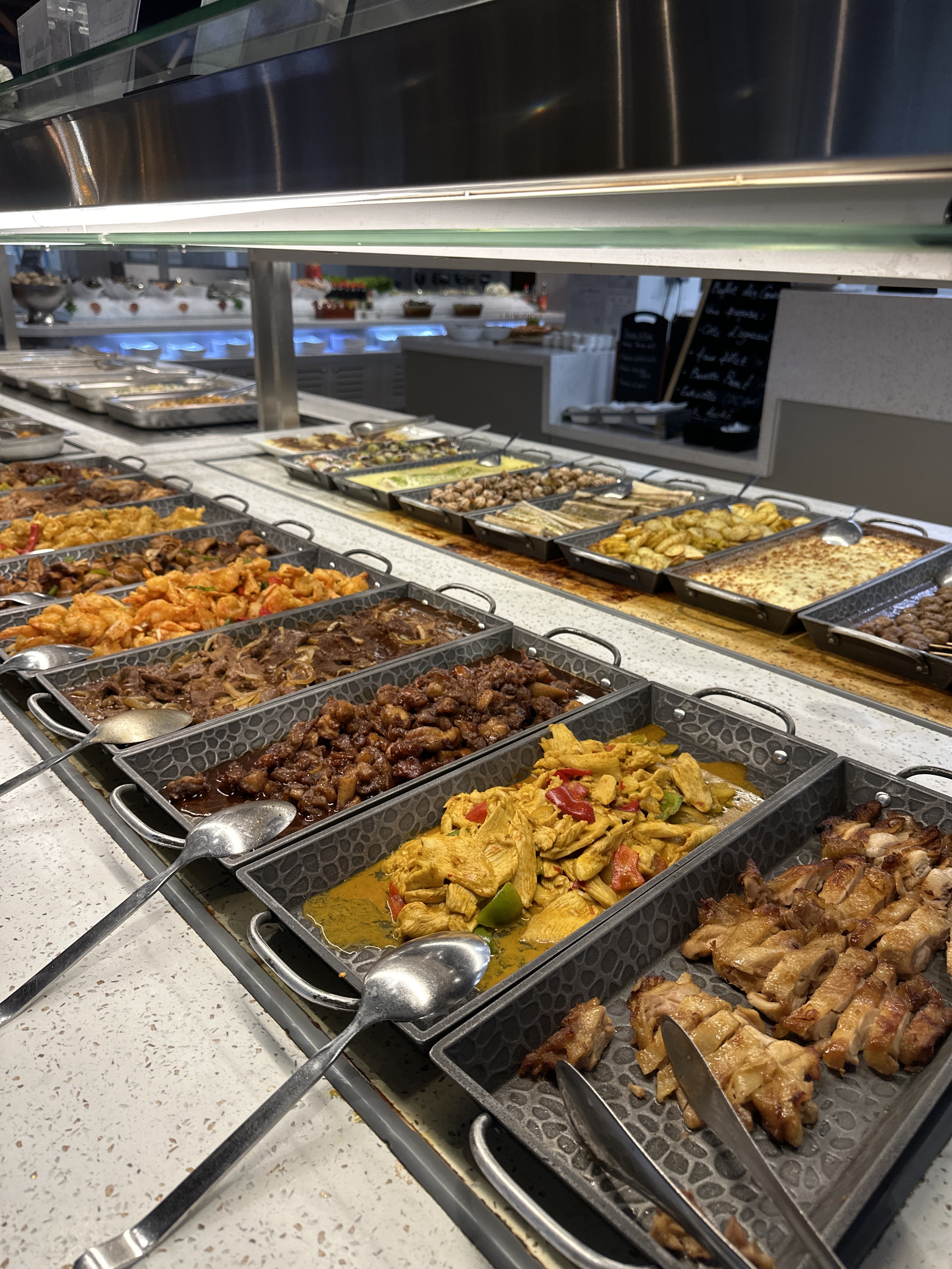 À 19h très peu de monde et le buffet plein et bien présenté, c’est le meilleur moment ! Une vaste choix en tout genre et des choix suffisants halal (tout est indiqué)
