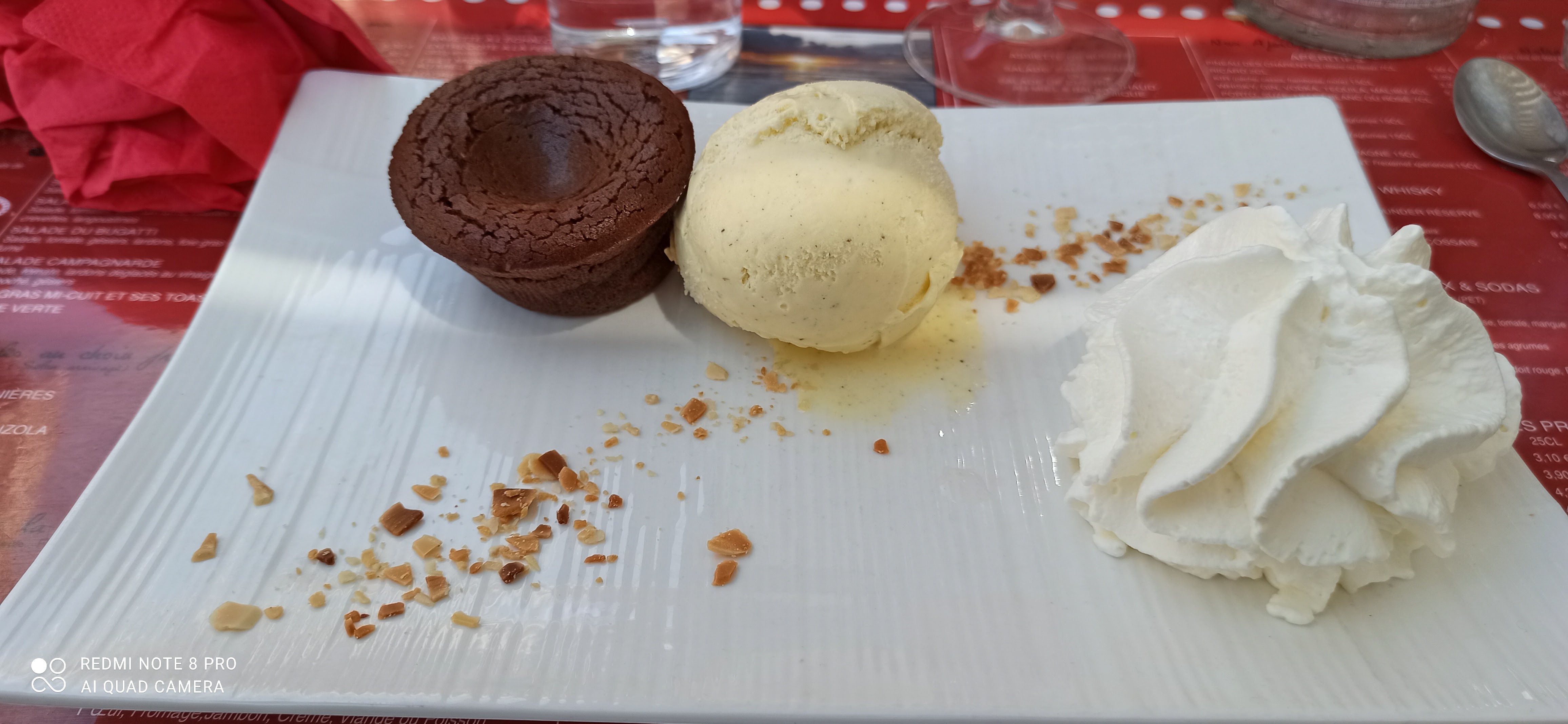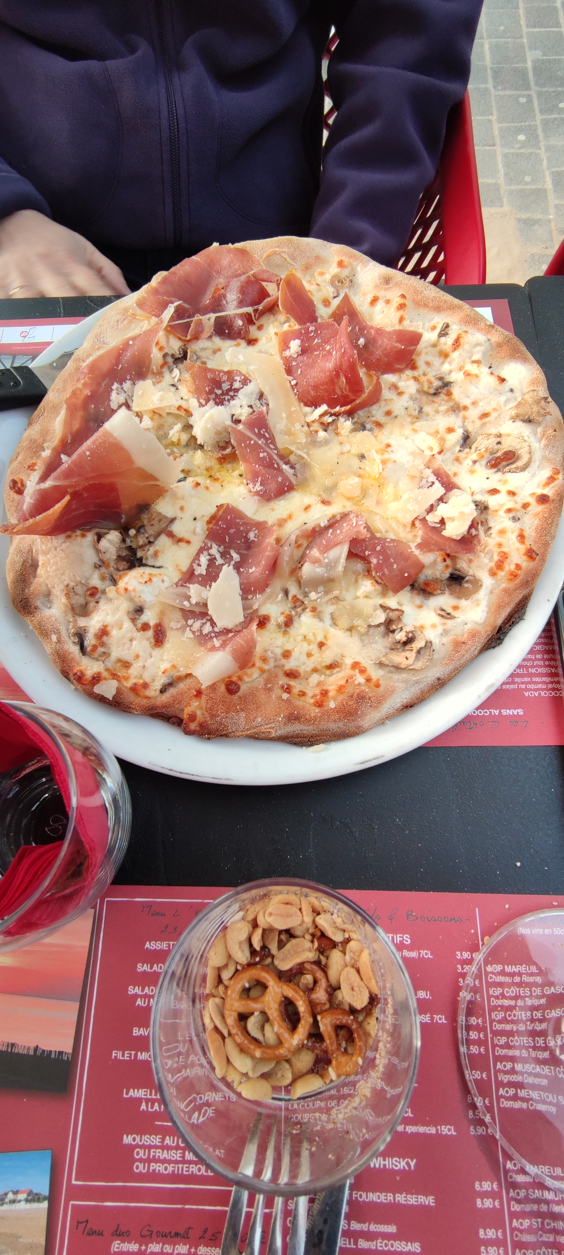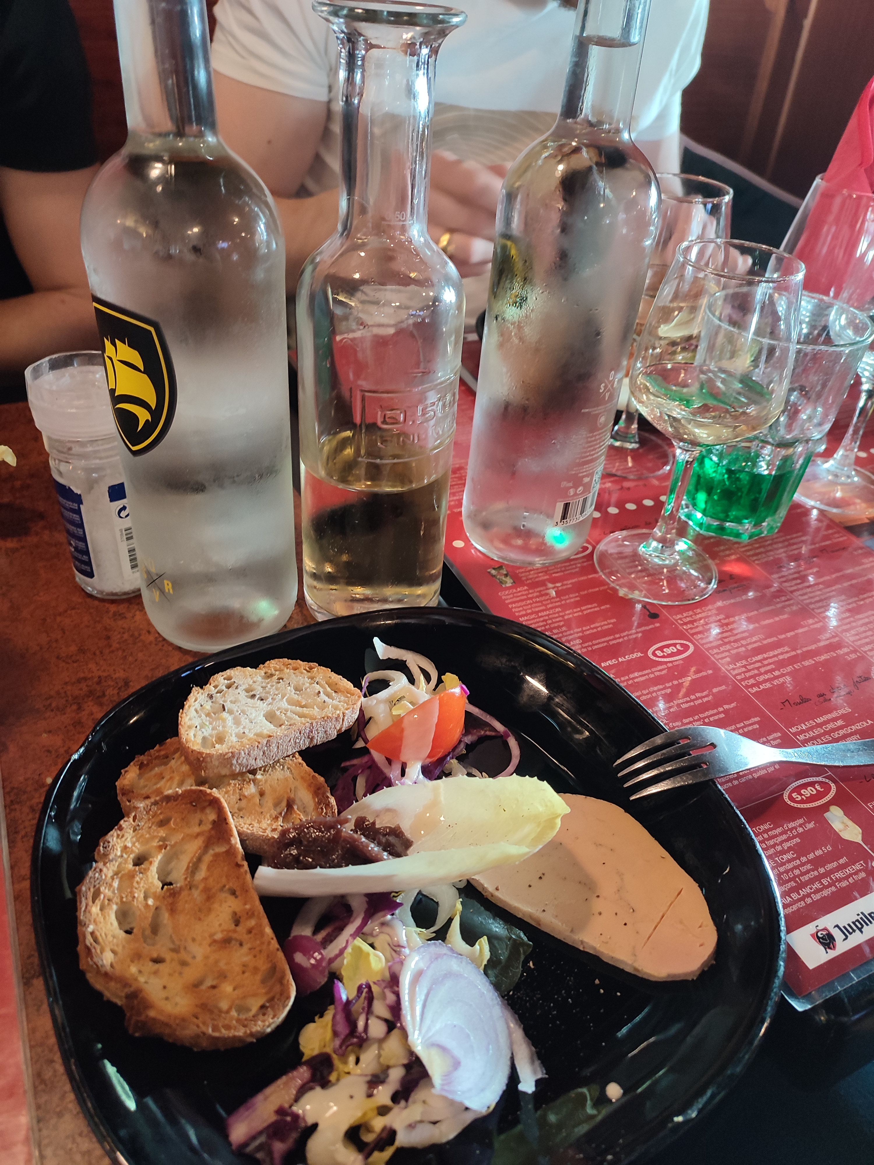 Nous avons bien mangé, les pizzas sont bonnes mais pour notre part le foie gras était presque inexistant. Un bon dessert après ceux ci et un vin blanc pour accompagner le repas.
