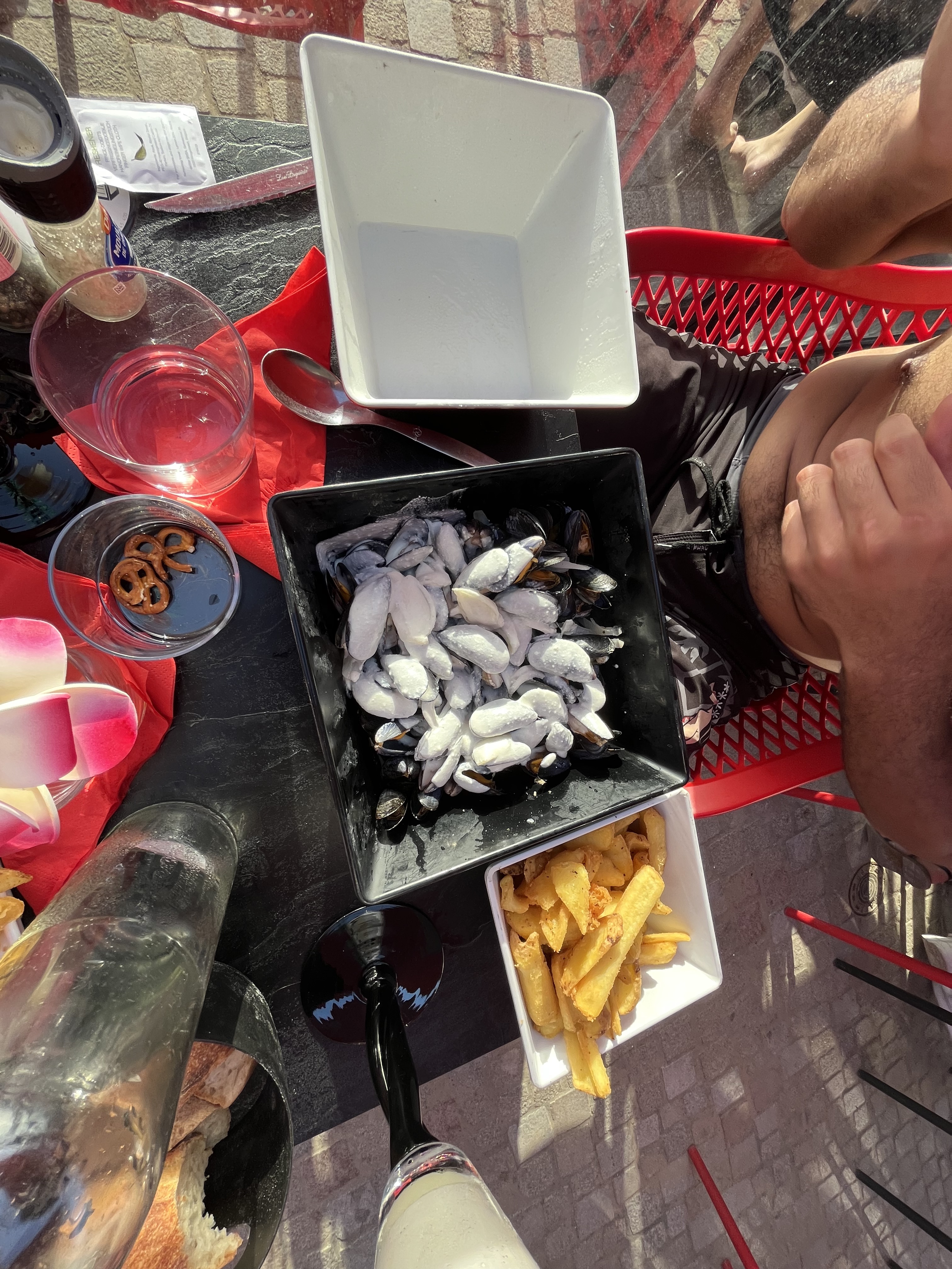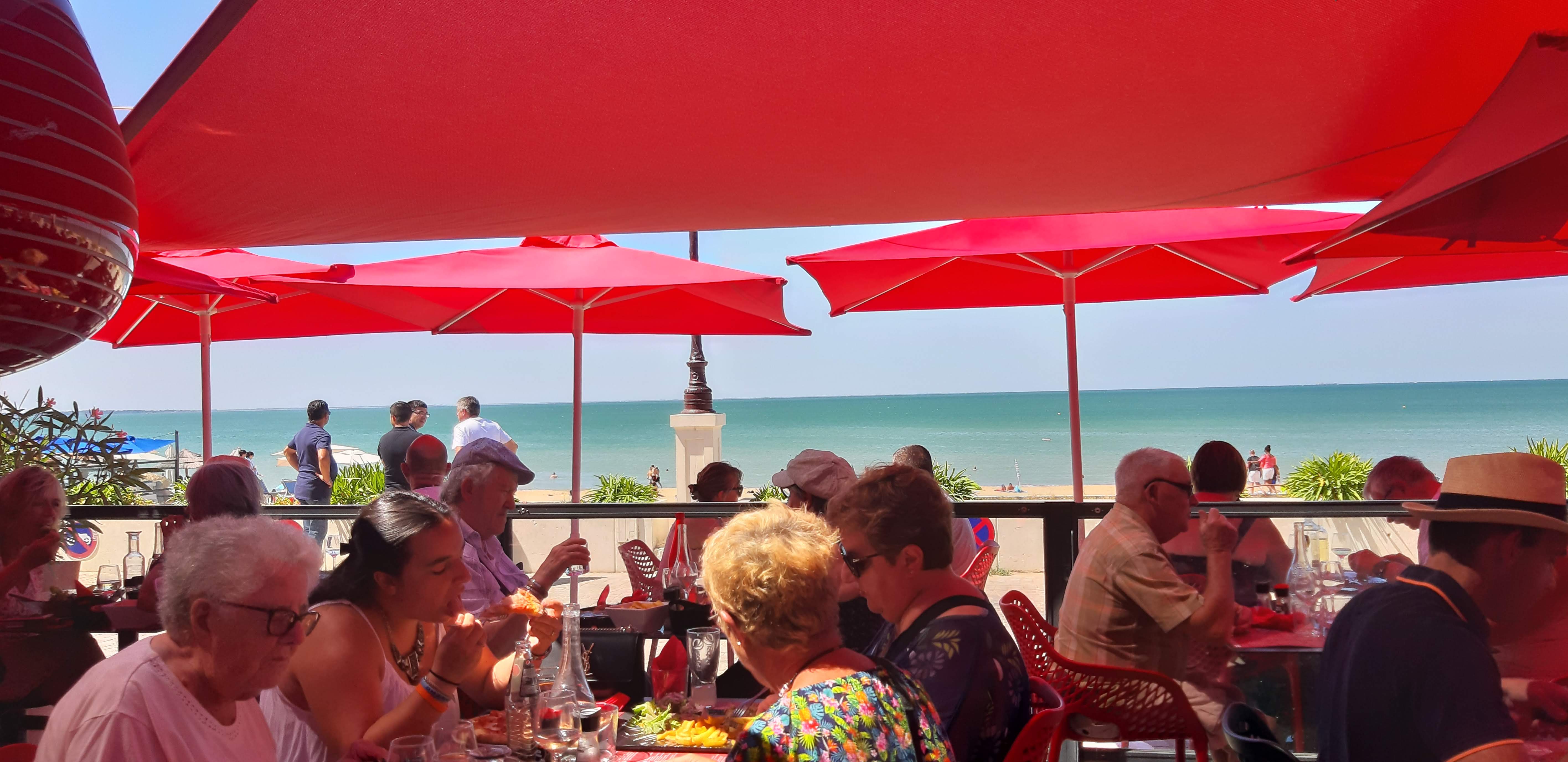 Nous avons eu une table dans une salle à l'écart dont nous étions seul car les tables avec vue sur mer étaient réservées après 1h de repas nous sommes rendu compte que ces tables que nous souhaitons étaient pas occupées et que les 10 personnes dernières nous étaient en vue sur terrasse ainsi qu'un grand nombre d'autres personnes, nous avons eu l'impression que nous derangions peu être du à nos origine étrangère de plus les serveurs sont empressée de vider notre table. Sinon pour les plats la pizza et bonne mais pour les moules frittes c'est pas leur spécialité.