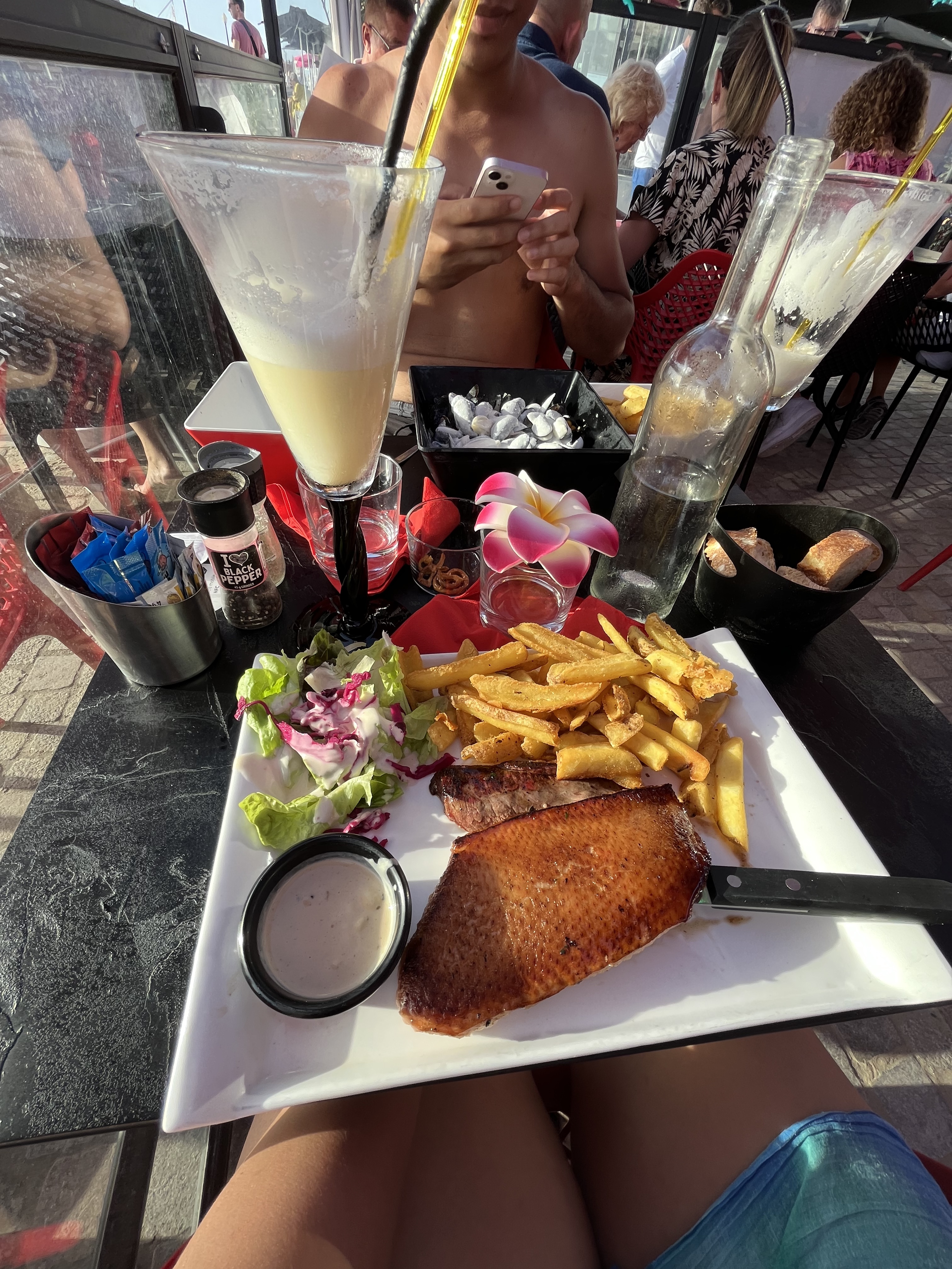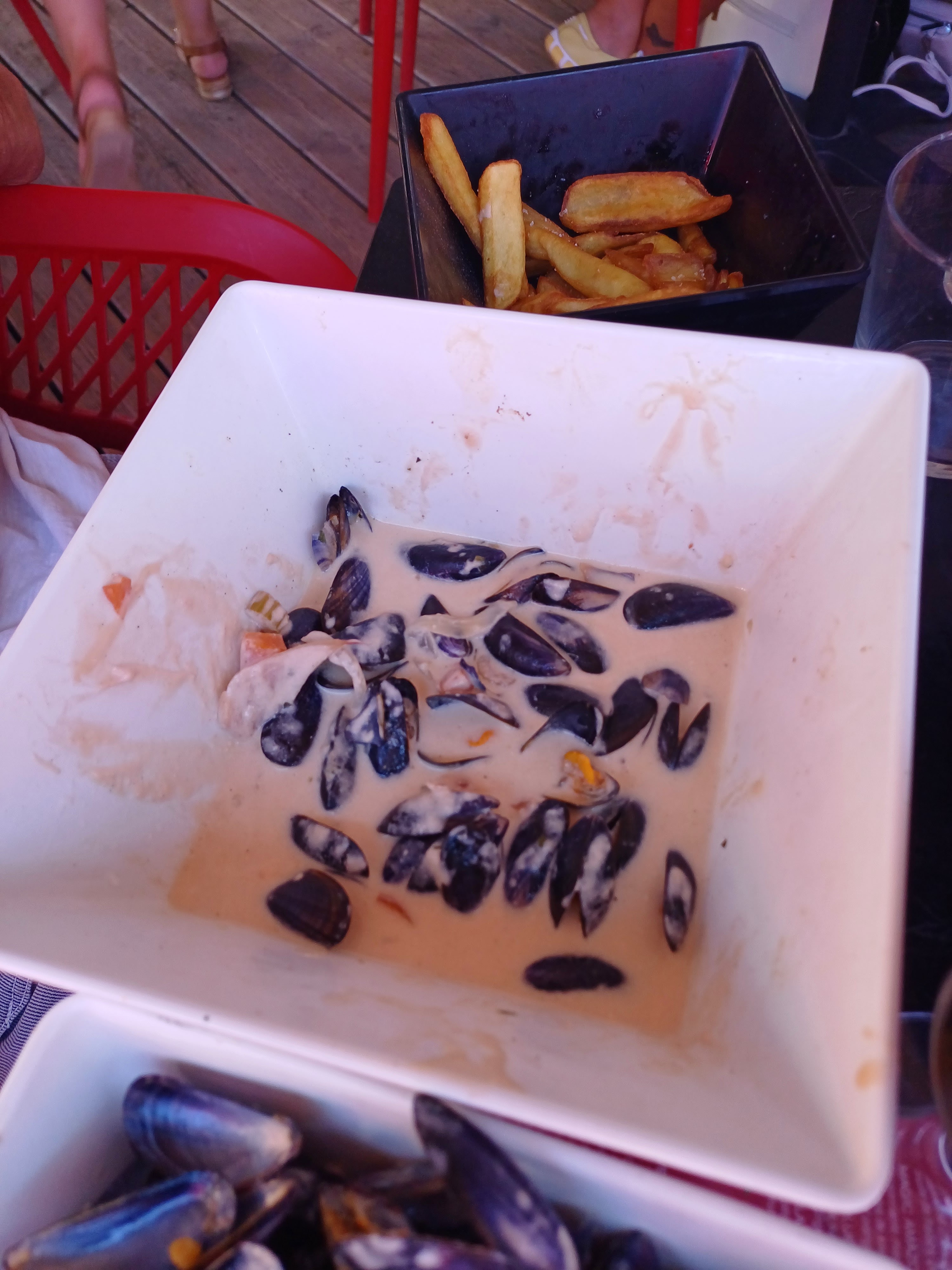 De généreuses portions de moules frites et des salades océane avec des fruits de mer frais. Un régal pour nous de passage dans la région après une matinée à la plage. L’emplacement est parfait, la terrasse à l’abri du vent. Seul petit bémol à notre passage l’état des toilettes à 14h en fin de service c’était limite limite sur la propreté et les odeurs…