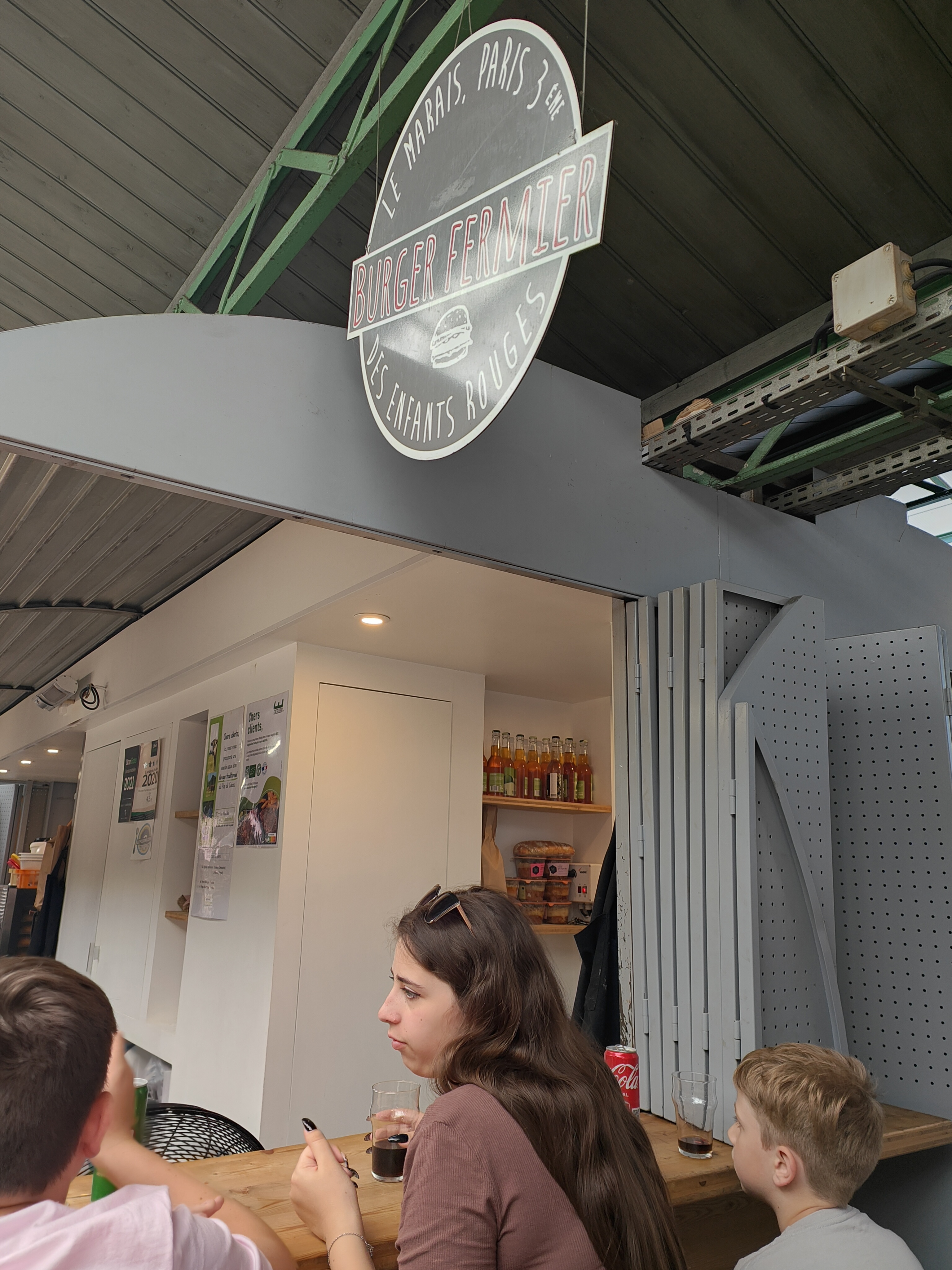 Magnifique Burgers dans le très beau marché des enfants rouges. Le pain est maison les frites aussi Ambiance comptoir sympathique Un conseil venez tôt