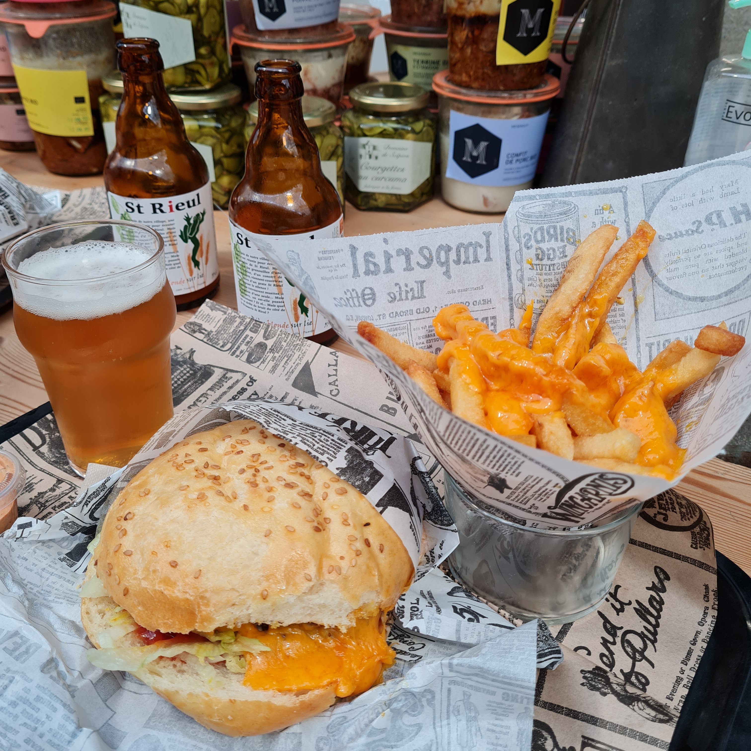Lieu et ambiance très agréable dans des halles Le concept est très intéressant Hamburger très bon, copieux et qualitatif Seul bémol, des frites maison aurait été le top du top.