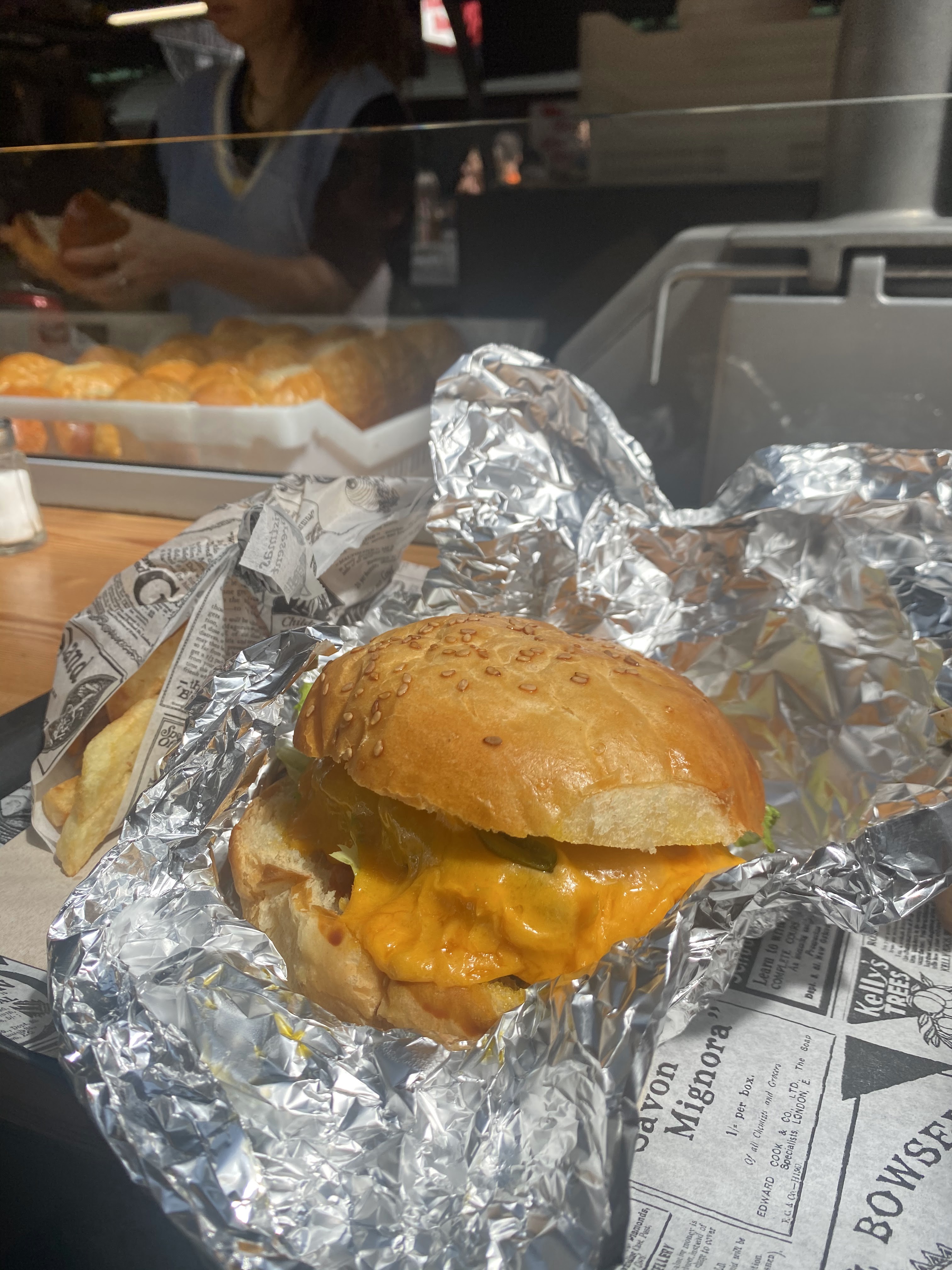 Le pain est incroyablement frais et savoureux. La quantité de fromage qui sort du hamburger met l’eau à la bouche, sans être écrasante. Et la sauce servie avec les frites est délicieuse ! Nous sommes très heureux d'avoir choisi cet endroit à l'intérieur du marché ! Le service était également très attentionné et gentil :)