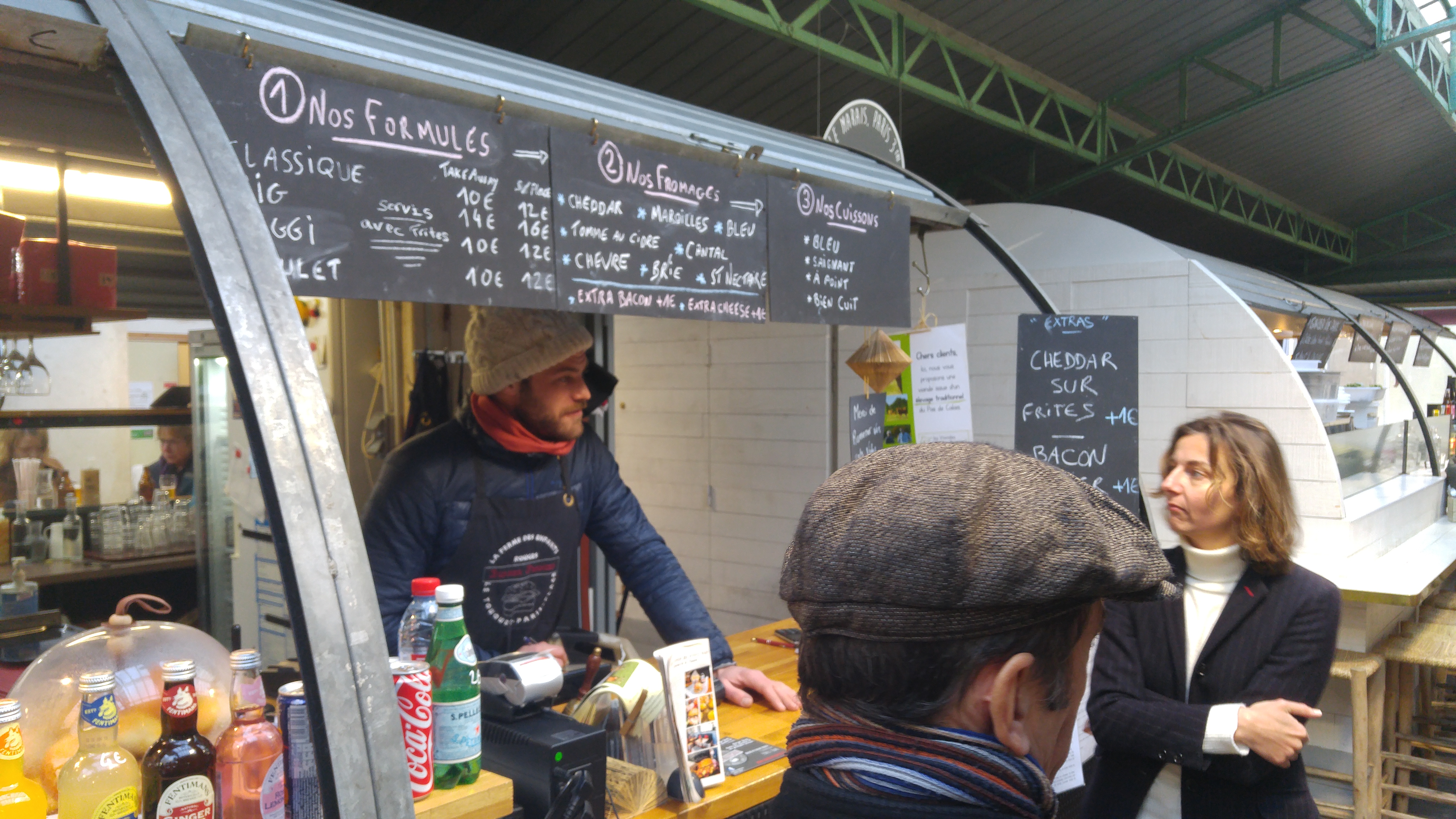 On vient dans ce marché pour une adresse bien connue du 3 ème et on tombe sur une pépite. D'abord attiré par de jolis Buns maison, tout en rondeur et cuit sur place, on est ensuite accompagné dans son choix par un patron heureux de parler de son circuit court, familiale pour mes les produits qu'il vous sert. Commence alors un voyage dans le nord de notre pays dont l'origine est l'attachement au produit à la terre. Vient enfin le moment du choix et les conseils sont parfaits. Pour aujourd'hui, j'ai croqué avec délectation dans un burger double steaks, sauce maroilles (pas juste le fromage mais travaillé avec douceur pour plein de plaisir et saveurs) et frites au cheddar. Un plaisir, un régal du grand art. Merci