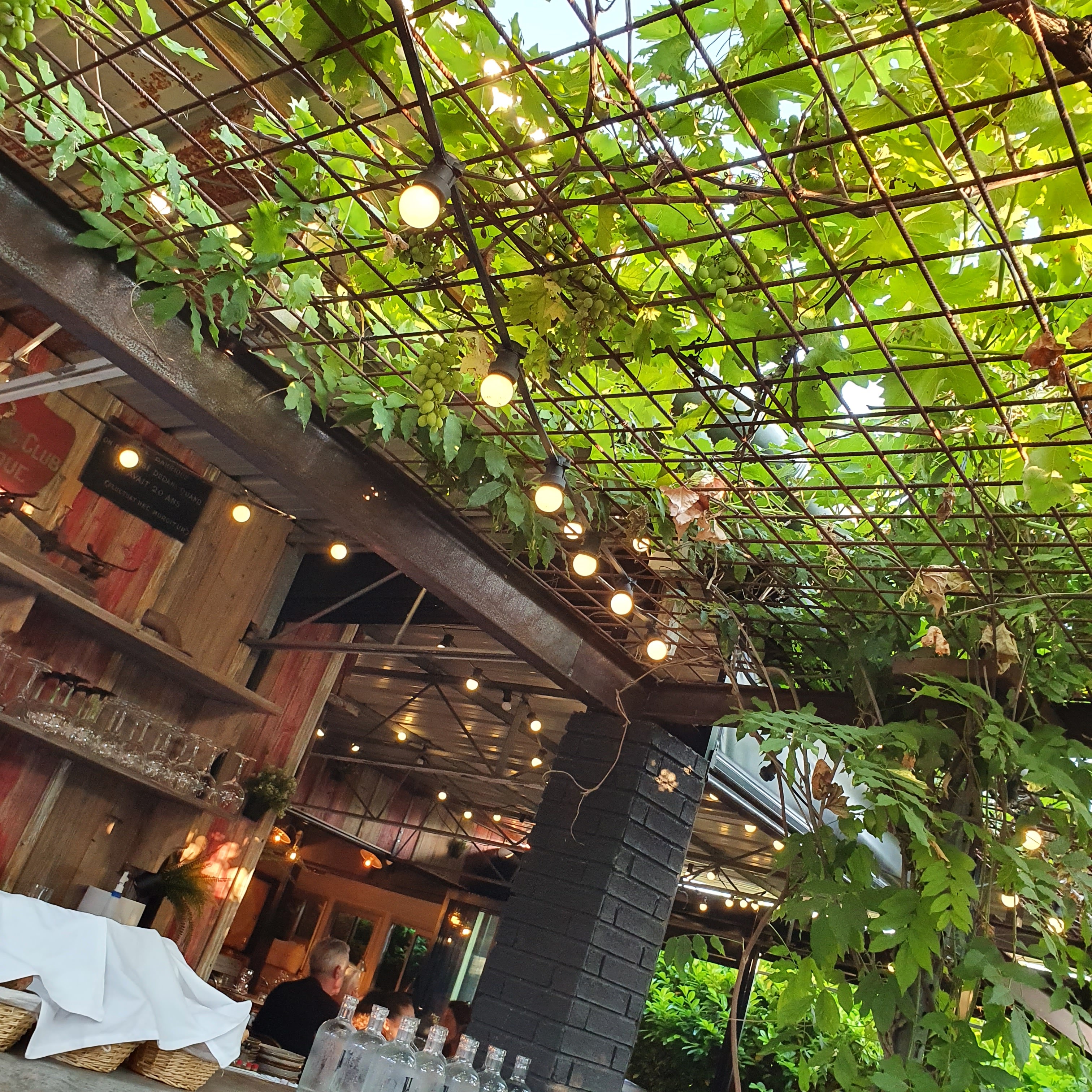 Le plaisir de manger sous la terrasse protégée par un seul pied de vigne. Si vous êtes sympa et gentil avec le serveur , il vous donnera une grappe avec le dessert.
