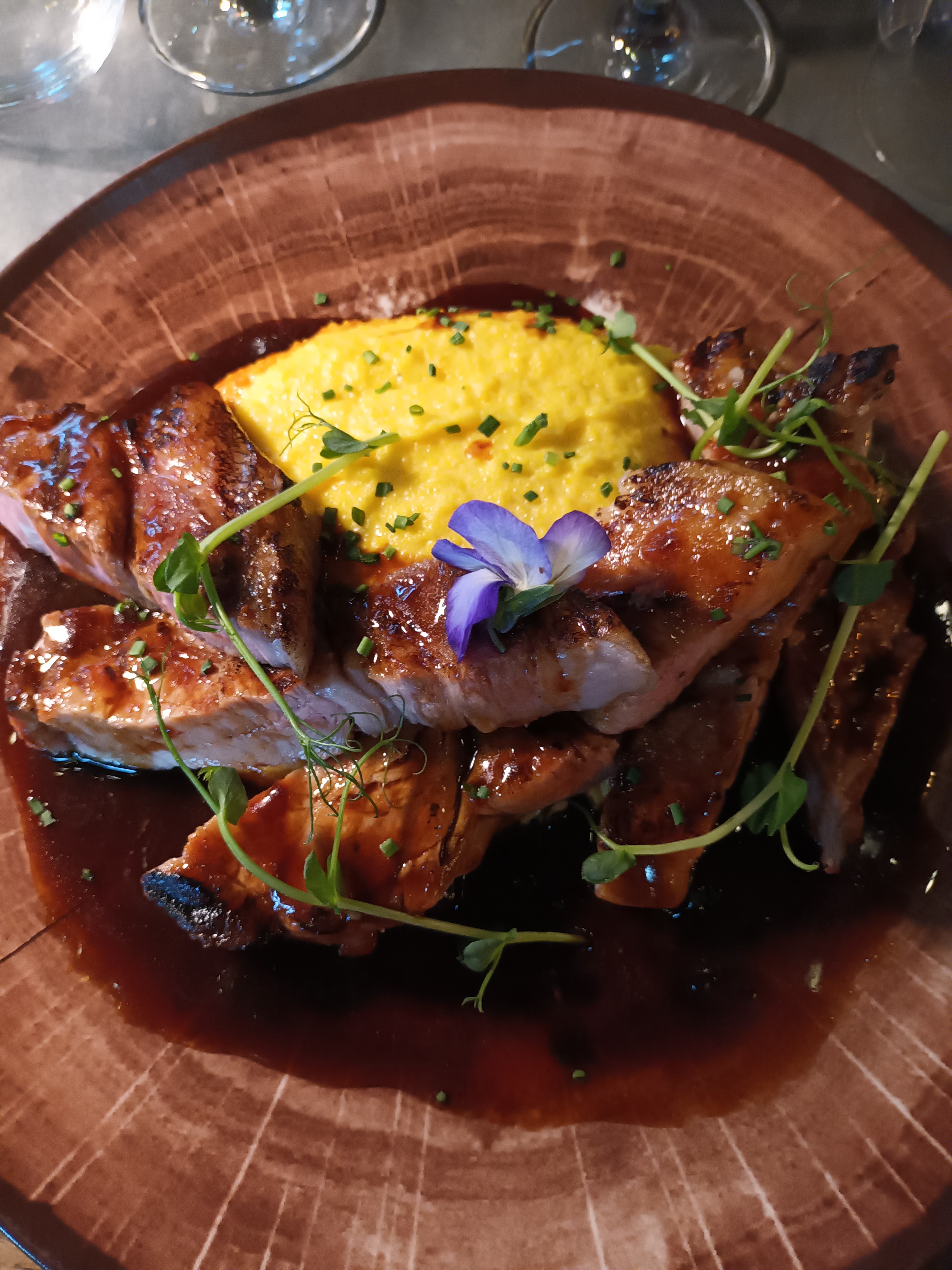Délicieux ! Le camembert rôti, le porc noir et la salade césar étaient vraiment bons et copieux ... cuisine raffinée, les petits légumes avec le porc noir étaient à tomber. Bravo au chef ! Ambiance sympa dans la salle avec des serveurs de bon conseil et gentils.