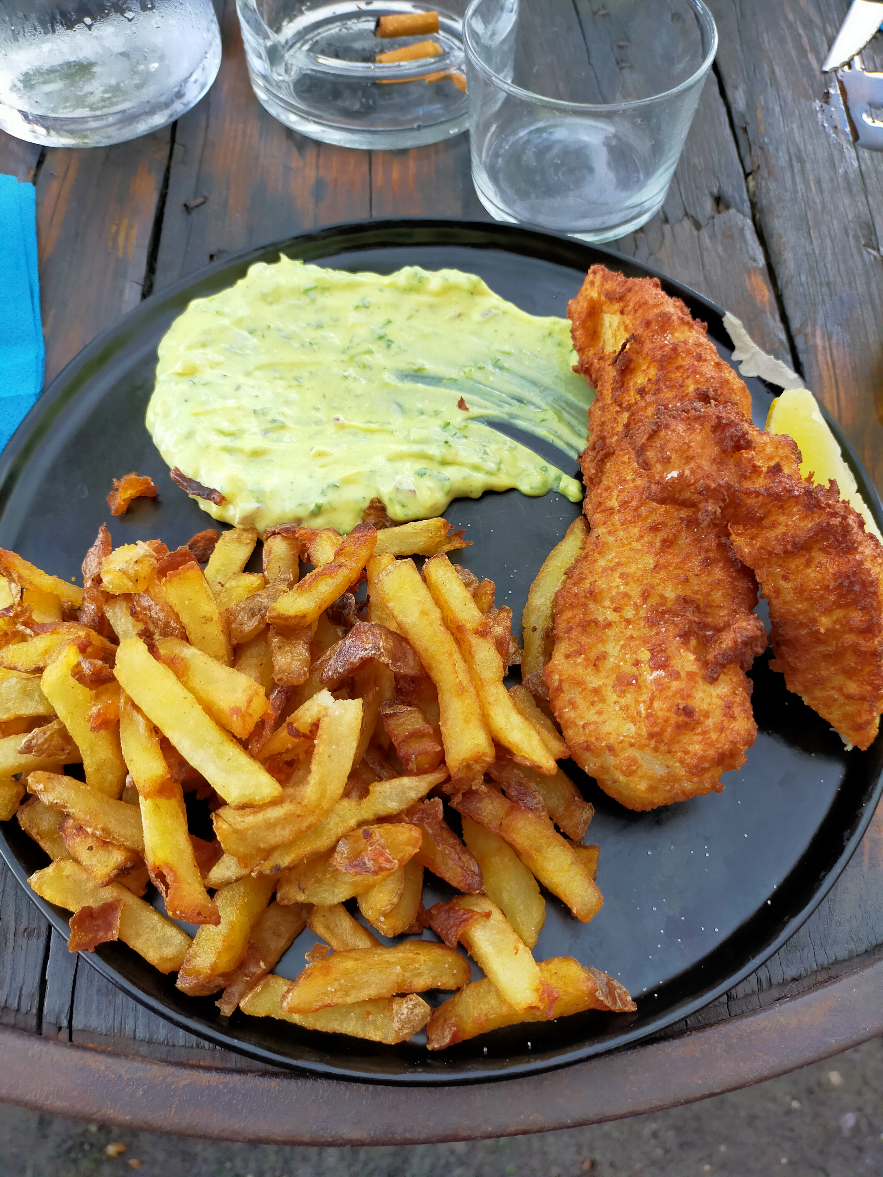 on ne peut pas tout baser sur un joli cadre et la cool attitude... j'ai commandé un fish and chips,j'ai vu arrivé un morceau de poisson pané avec des frites de fonds de friteuse (petites,archis cuites et très grasses) par contre la table après et derrière nous a eu de magnifiques filets de poissons panés et de belles frites,comme on l'attend d'un vrai fish and chips...je pense que mon commentaire sur l'absence de WC n'est pas bien passé,de là a dire qu'on sert a la tête du client...il n'y a qu'un pas,que je franchis... a l'attention des propriétaires : je trouve peu courageux d'envoyer au casse pipe un serveur pour s'excuser et nous offrir le café en guise de dédommagement. en parlant des WC,si vous voulez y aller prévoyez,ils n'en ont pas,du coup ils partagent les toilettes publics qui ont été cassé et qui du coup sont inutilisables...👍 top