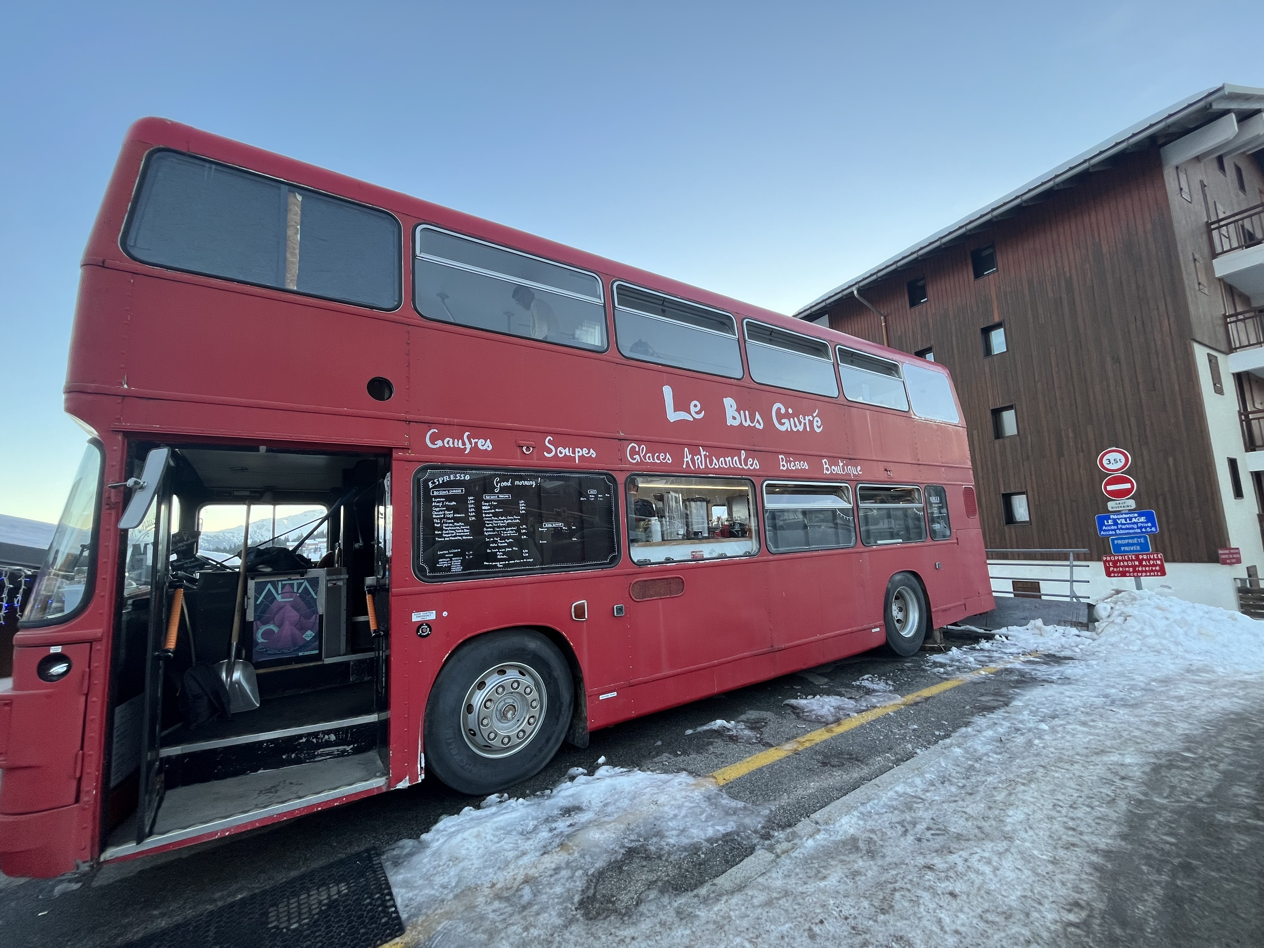 Placer en bas des pistes avec des tarif plus que raisonnable avec l originalité du bus ces endroits et super Il faudrait juste que le jeune homme respecte l ordre d arrivé des clients au moment de prendre les commandes N étant pas pressé et surtout je n' aime pas m afficher je n' est rien dis sur place mais je suis restée 15 min devant la porte du bus pour commander deux café je n' arrivais pas a me faire entendre du serveur et les gens me passai devant Au bout d un moment je me suis imposé sauf que le jeune homme a pris une autre commande de deux café egalement en même temps que moi et devinez quoi? Il a servi la deuxième personne avan moi Dommage un petit manque de professionnalisme qui enpeche la mentions endroits parfait