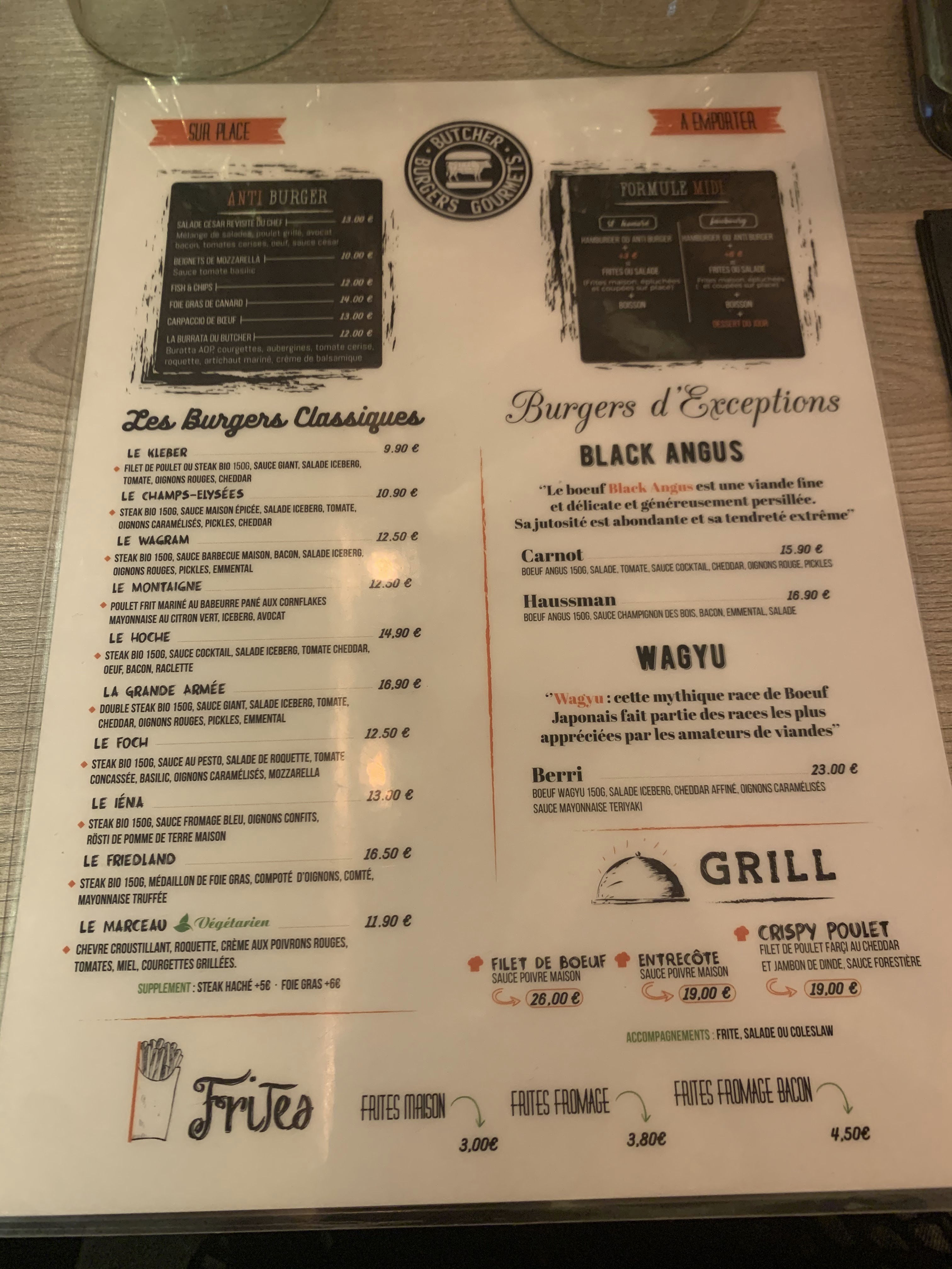 Assez décevant au final, les points d'amélioration sont: - Les steaks hachés sont bof bof et très fins dans un endroit qui s'appel le Butcher je m'attendais à de vrais steaks mais là c'est comme à macdo. - La couleure du pain était jaune fluo à l'intérieur j'ai trouvé ça étrange, le pain est-il acheté en boulangerie? - il faut nettoyer les salières et poivrière - des tables bancales - pas de Milk shake alors que c'est sur la carte. Sinon l'intérieur est sympa.