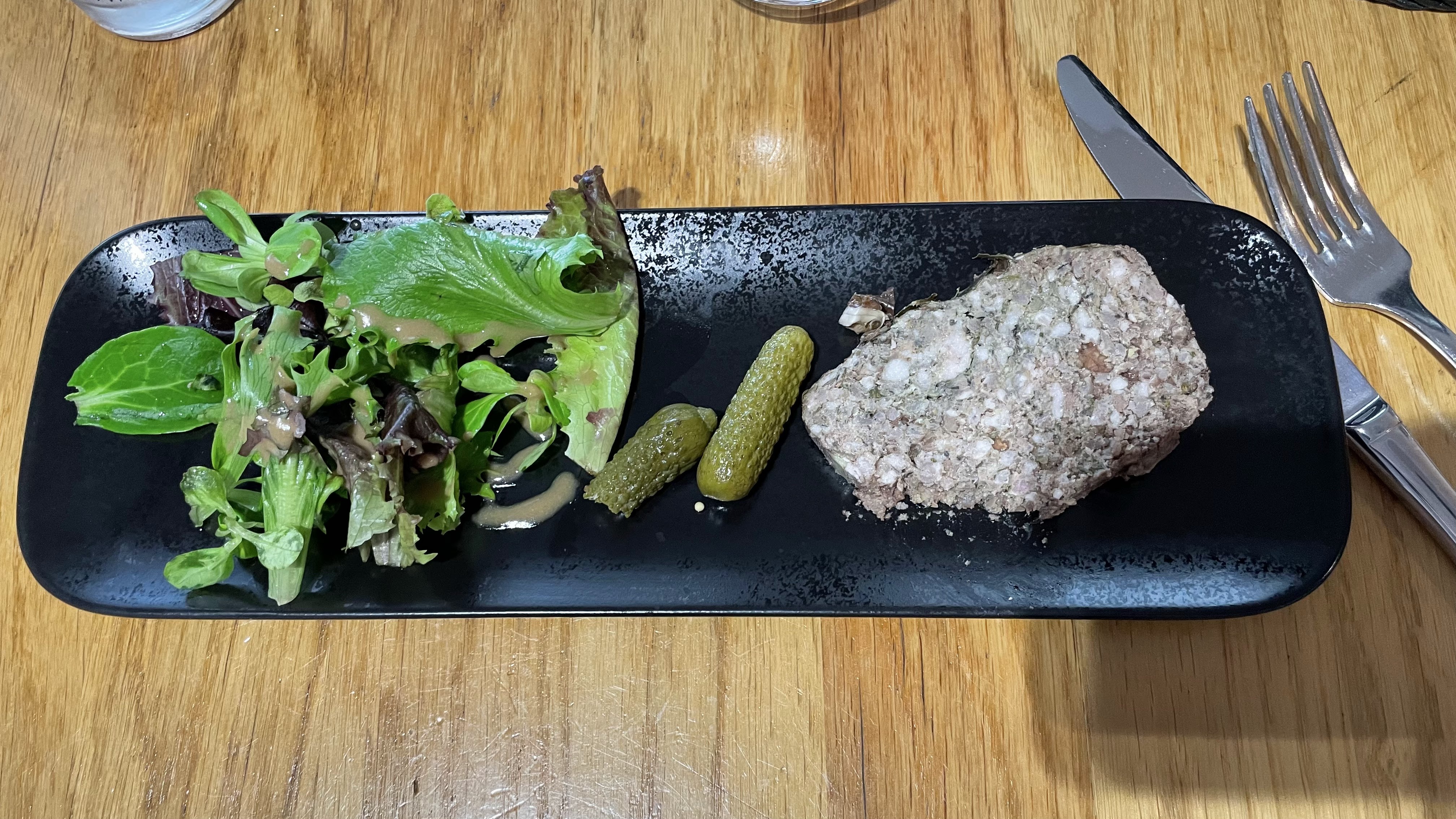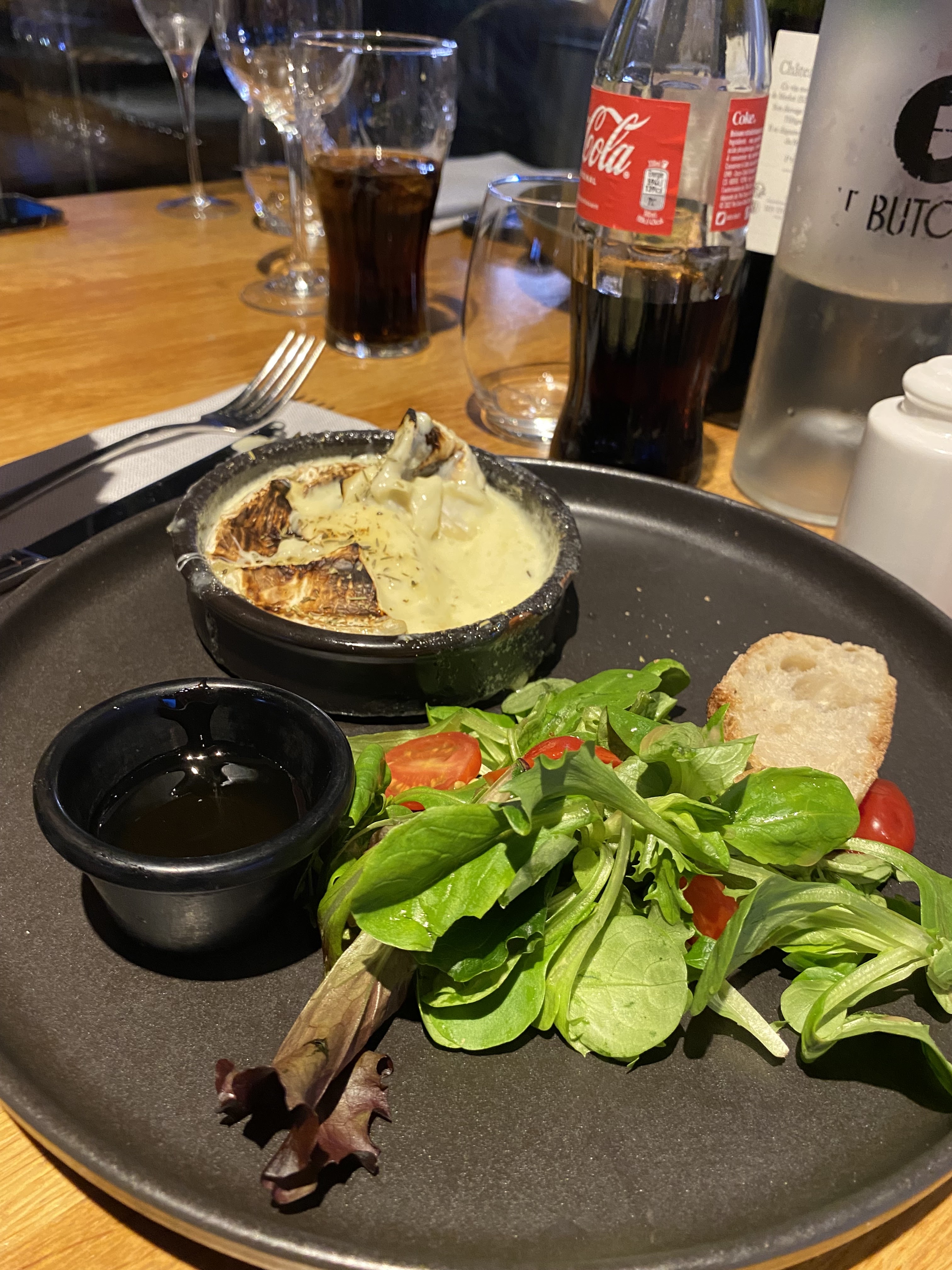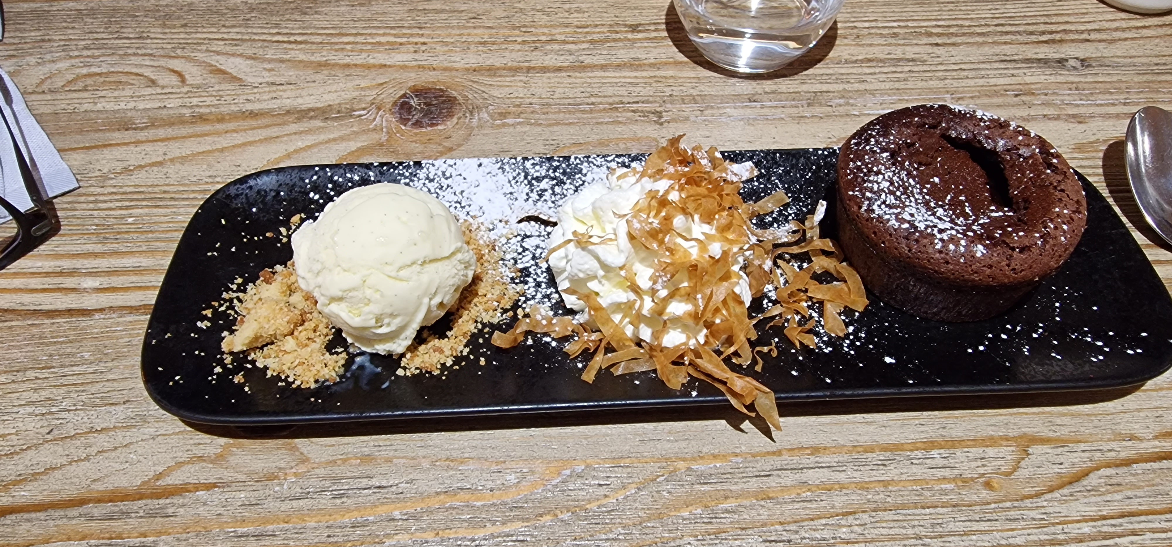 on dirait qu'il n'y a pas d'ambiance, une salade à plus de 18€ avec 3 petites tranches de pains et 1 petites tranche de chèvre dessus, peu de goût de chèvre, beaucoup de salades et de radis et tomate cerise, je comprends l'augmentation de la matière première mais là faut pas déconner. Dessert moelleux chocolat très bon, bravo au pâtissier, la glace vanille pas de goût de vanille.