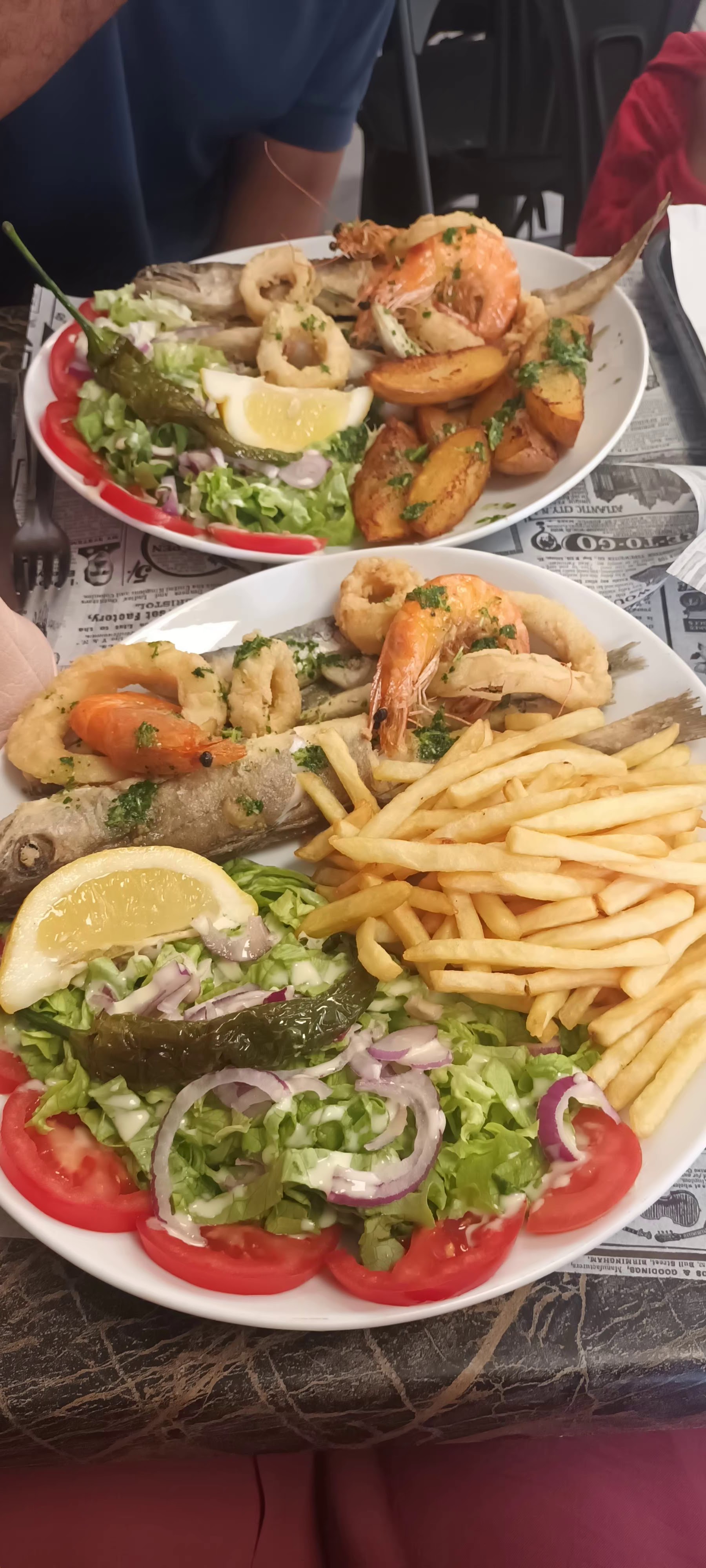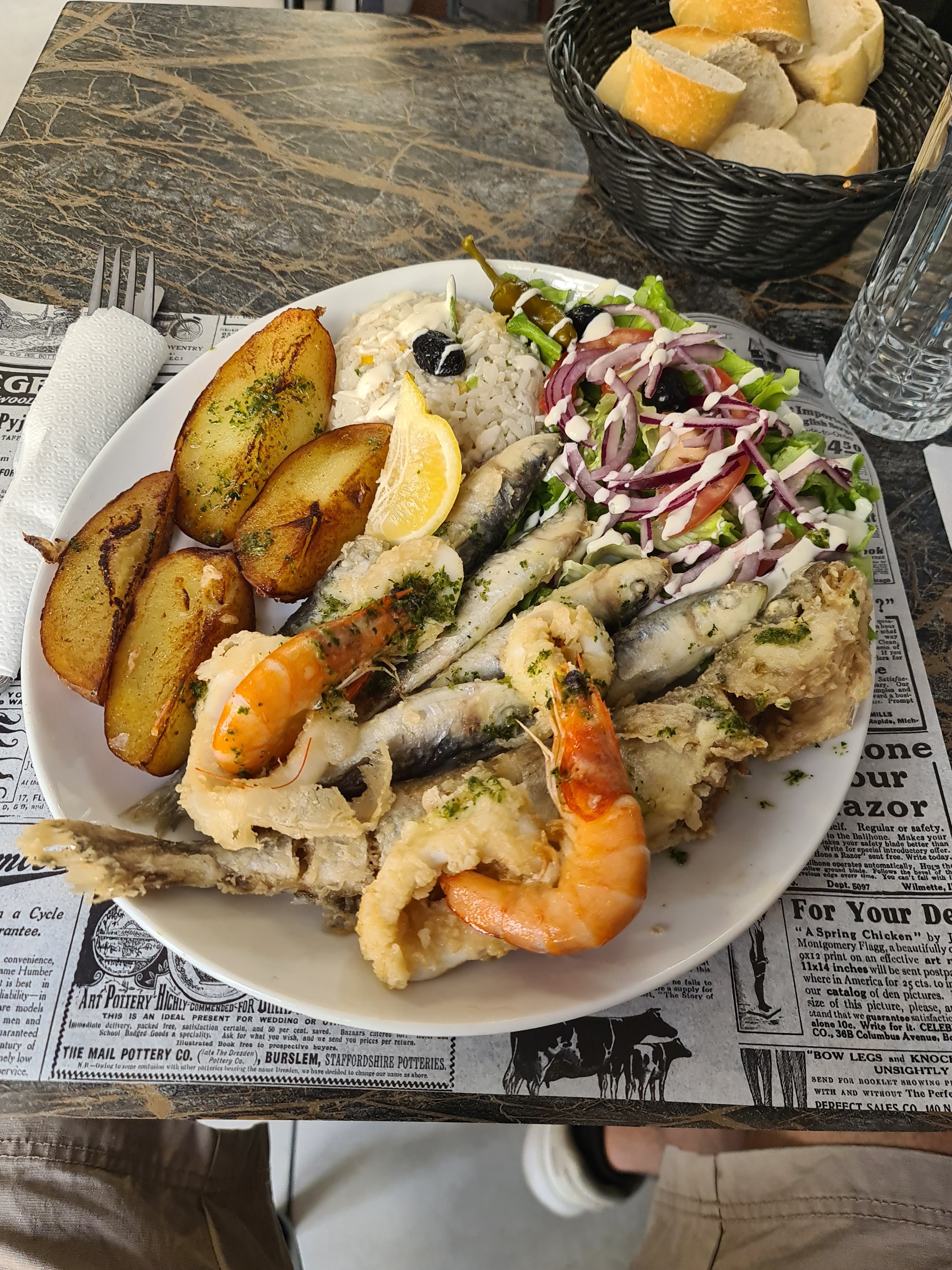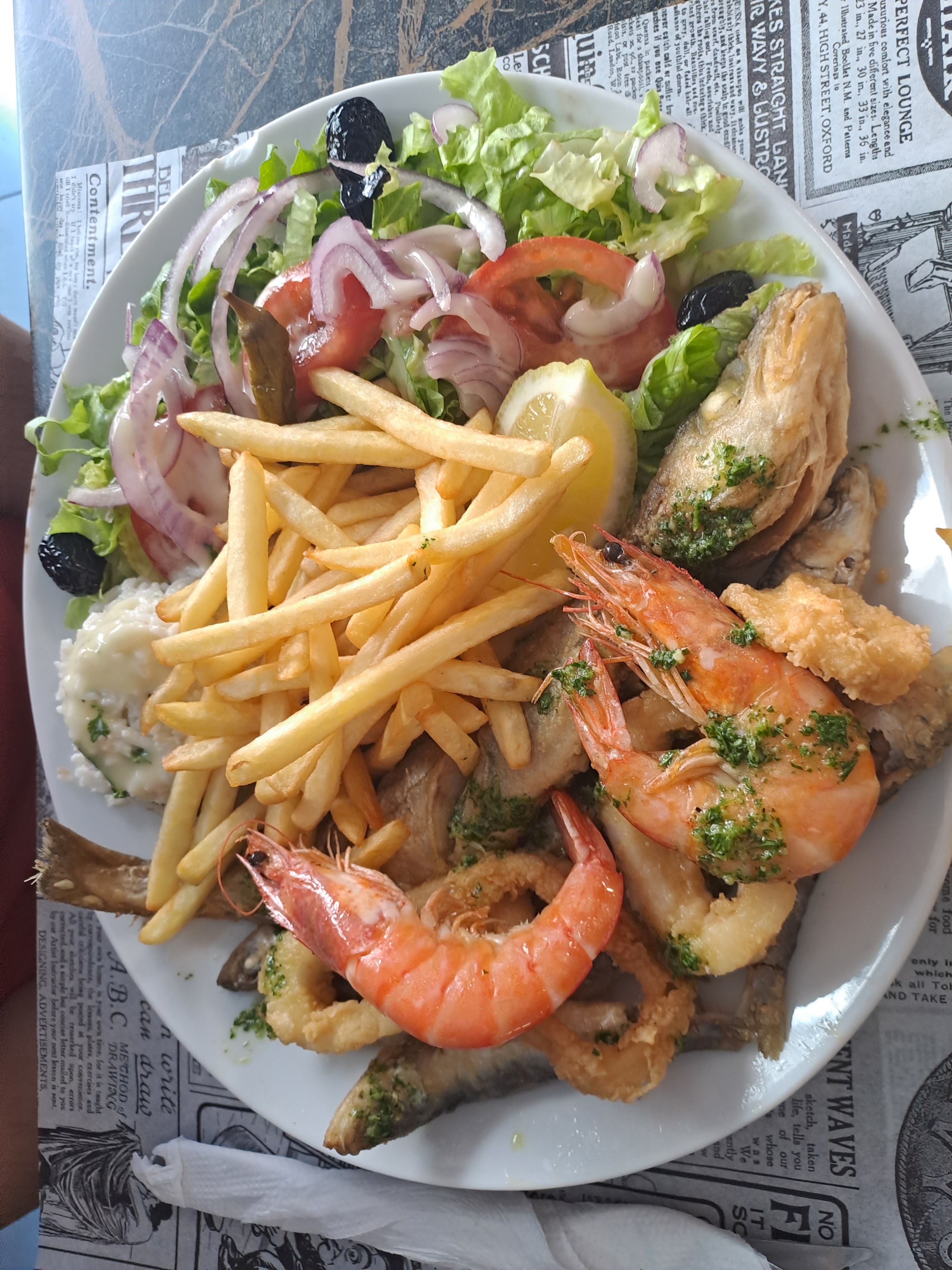 Frites, crevettes, petite friture et beignets de calamars congelés servis a peine tiède dans la ville de setes, ça la fout mal. Patron et cuisinier en claquettes chaussettes, les pieds sur la chaise de la terrasse pendant la pause... Le tout pour 12,90€