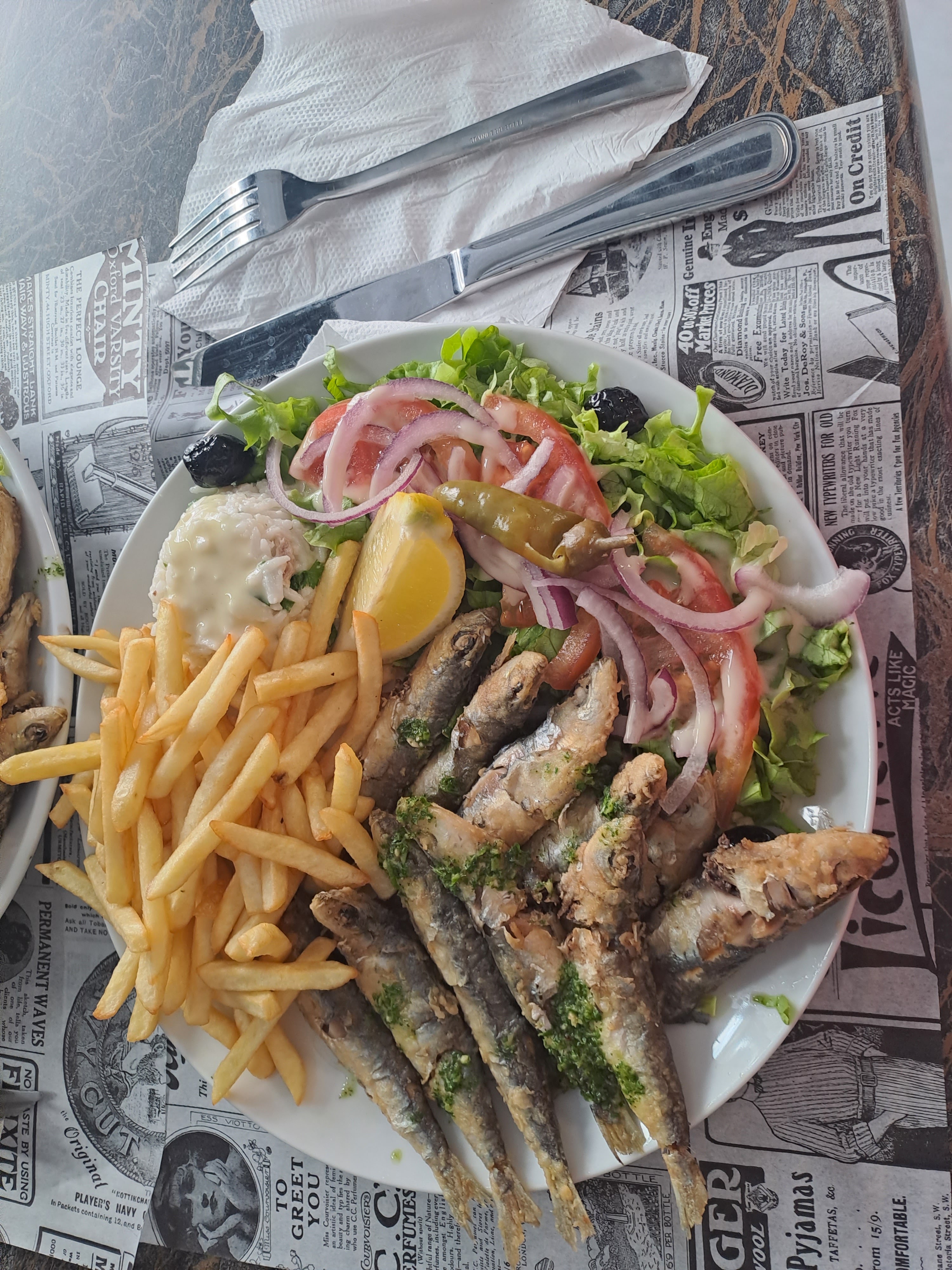 Accueil glacial d'un serveur sûrement le boss, Il a l'air aigri. Nous avons commandé sardine très bonne et fraîche avec frite radin il y avait moins d'une portion avec une salade défraîchie. Assiette kebab viande trop salée. Bof bof en général