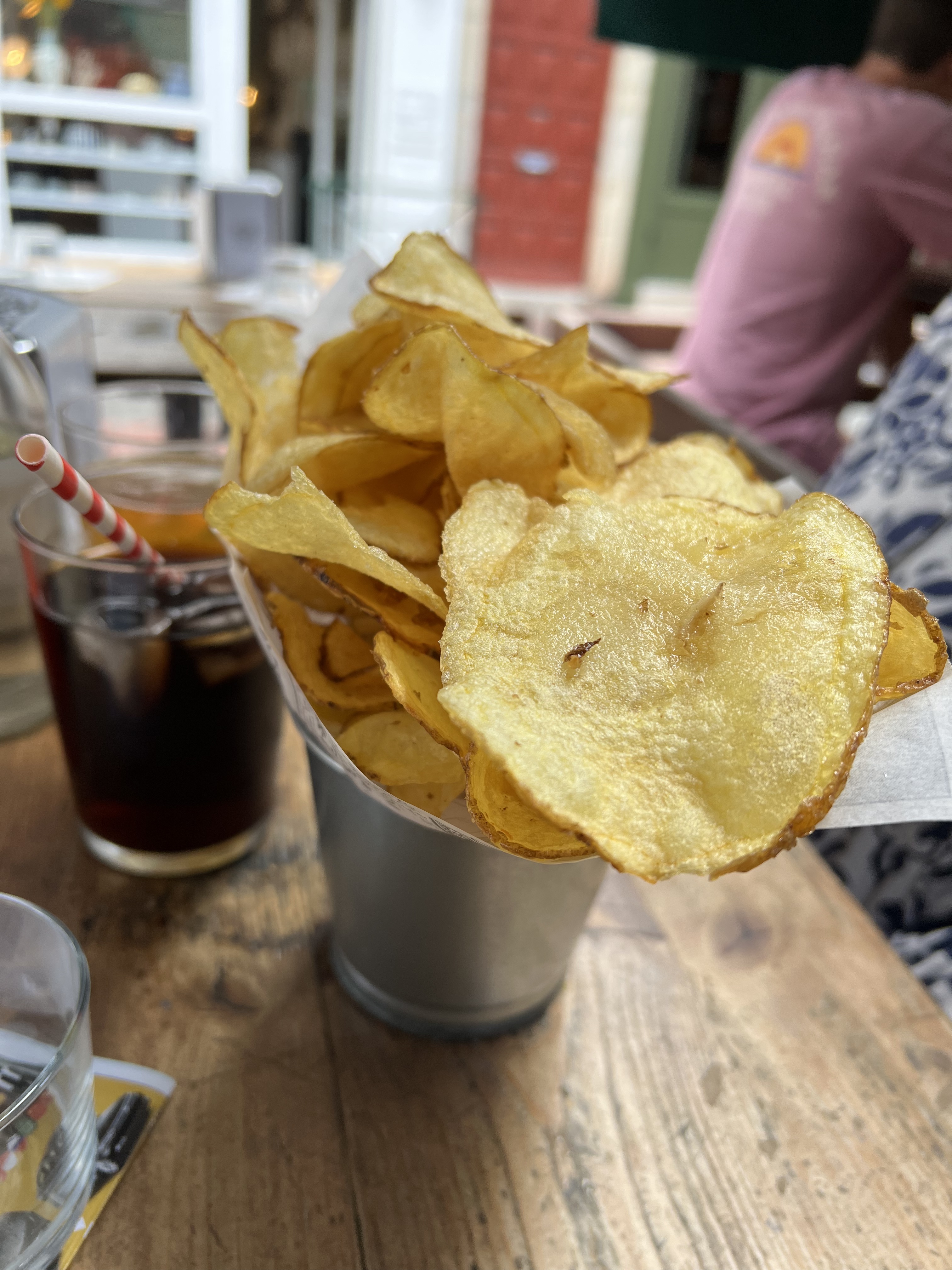 C’est ainsi que tous les hamburgers doivent être préparés et servis. Chaque ingrédient est fraîchement préparé, y compris le petit pain, qui est magnifiquement croustillant et moelleux. La viande fond en bouche et se marie délicieusement avec les accompagnements. En parlant de ça, ces frites (techniquement des chips) sont parfaitement... eh bien... croustillantes ! Je ne donne généralement pas de critiques 5 étoiles, mais j'ai dû faire une exception car je n'avais rien à redire. Le service et la nourriture étaient au rendez-vous et même l'ambiance était la quintessence de Biarritz.