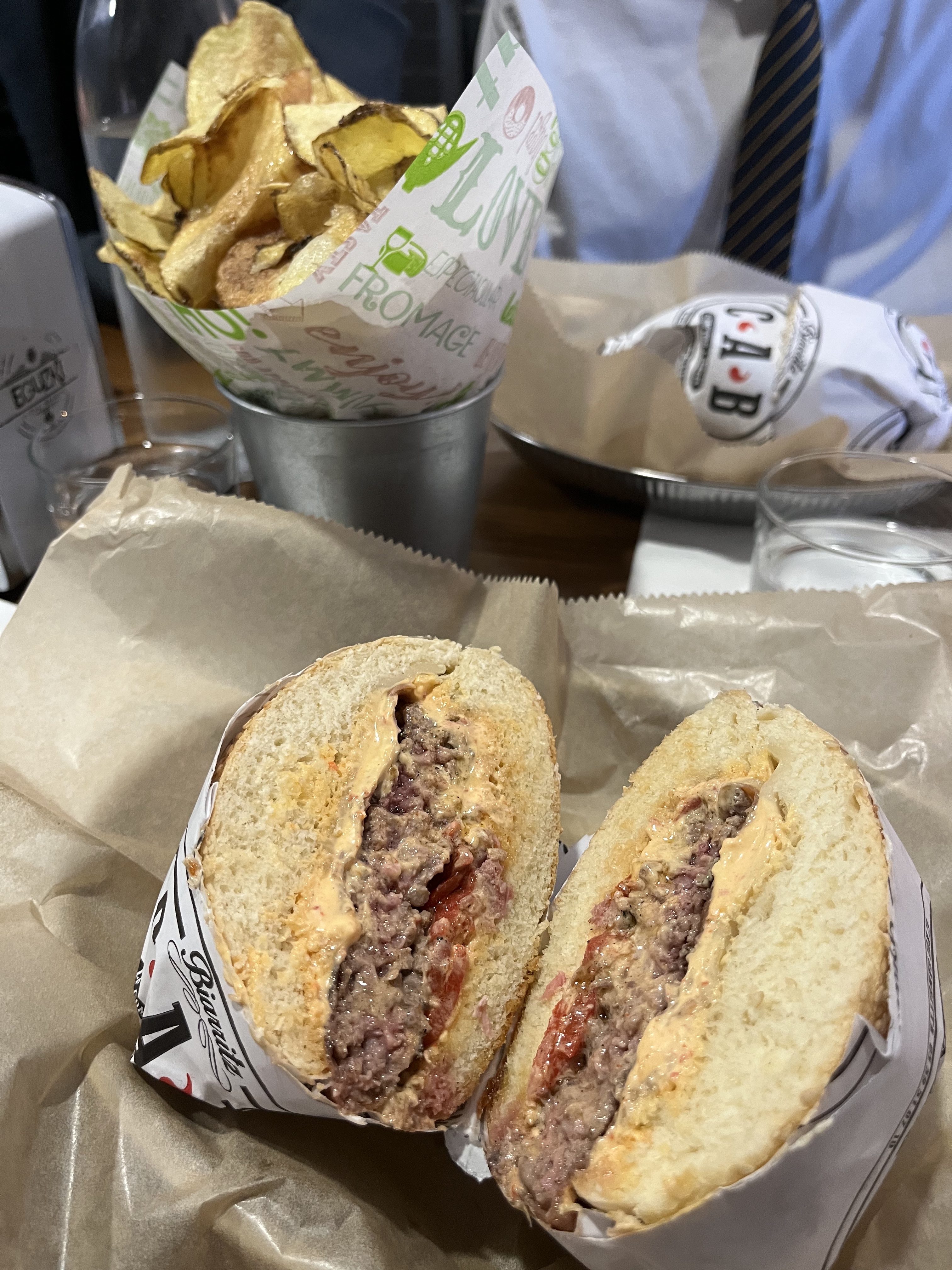 Après avoir fait pas mal de restaus de burger un peu partout, celui-ci est tout en haut sur ma liste, et je retourne toujours au CAB avec autant de plaisir depuis plusieurs années, en étant toujours ravi de la qualité du service et de la nourriture. Être bon, c’est bien, durer, c’est mieux ! Les burgers sont simples et variés, faits avec de très bons produits locaux, toujours cuits juste comme il faut, avec d’excellentes sauces. Un bon signe que l’on mange bien, c’est qu’en sortant de table, on ne se sent pas ballonné et on ne passe pas la moitié de l’après-midi a péniblement digérer. Un petit plus pour la présentation du burger coupé en deux, qui facilite énormément la prise en main. 👍 Un choix un peu clivant de prime abord, qui m’a initialement laissé circonspect, mais qui marche super bien : pas de frites, mais des chips maison. Elles sont tout simplement excellentes et vous feront vite oublier ces frites que vous regrettiez déjà. À noter qu’une portion pour deux est amplement suffisante. Bref, que du bonheur, si vous voulez manger un burger à Biarritz, foncez.