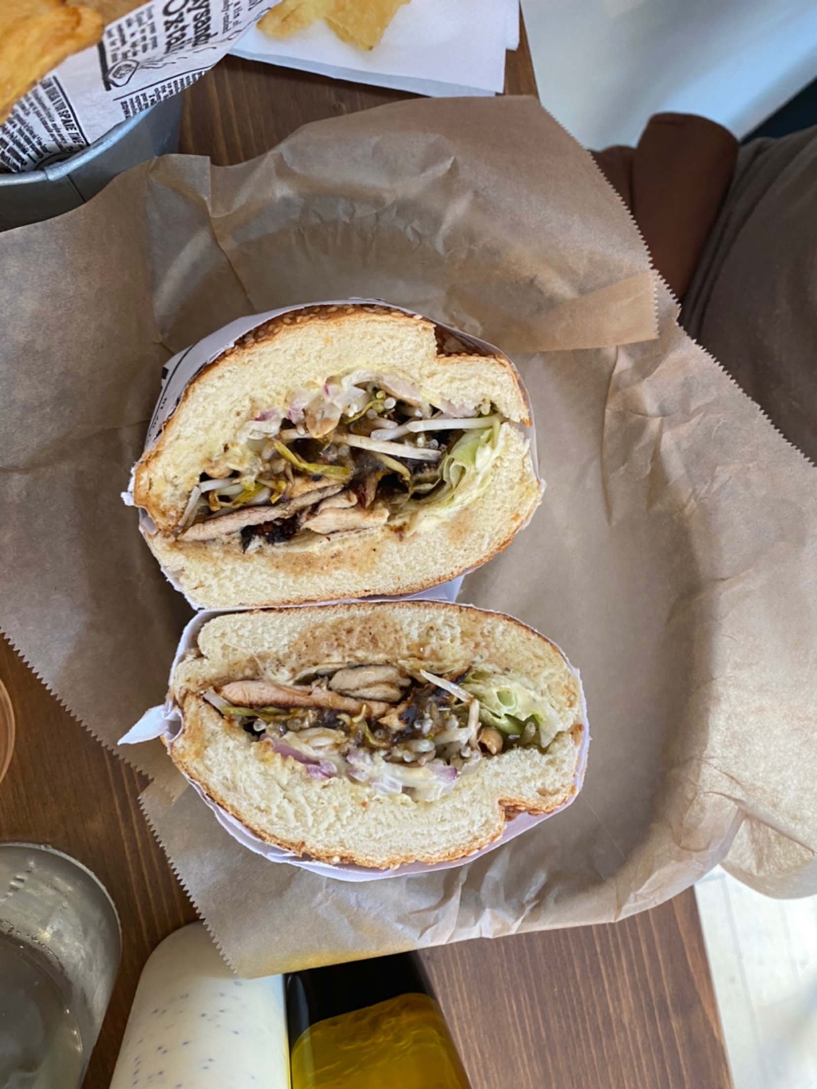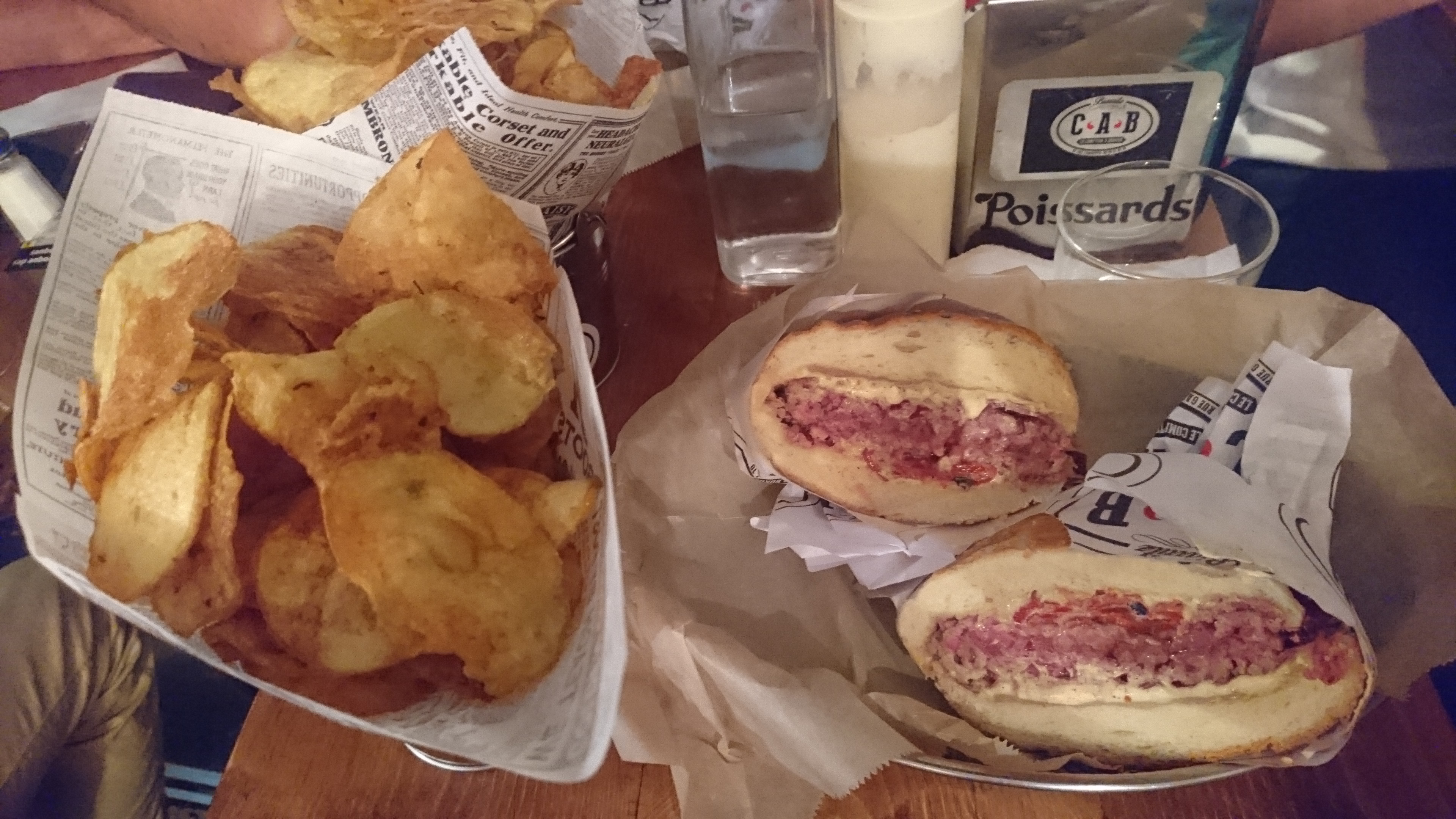 Entré un jour de pluie en janvier, dès l'ouverture du service du dîner. Personne n'est assis donc les hamburgers sont arrivés vite ! Il y avait le végétarien (peut le rendre végétalien sans fromage ni sauce) et le thaïlandais, délicieux ! Les chips ont été une surprise, car elles ressemblent plutôt à des chips, mais néanmoins très bonnes à partager à deux !