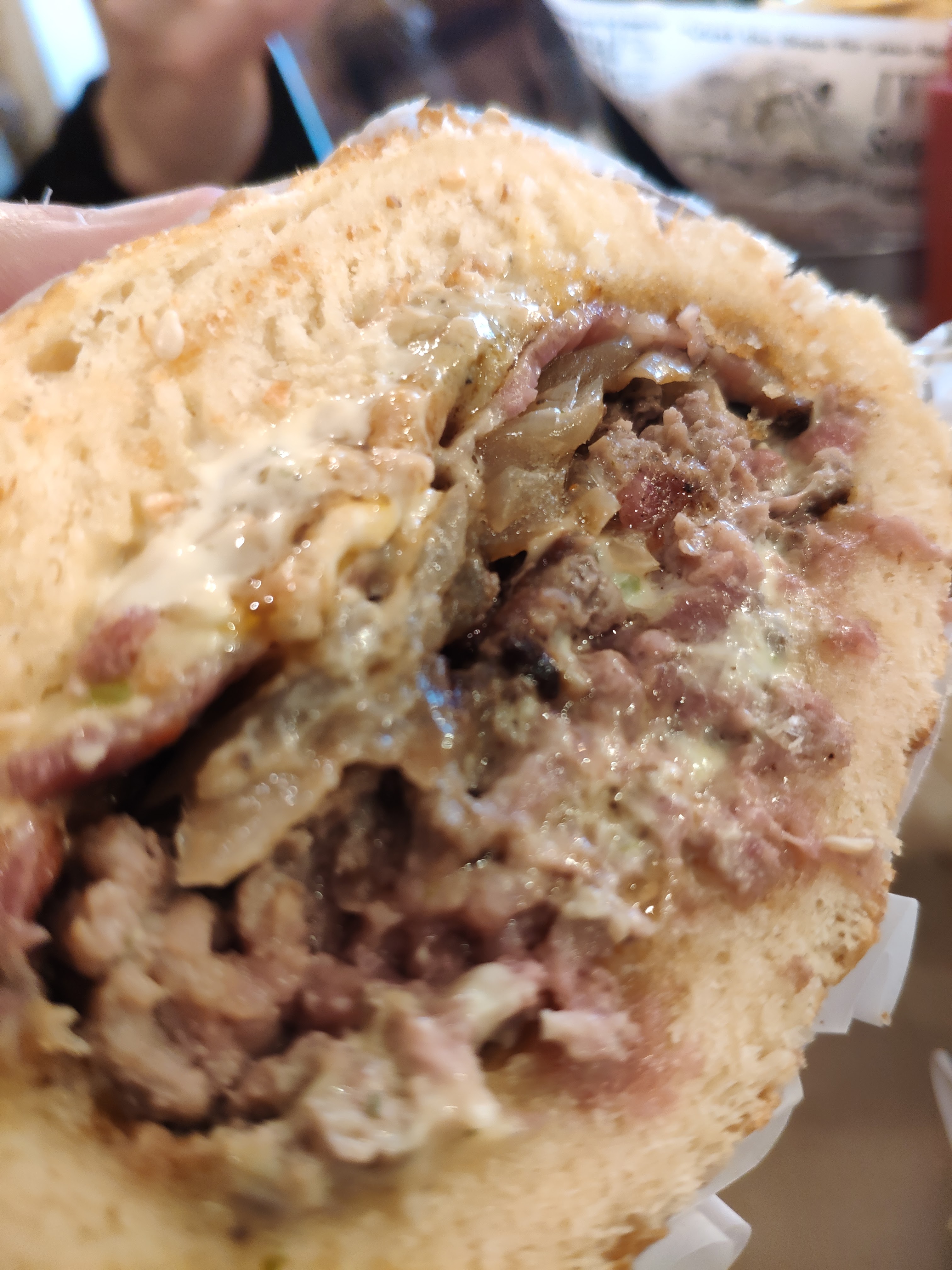 Trop de pain et pas du tout décent. Viande trop rouge et pas très savoureuse. Incroyable comment cet endroit a obtenu des notes aussi élevées. Choisissez un autre endroit. Les hamburgers de la cuisine californienne à 10 mètres avaient au moins l'air meilleurs. Je ne les ai pas essayés cependant.