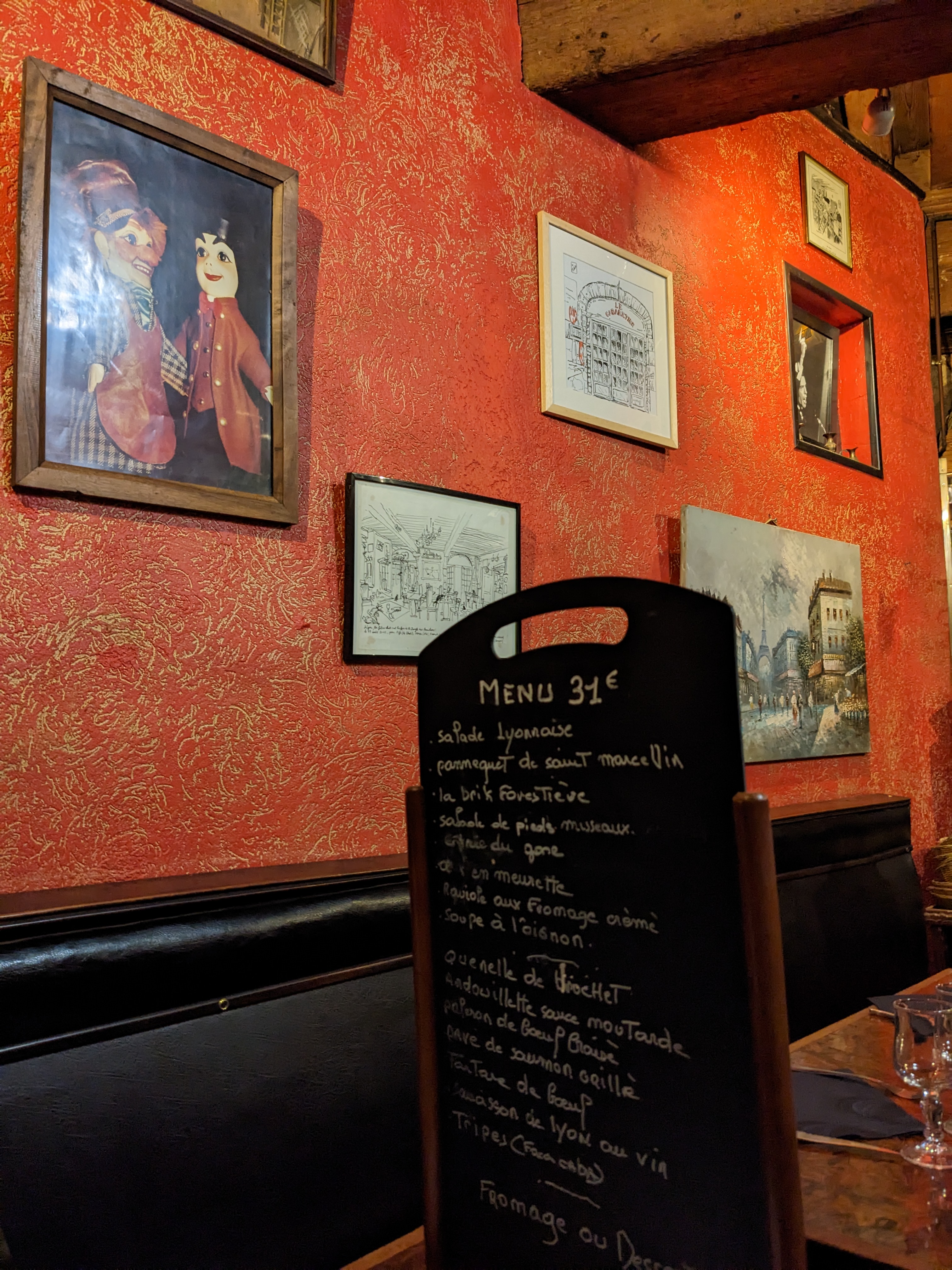 Bouchons lyonnais très typique, certes par sa décoration. Les plats sont bons, mais très attrape touriste, menu un peu trop cher. Passez votre chemin.