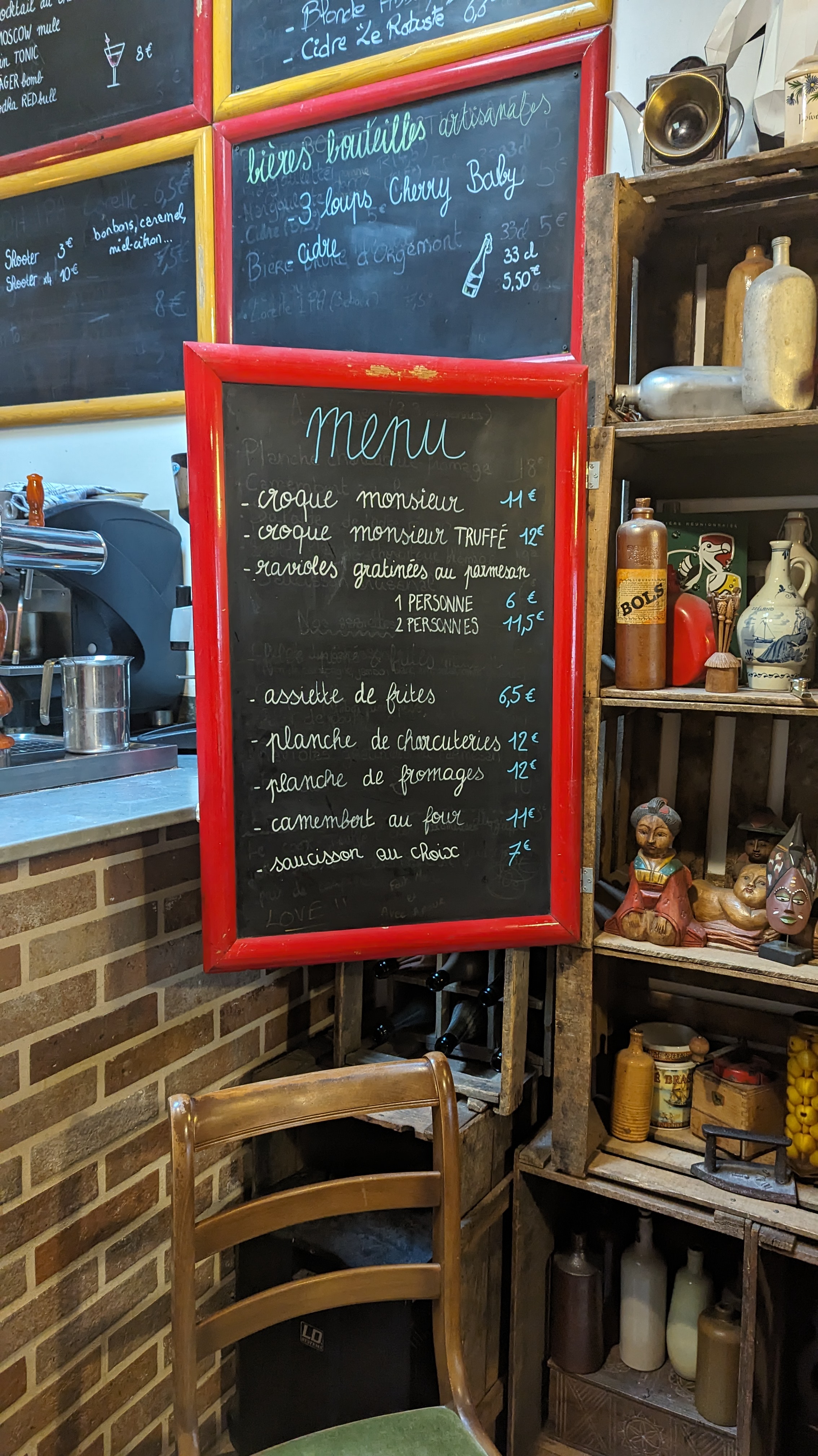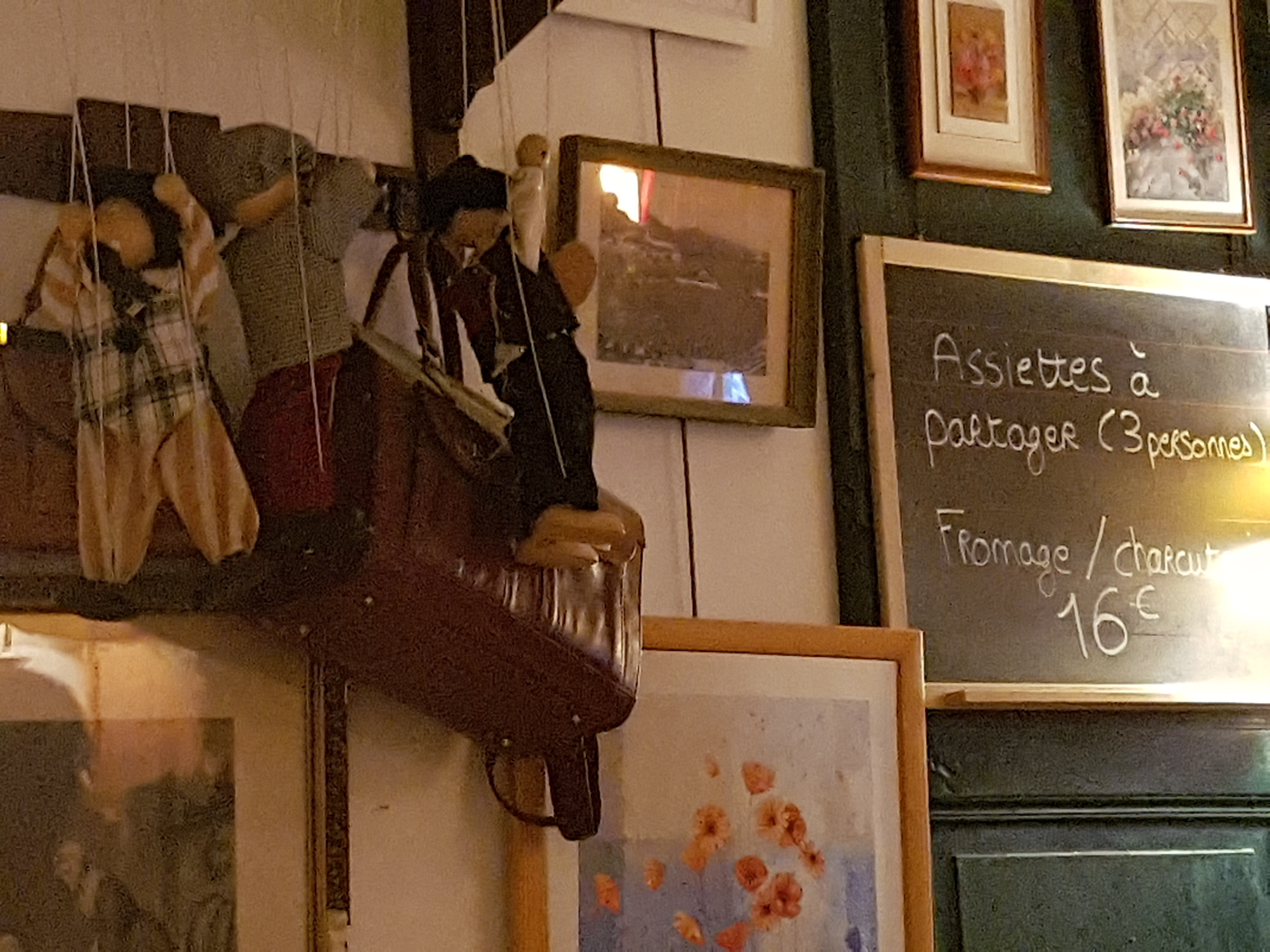 Endroit à la déco faite de bric et de broc qui lui donne une ambiance chaleureuse, un endroit où l'on s'y sent bien. Des jeux de société à disposition, sympa pour compléter la soirée. Petite carte efficace, avec de bons produits. Nous avons testé les planches, d'un bon rapport qualité-prix. Le pain est très bon; on vous dépose la baguette entière sur la table, à la bonne franquette ! :-) La planche de fromages est peut-être un peu light. Les frites sont bonnes, mais si elles étaient maison, ce serait merveilleux. Le camembert était plus fondu que rôti, mais très bon, pas piquant, et assaisonné de thym et de miel. Un autre plat avec du maroilles serait également une idée, on attend ce type de fromages étant donné le style qui rappelle celui d'un estaminet. Petit établissement, mieux vaut réserver. Une bonne adresse à tester !