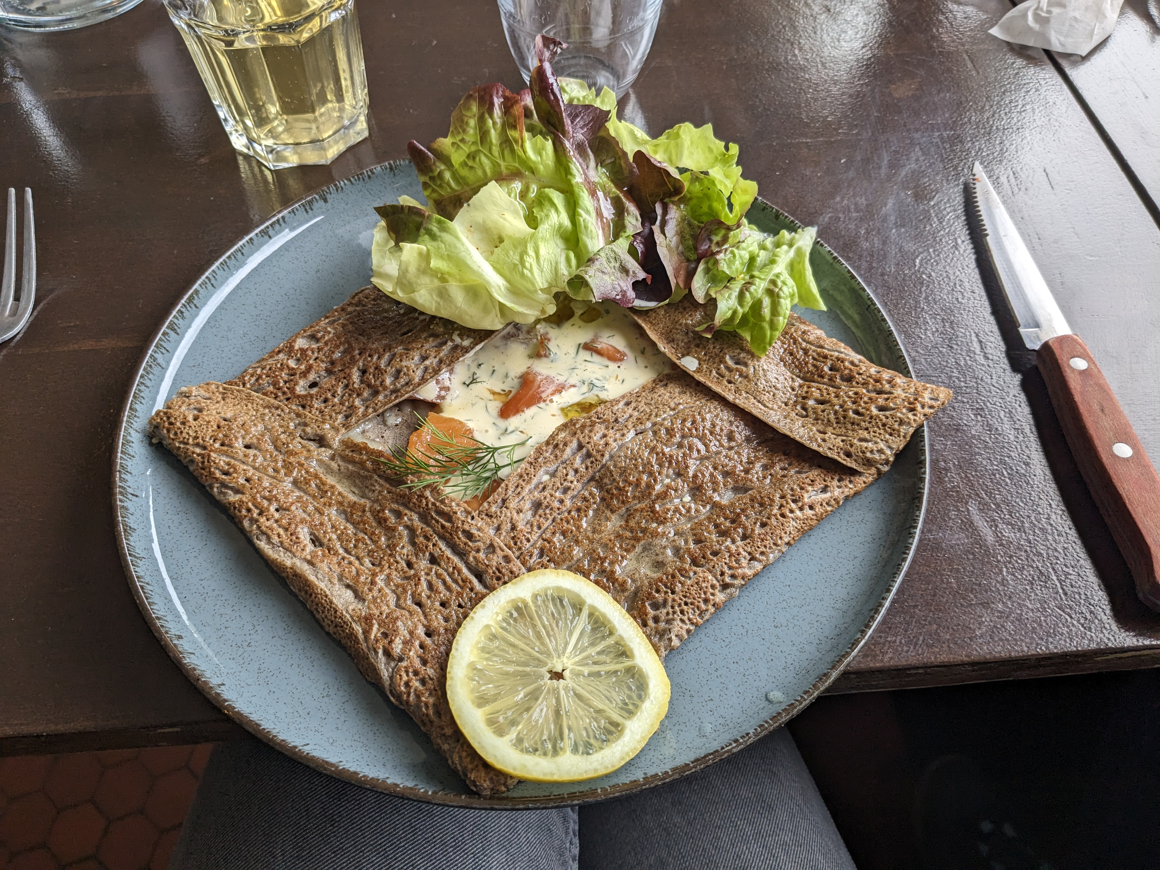 Nous avons été mangé pour la énième fois dans ce restaurant et découvert que la carte avait bien reduit.. Après ce n'est pas forcément un mal quand les ingrédients sont frais .. Nous avons pris la saumon vraiment très bonne et la chèvre comprenant une compoté d'oignons... Petit hic, celle-ci avait trop d'oignons et le chèvre manquait de caractère, dommage... Les crêpes plumes étaient très succulentes mais la crêpe caramel un peu en deçà... Malgré ses petits hic ce restaurant reste une très bonne adresse...