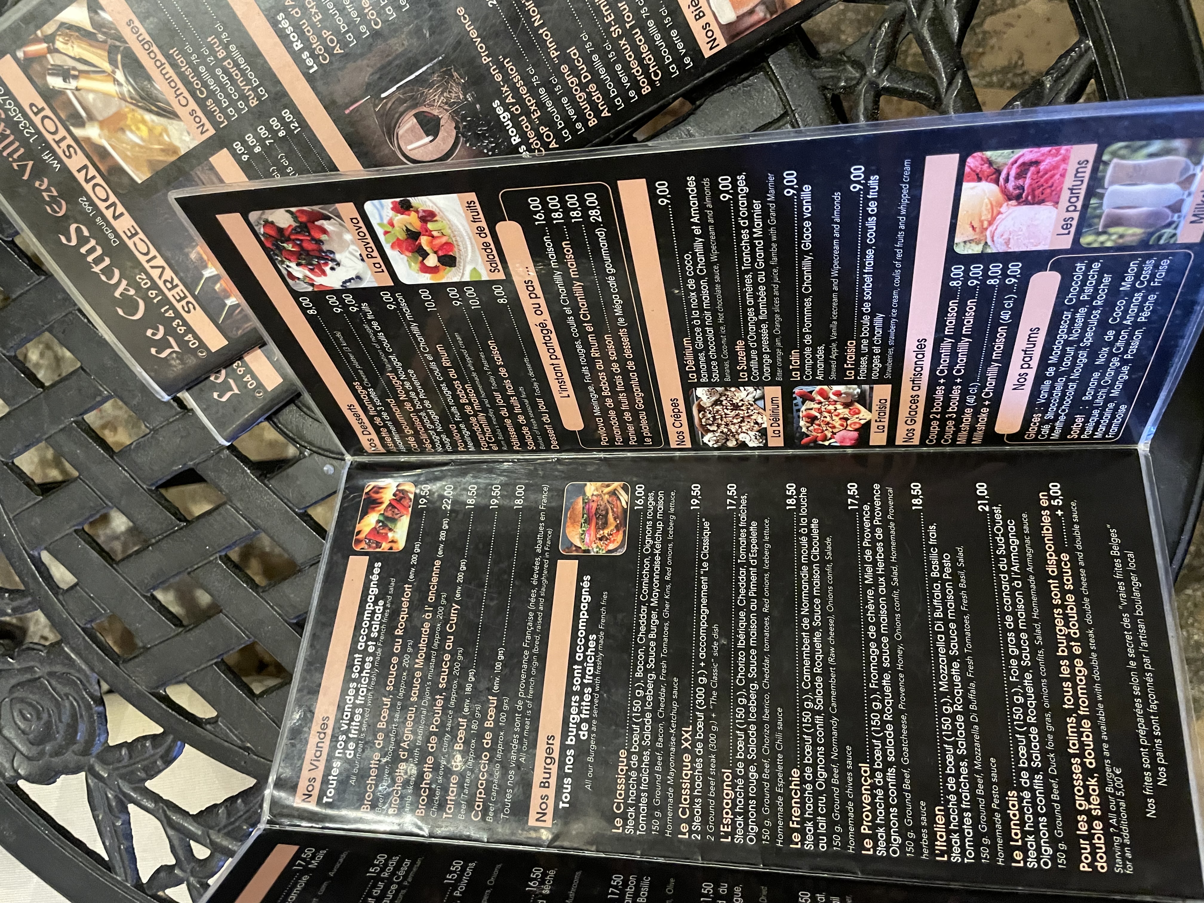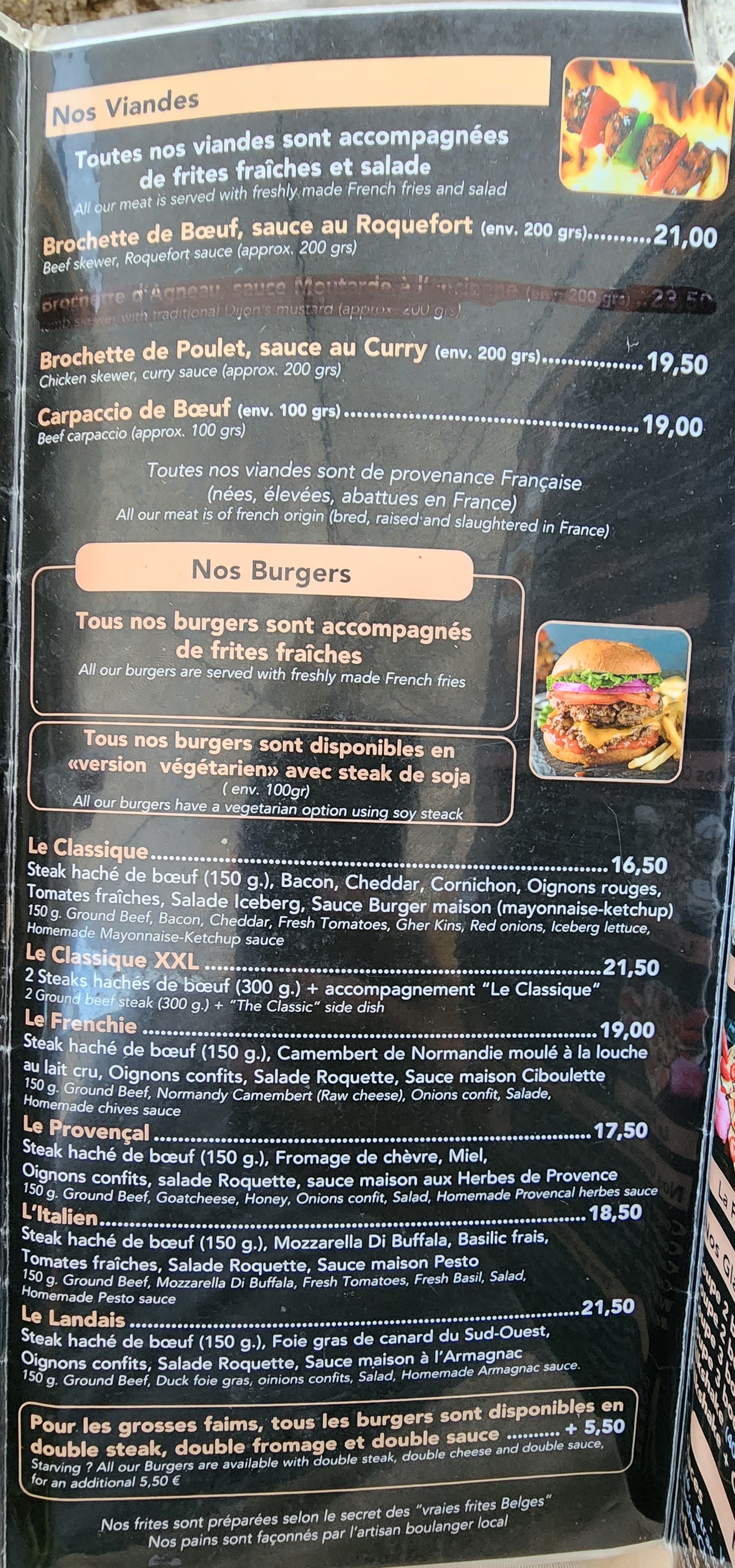 Super endroit à Eze avec un bon service et une bonne et bonne nourriture (Burguers et Brochette) avec du vin aussi. Il est bon de noter qu'ils ont un menu enfant. 😊 Prix raisonnable. Photos du MENU ci-jointes.