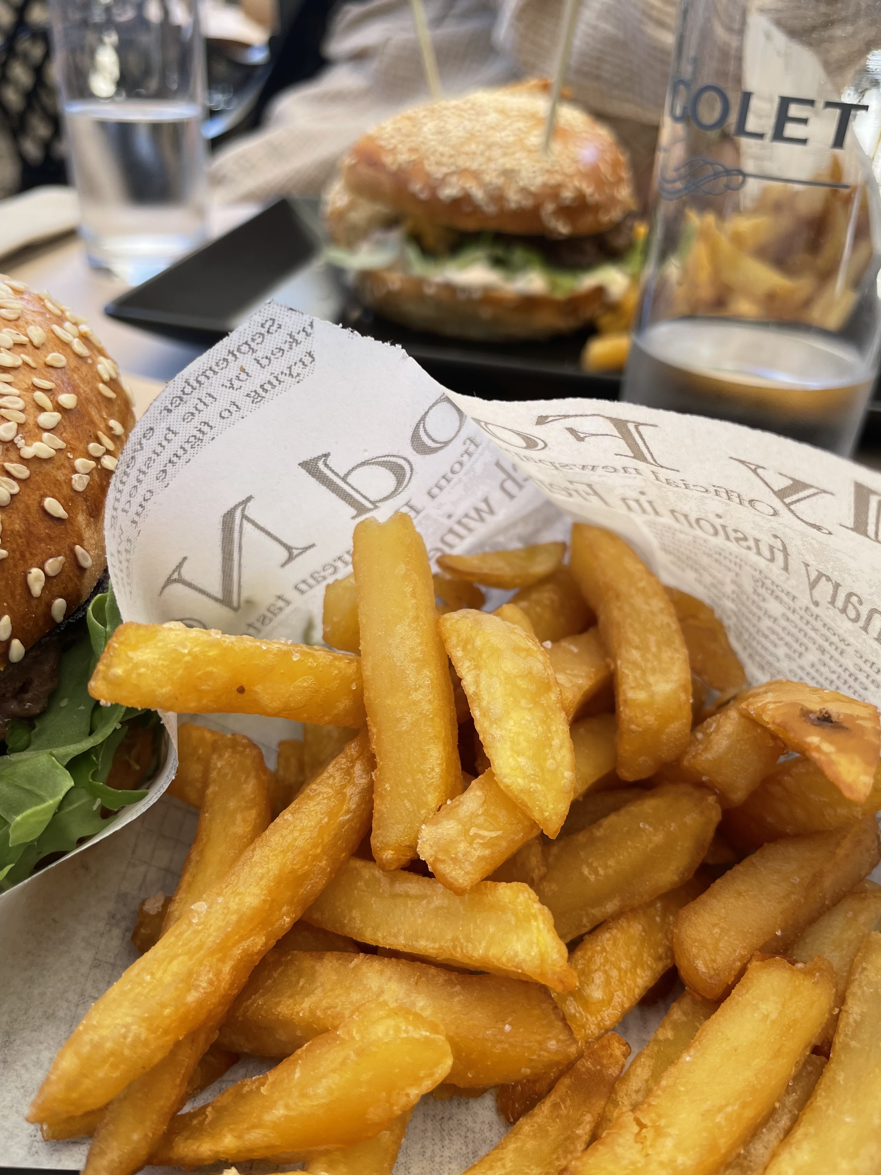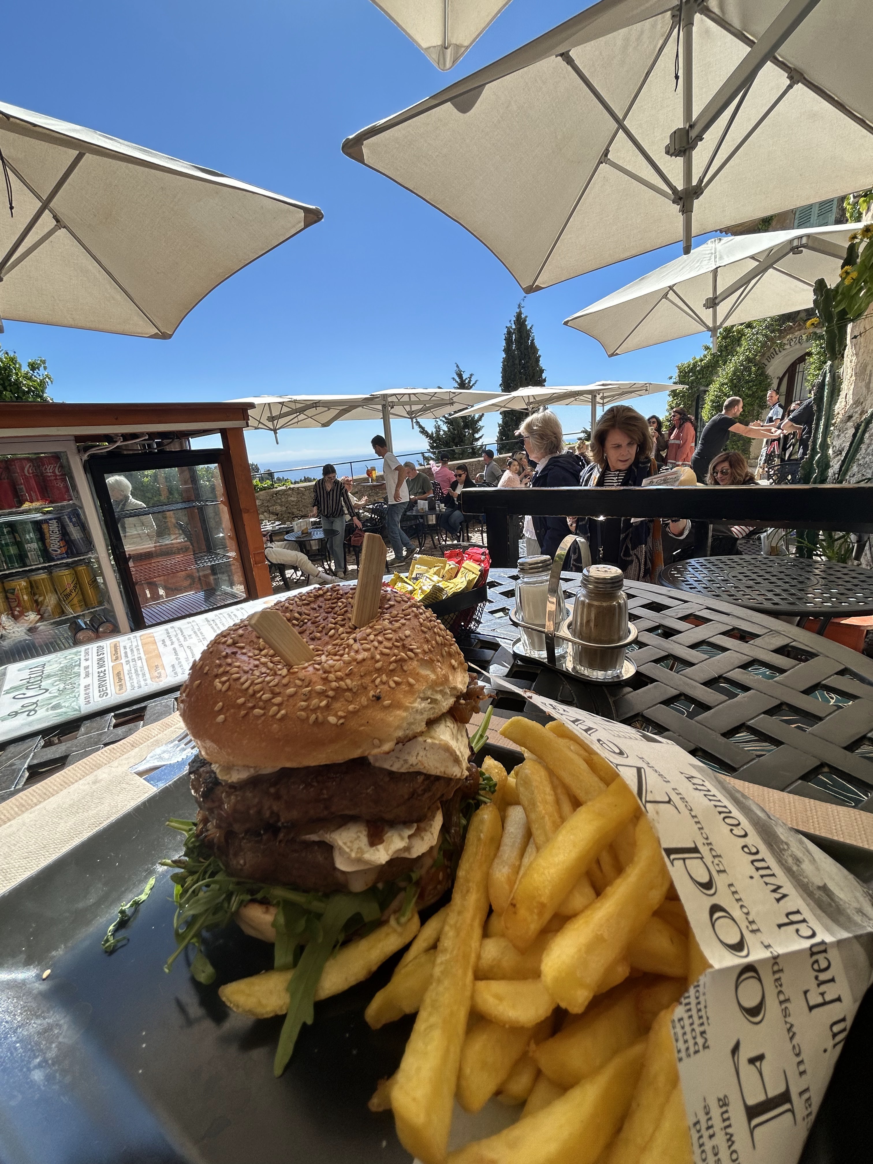 Arrêtez-vous ici pour déjeuner ou prendre un verre pendant que vous vous promenez dans Eze. J'ai commandé un burger nommé Le Frenchie. Comme j'avais très faim, j'ai ajouté une galette supplémentaire, que le serveur était heureux d'ajouter. Le hamburger était délicieux. Les oignons caramélisés, la roquette et le brie se complimentaient. La galette était savoureuse et cuite comme demandé - moyenne. Les frites étaient fraîchement cuites, croustillantes et épaisses. Je reviendrai!