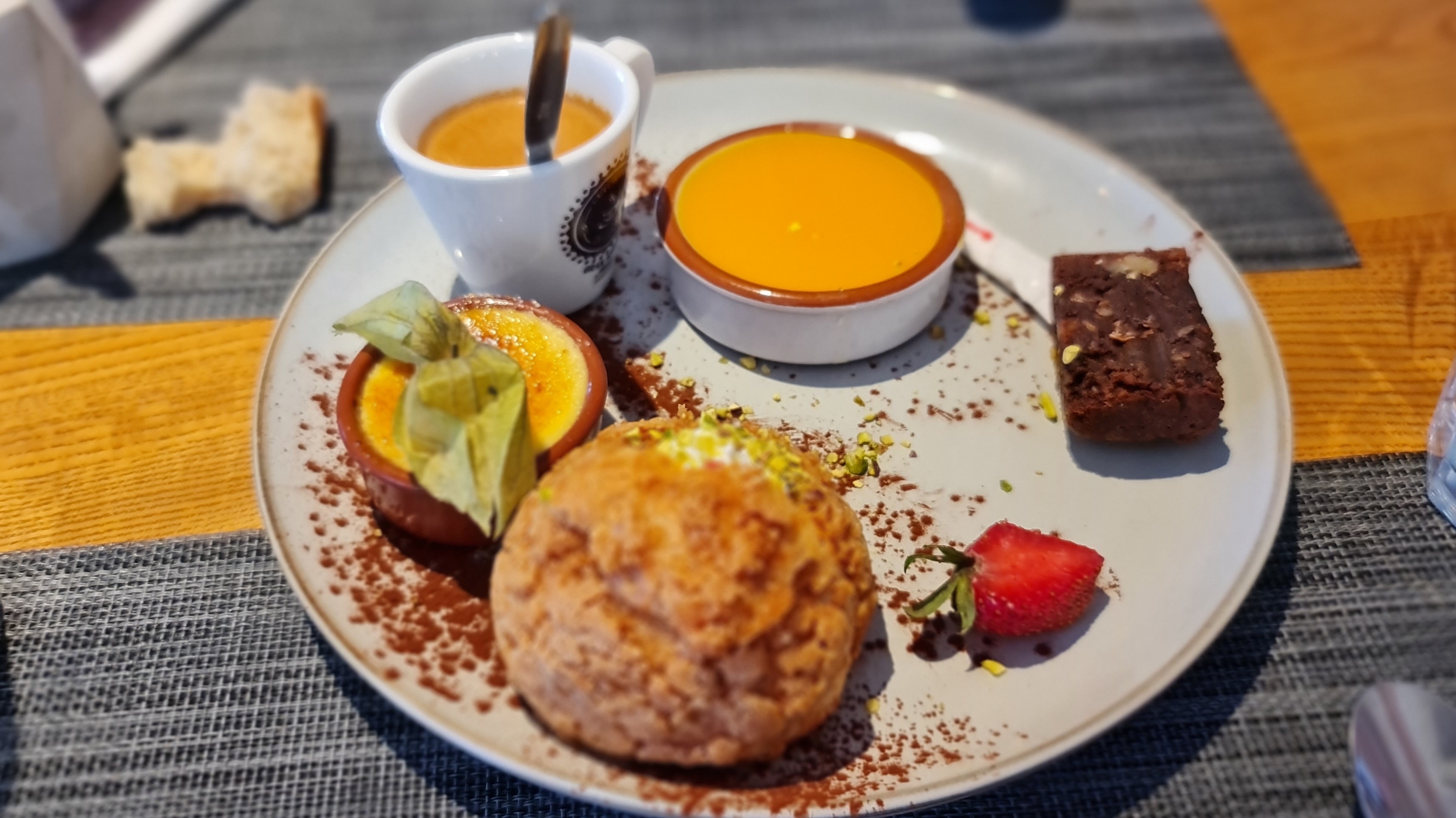 Cadre superbe ! Le plat et le dessert étaient bons et joliment présentés. La serveuse de notre table n'était pas très souriante mais le serveur en salle était très gentil et a apporté du pain et une petite rondelle séchée d'orange dans l'attente du plat à l'enfant de notre table.