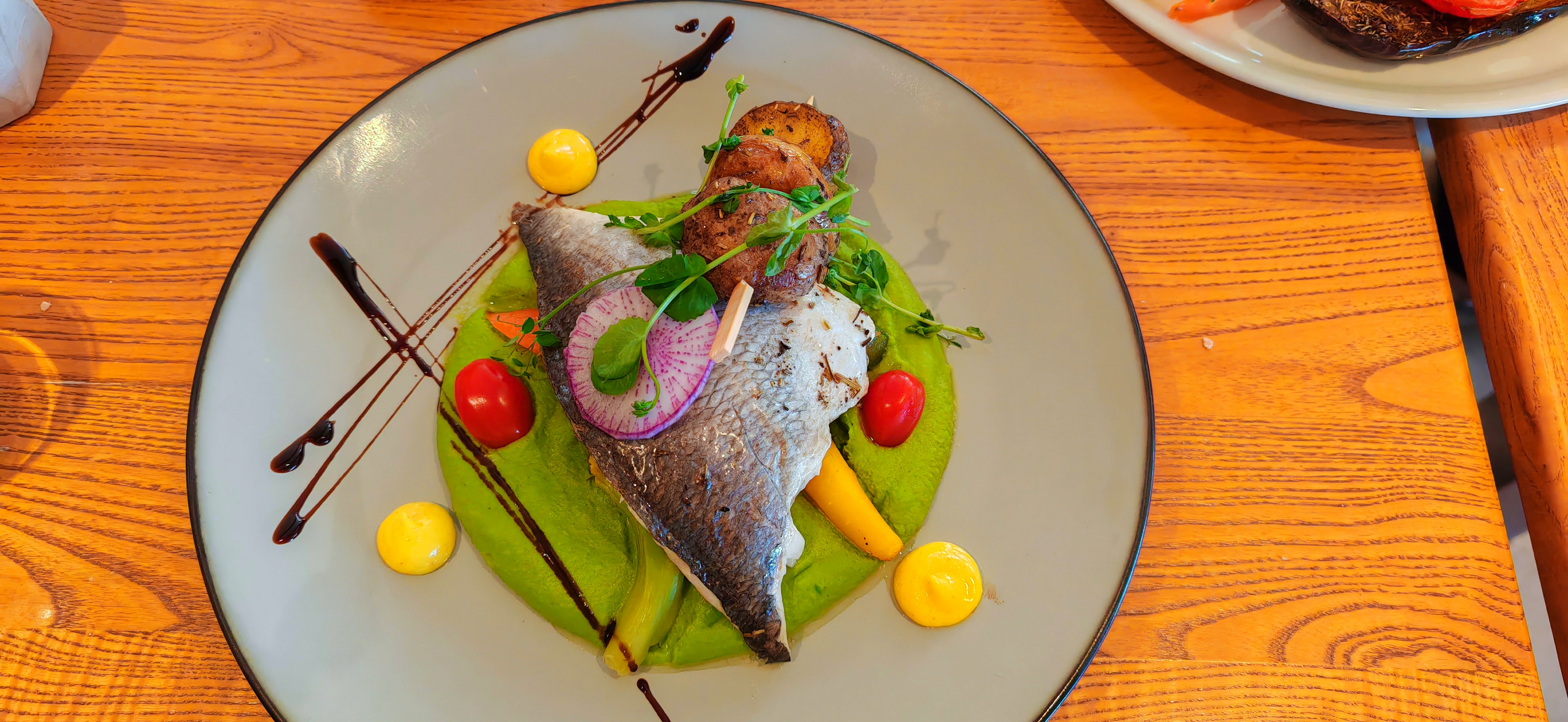 Un arrêt pendant nos visites dans le coin. J'ai pris une dorade avec un écrasé patates douces sauce cumin et des petits légumes grillés. Excellent et bien servi. Je reviendrai
