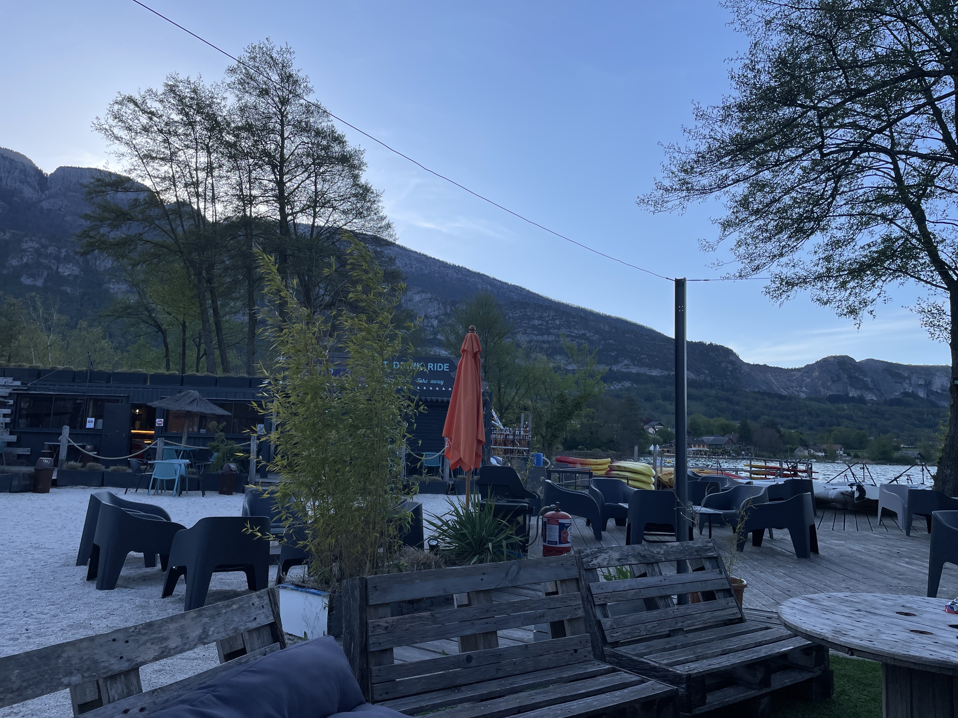 Un coin de paradis pour ceux qui aiment les sports nautiques... On peut vraiment tout essayer, du ski nautique au SUP, en passant par les kayaks, les voiliers, la plongée depuis le quai, les pédalos... dans le lac le plus propre d'Europe 😃 Le tout dans un contexte de détente maximale, sièges libres, service à table « basique » mais efficace. La structure est gérée par un personnel jeune et très gentil, la disponibilité est définitivement un plus ! Les chiens sont les bienvenus et choyés. Cuisine bonne et variée, peut-être un peu chère mais... nous sommes au bord du lac d'Annecy. Parking pratique mais il se remplit vite et la police ne fait pas de compromis, mieux vaut arriver tôt le matin. En théorie vous ne pouvez pas passer la nuit avec le camping-car, mais notre van passe inaperçu 😉 (demandez toujours en premier)