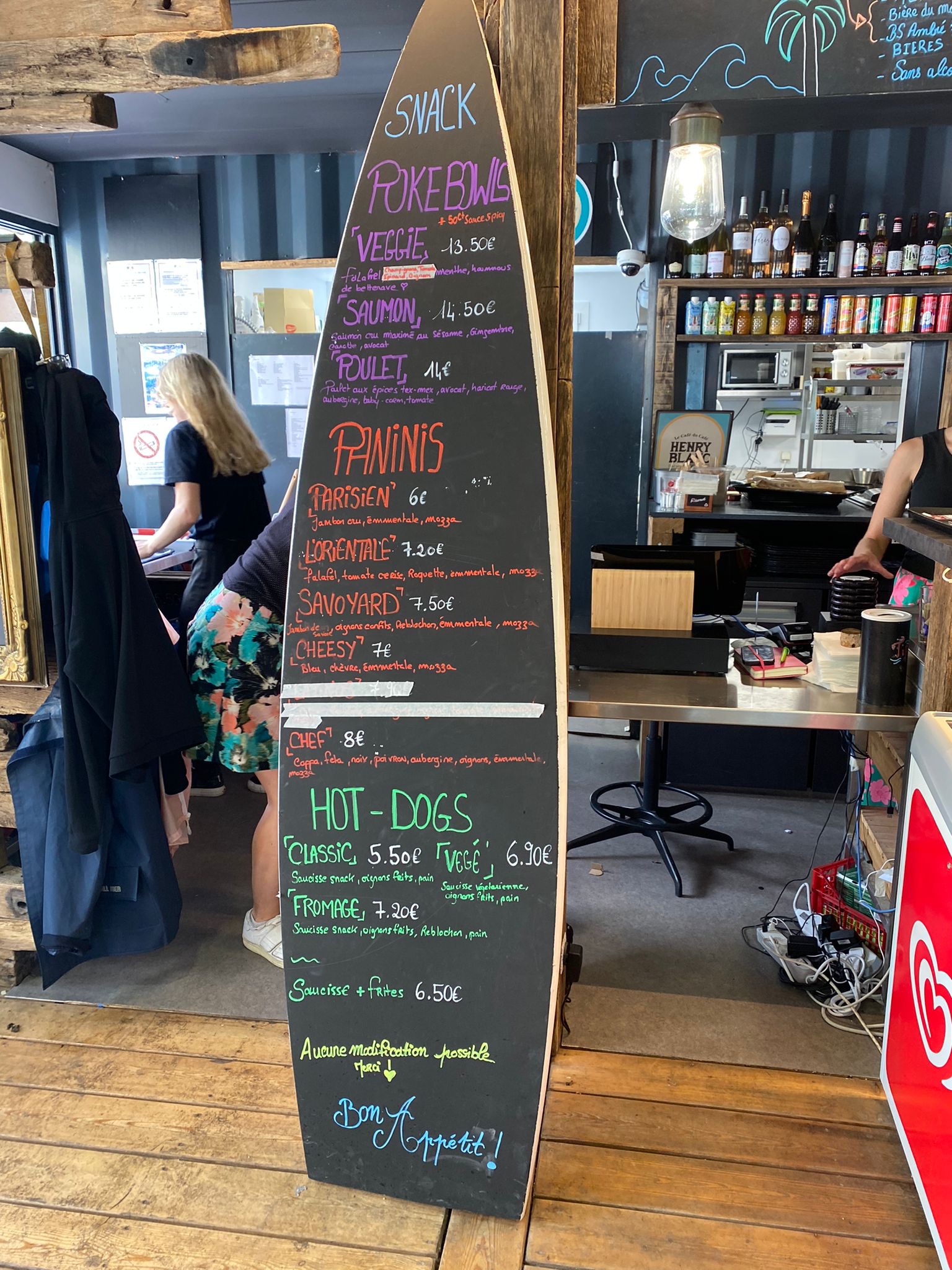 Une super ambiance avec une des plus belles vues du Lac D'Annecy. Très bon accueil et de belles soirées musicales. Les plats proposés sont excellents, préparés avec des produits frais. Le shop permet de trouver de magnifiques ponchos ou chaussettes entre autre. L'équipe est top et on y trouve tout pour se faire plaisir en glisse. Dépaysement assuré y compris quand on habite à côté, on a vraiment l'impression d'être en vacances