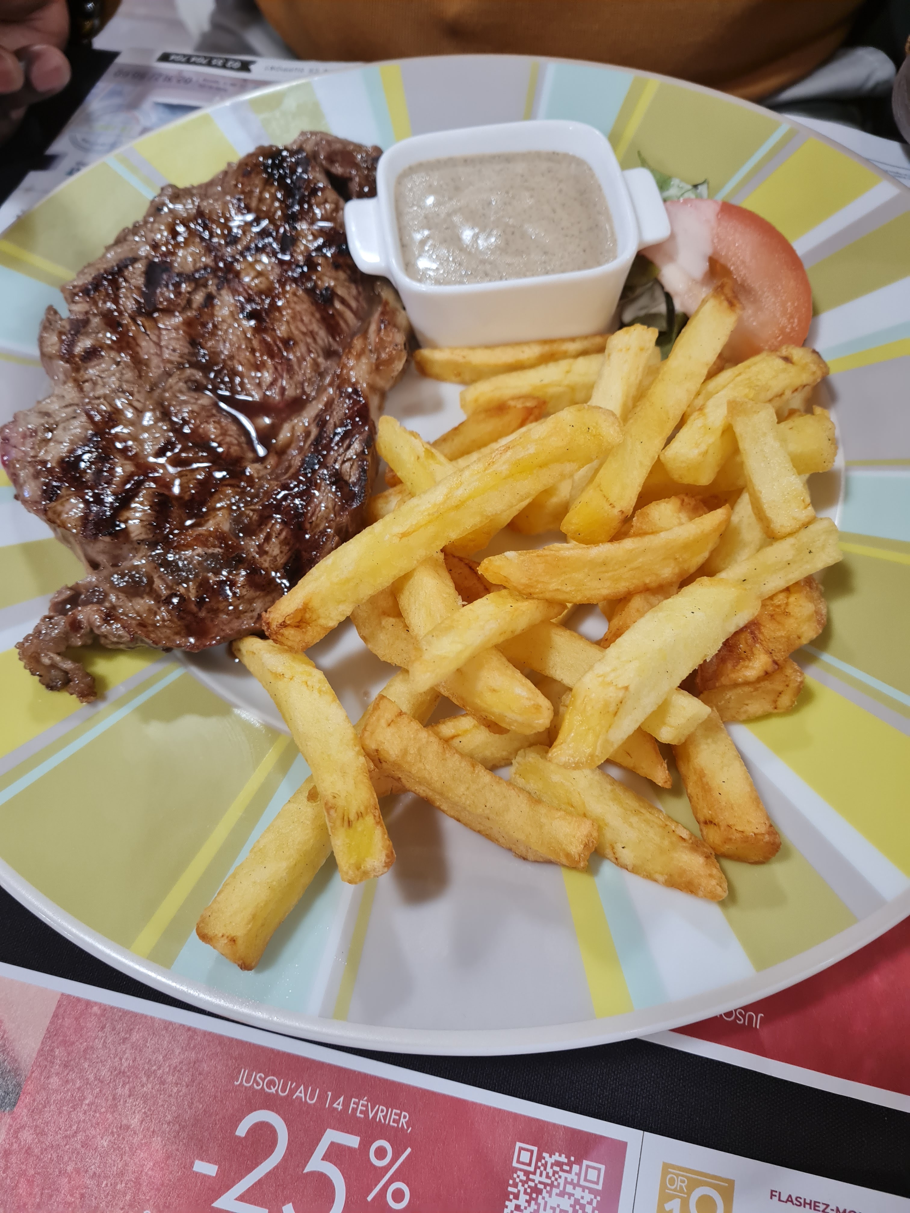 Cadre sympa je suis venu manger avec ma copine nous avons pris 1 faux filet et une entrecôte frite la viande etait très tendre et les frites maison très bonne