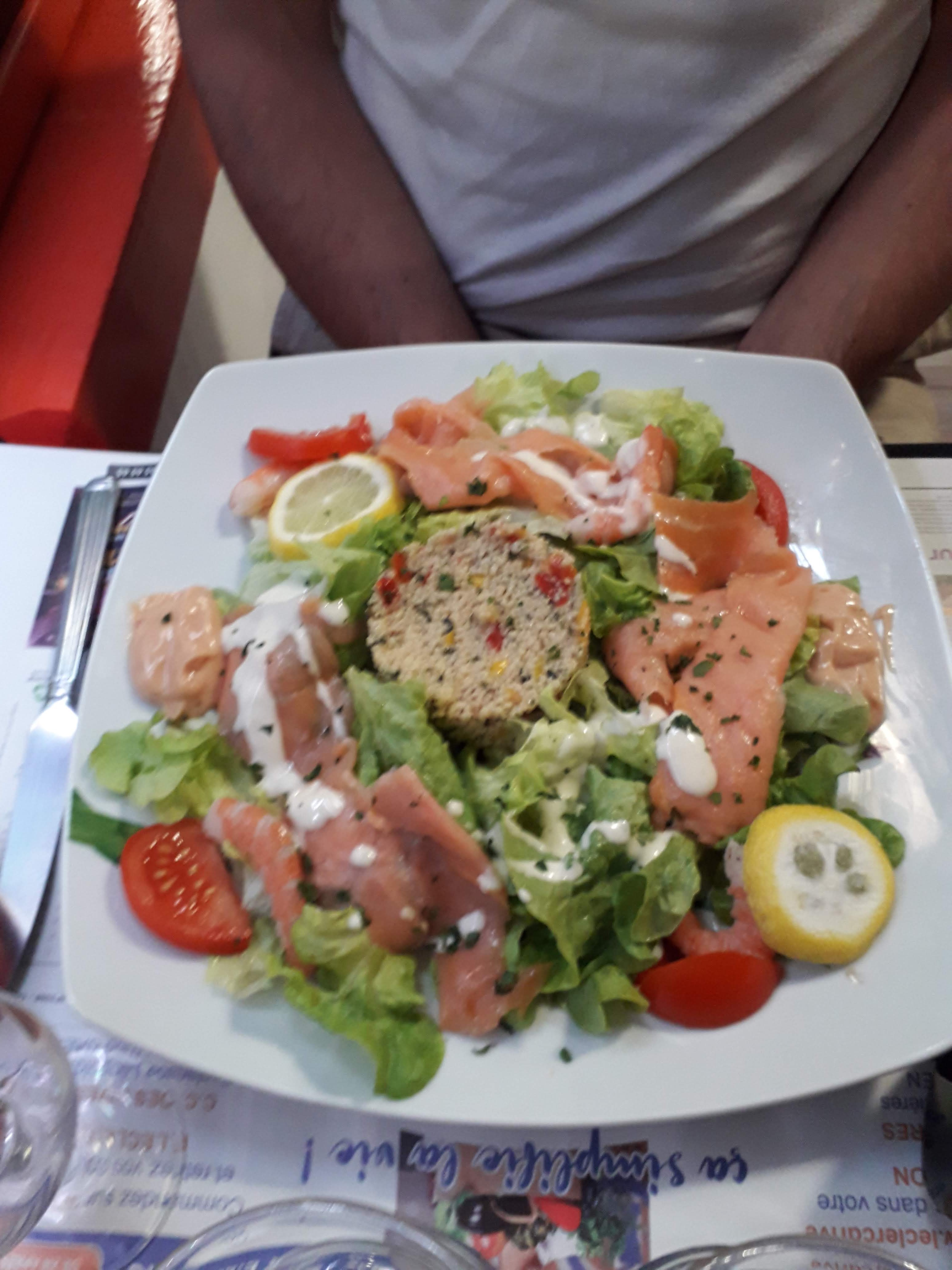 Première et dernière fois. Très déçu Nous avons profité de nos vacances pour découvrir cet établissement qui au premier abord avait l'air sympa. Accueil sympathique, tout comme le service( à condition de ne pas trop poser de questions) car bien souvent sa réponse est : je ne sais pas , par exemple la région d'un vin en question ou si le poisson était desarêtés. Heureusement que sa gentillesse et sa sympathie était présente pour rattraper le tout. Nous commençons le repas, un peu déçus au vu du buffet un peu dégarni autant salé que sucré. Nous prenons donc une entrée à la carte. Tout ce passe bien. Le pire fut ensuite. Mr prends une entrecôte, là dessus aucun soucis autant pour le goût que la cuisson. Mon fils prend dans son menu un burger demandé saignant. Il arrive bien cuit et donc ayant horreur de la cuisson semelle ne le mange pas. Concernant mon filet de saumon grillé, d'une part trop cuit puis ça a été un défilé d'arête. Elles étaient tellement grandes que je me demande comme ais-ce possible de passer à coter ??? Je fais part au serveur ainsi qu Au moment de payer de toutes ces remarques et leurs seules réponses à été :désolé Au final payer un peu moins de 70 euros pour ce type de prestations et repartir avec un enfant de 6 ans n'ayant même pas manger, cela laisse un goût amer surtout lors de nos vacances !